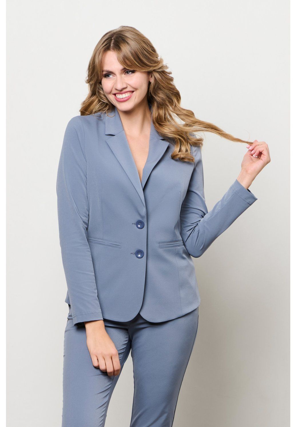 Elegantní dámské sako v jemném světle modrém odstínu je ideální volbou pro ženy, které hledají spojení pohodlí a nadčasového stylu. Má klasický vypasovaný střih, zapínání na dva knoflíky a decentní klopy, díky kterým působí upraveně a velmi žensky. Skvěle se hodí do kanceláře, na schůzky i na slavnostnější příležitosti, ale snadno ho zkombinujete i s ležérnějšími kousky pro moderní městský outfit. Univerzální a elegantní model, který dodá Vašemu šatníku svěží a sofistikovaný vzhled.