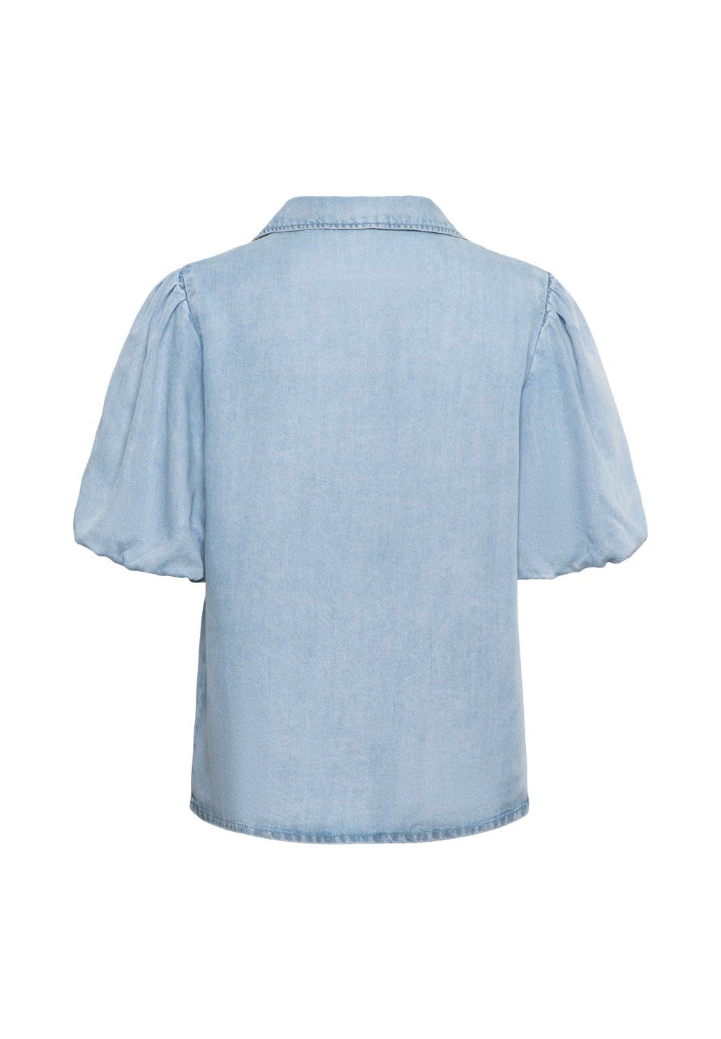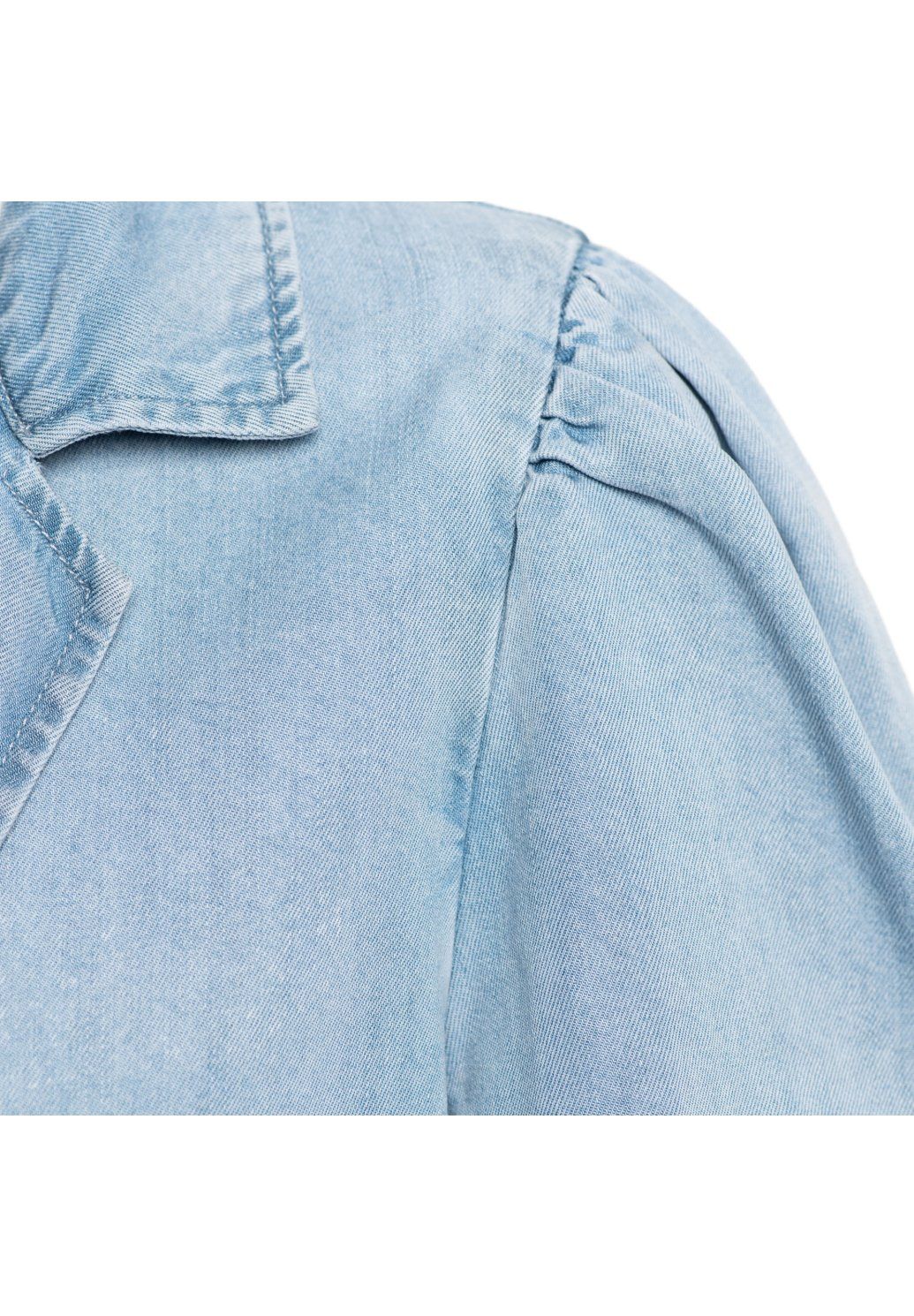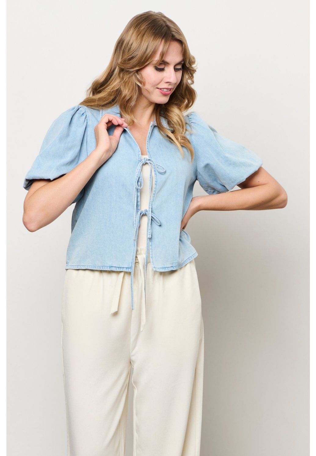 Lehké dámské sako v denimovém vzhledu, které dodá vašemu outfitu svěží a moderní nádech. Má volnější střih, krátké nabírané rukávy a zapínání na stylové mašličky, které působí jemně a ženskě. Díky příjemnému materiálu se skvěle nosí a snadno ho zkombinujete jak s kalhotami, tak se sukní – ideální kousek pro každodenní i ležérně elegantní outfit.