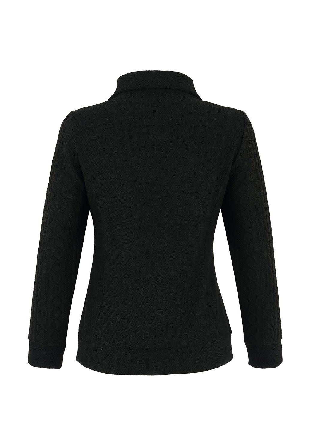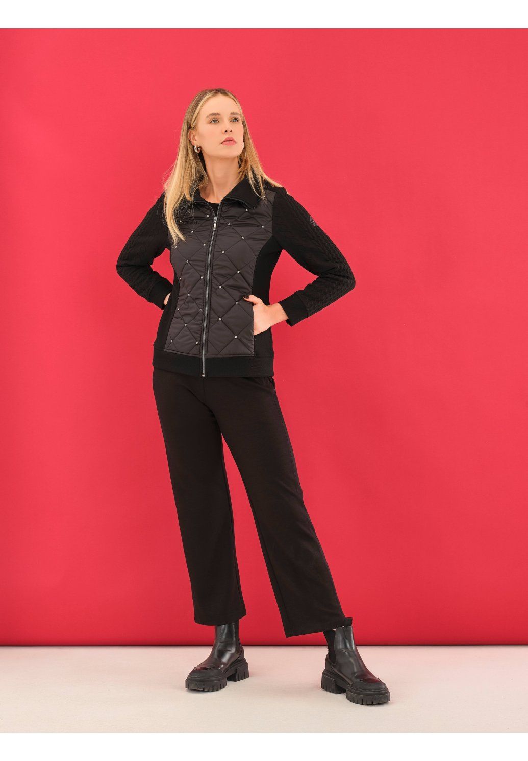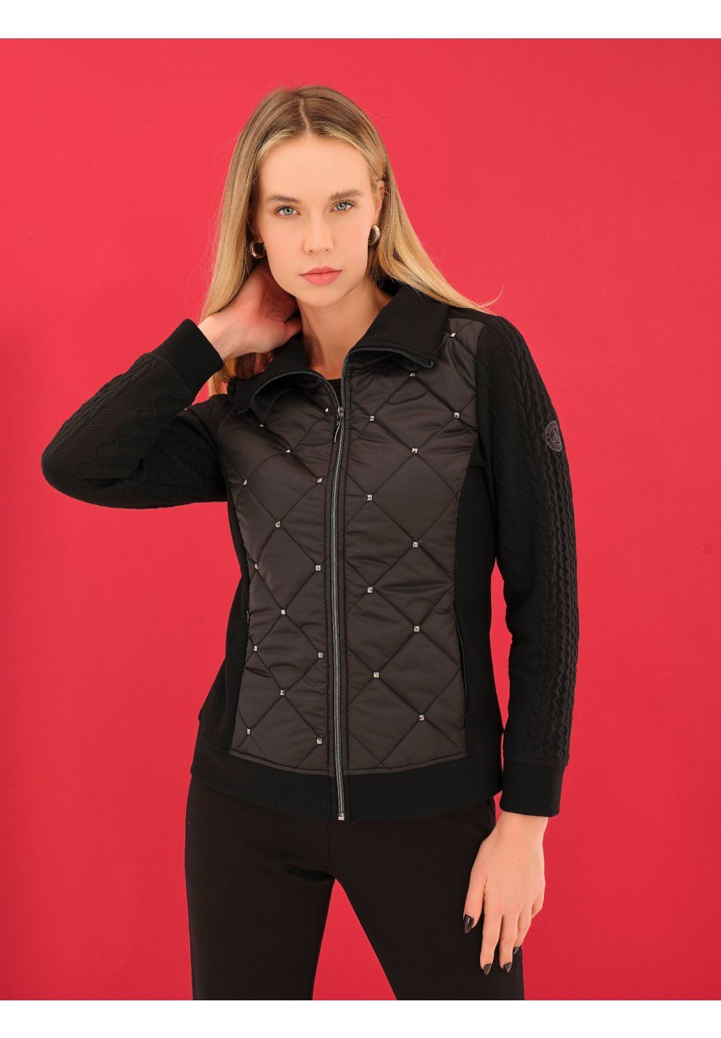 Stylová dámská bunda v elegantní černé barvě je ideálním kouskem pro moderní a sebevědomý look. Kombinuje prošívanou přední část s jemnými kovovými detaily a pružné rukávy, které zajišťují maximální pohodlí při nošení. Má vyšší stojáček a zapínání na zip, díky čemuž skvěle chrání před chladem. Perfektní volba pro každodenní nošení i městský styl – snadno ji zkombinujete s džínami i elegantnějším outfitem.
