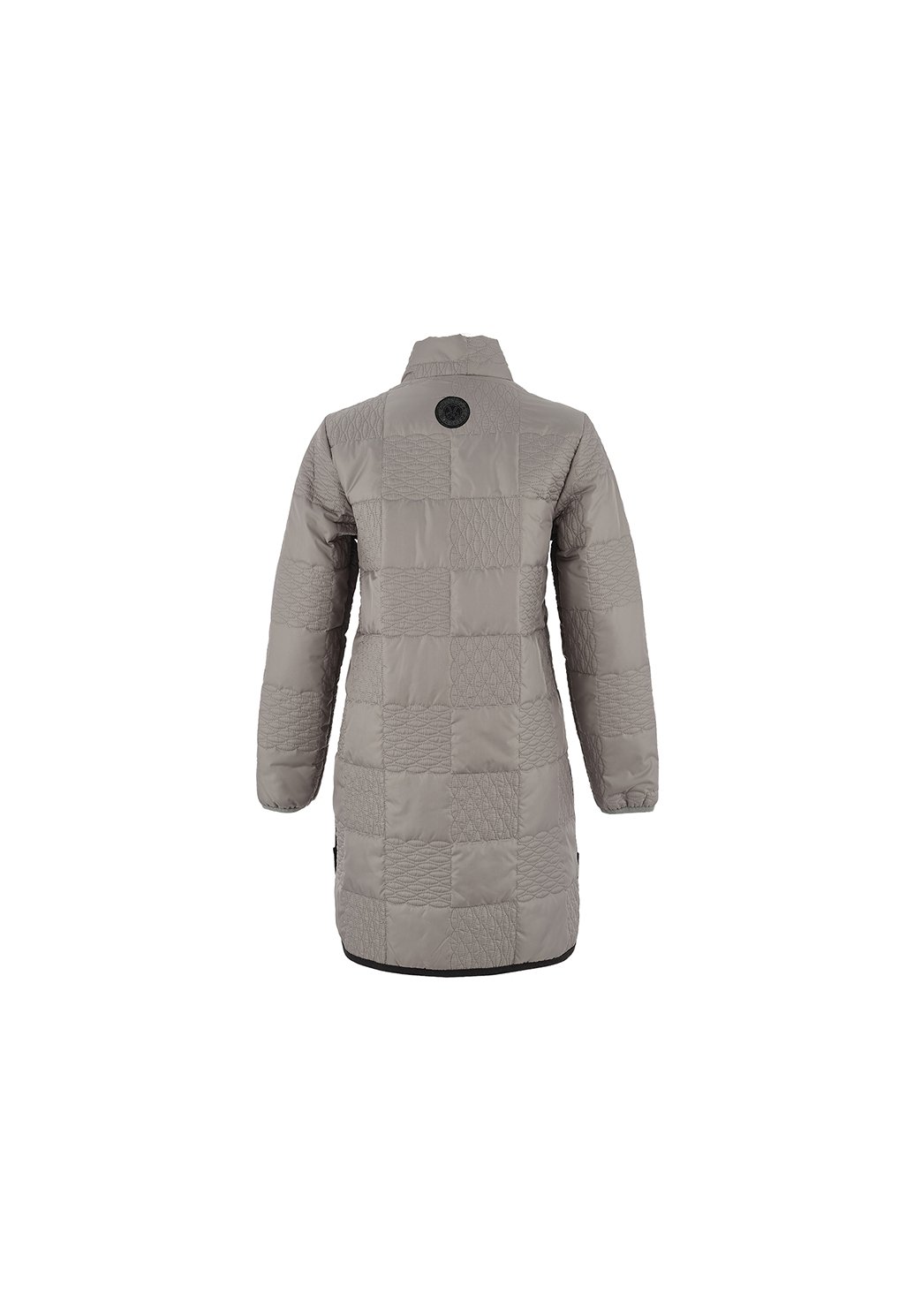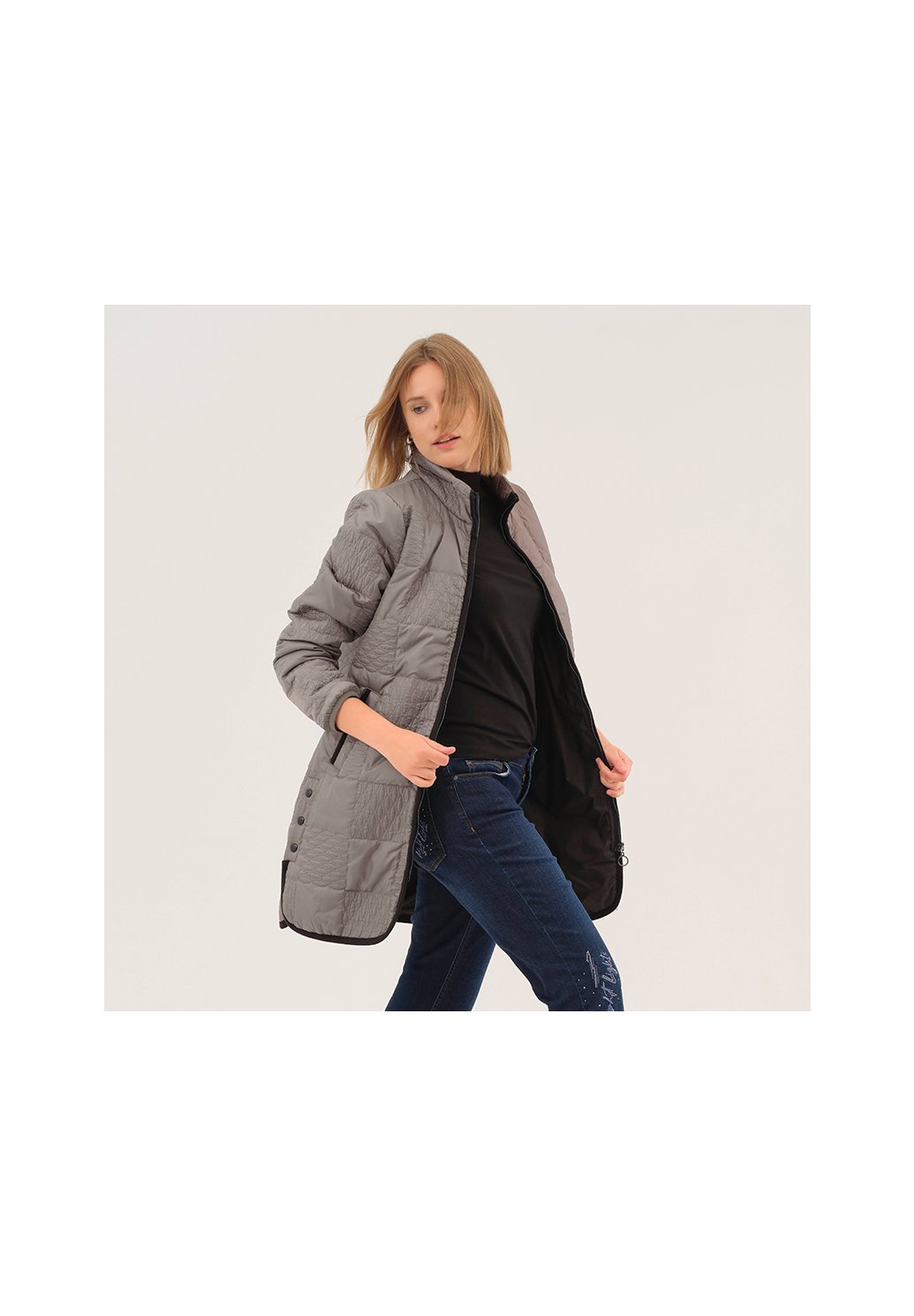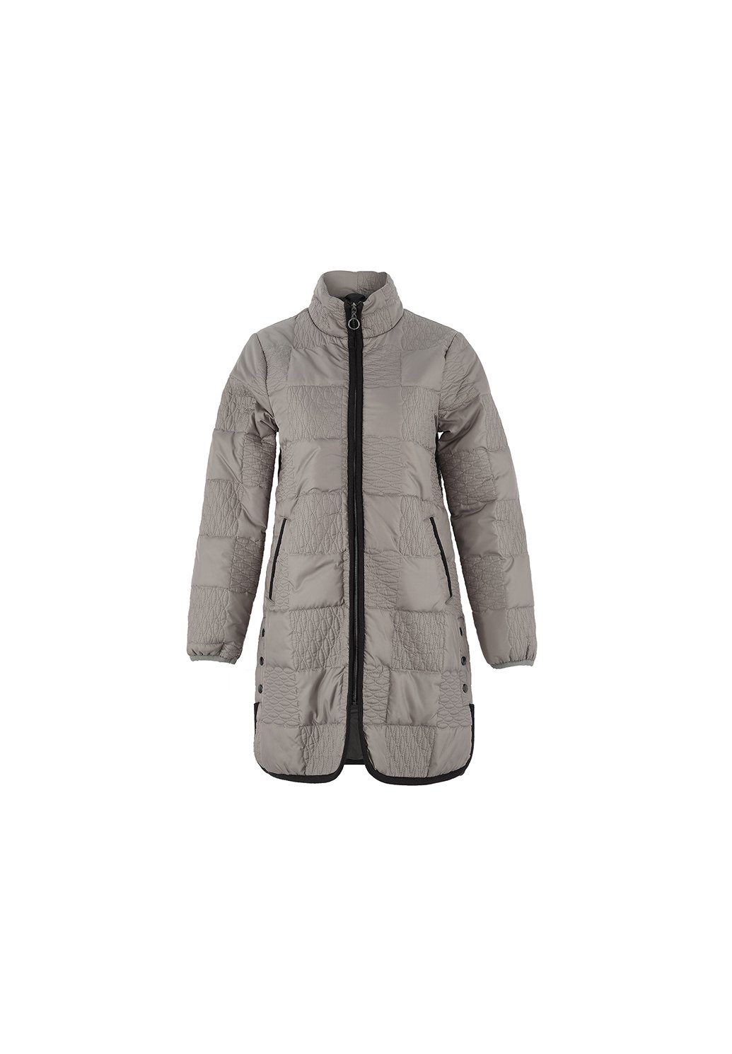 Dámská lehká prošívaná bunda je ideální volbou na přechodné období. Dlouhý střih přibližně do poloviny stehen, stojáček bez kapuce a zapínání na zip vytvářejí elegantní a nadčasový vzhled. Praktické kapsy na bocích a zaoblené zakončení se třemi patentkami umožňují nosit bundu i volně rozepnutou. Černé lemování na rukávech, zapínání i spodním okraji dodává modelu moderní kontrastní detail. Dostupná v barvě taupe.