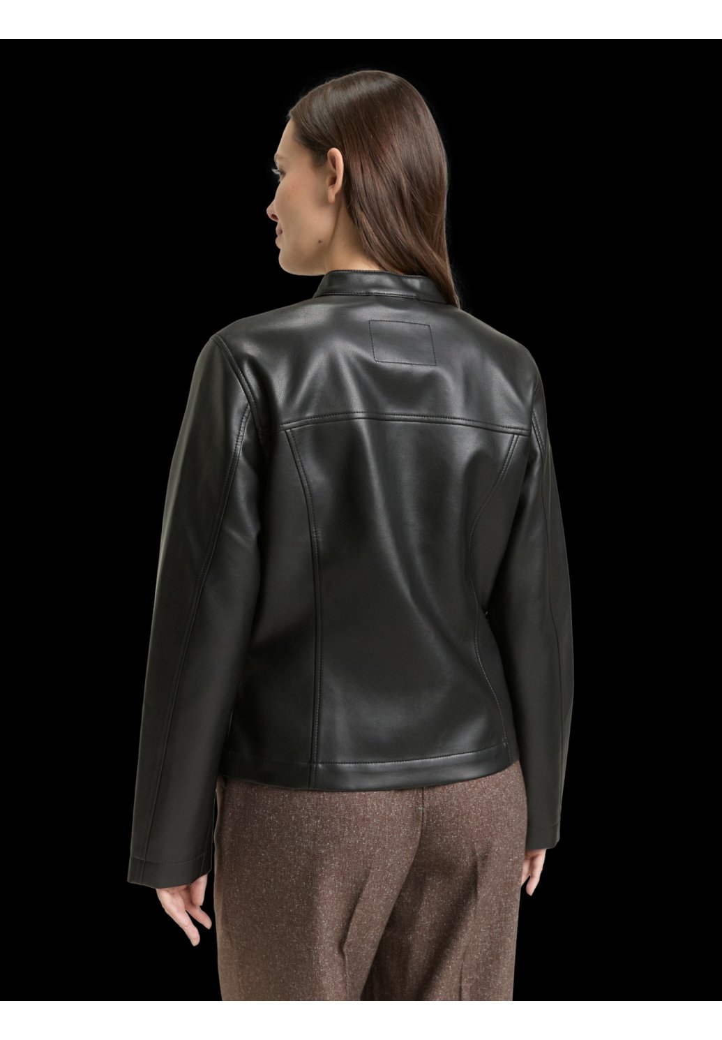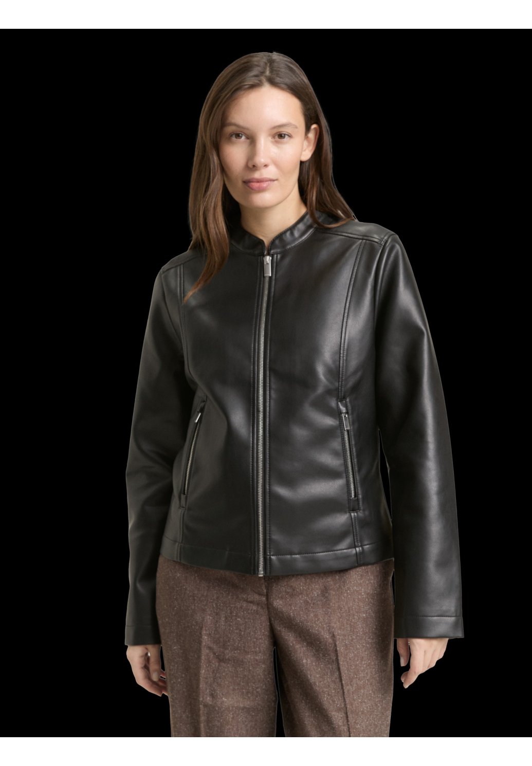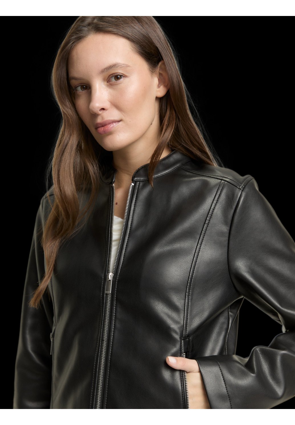 Dámská bunda v elegantním, minimalistickém designu, která skvěle doplní městský i lehce formální outfit. Je vyrobena z hladkého materiálu s koženým vzhledem, který působí moderně a nadčasově. Bunda má zapínání na zip po celé délce, jemný stojáček u krku a praktické boční kapsy na zip. Tvarovaný střih zvýrazňuje siluetu a zajišťuje pohodlné nošení. Ideální volba pro přechodné období, do práce i na každodenní nošení ve městě.