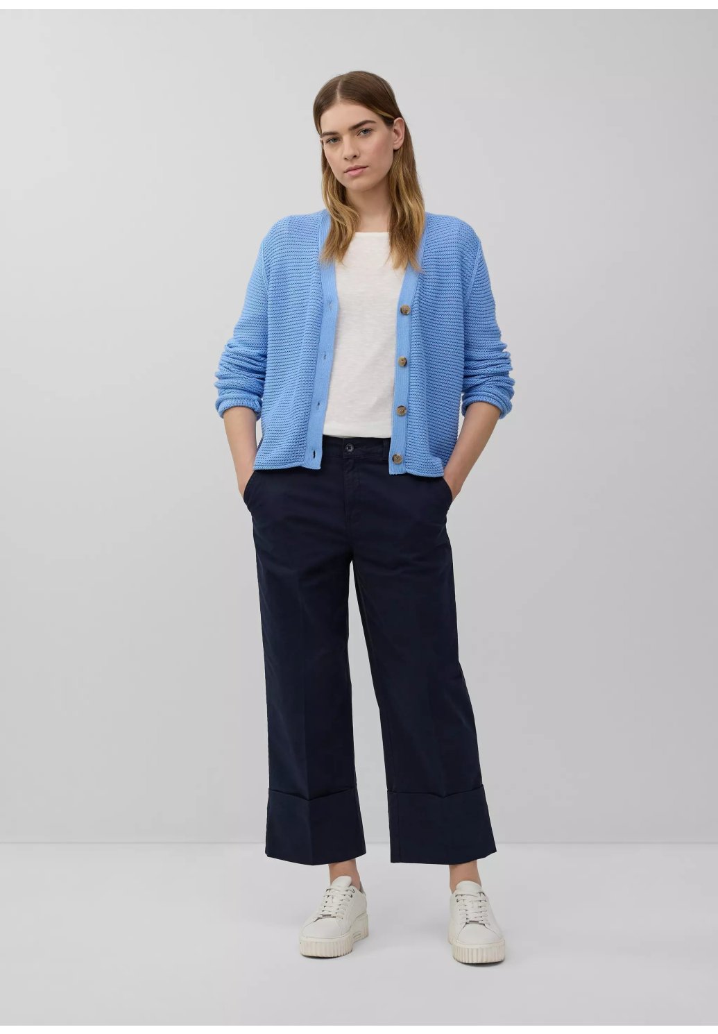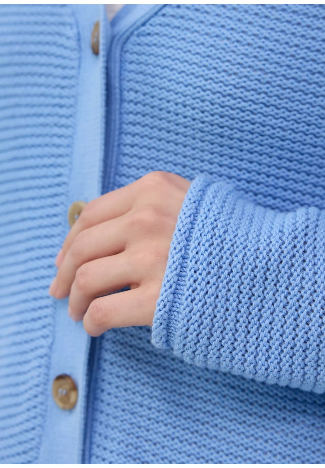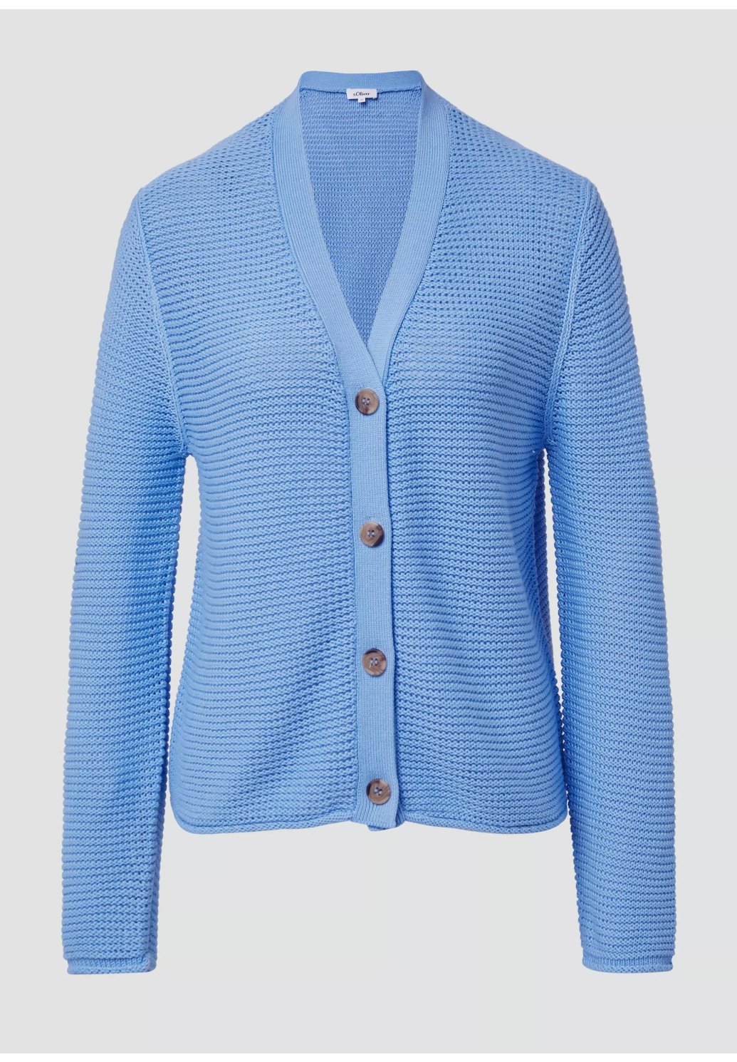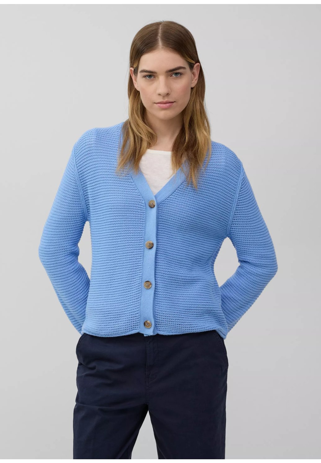 Tento vzdušný, měkký kardigan nadčasového regular střihu vás okouzlí elegantním výstřihem do V a ozdobným žebrovaným vzorem. Zapínání na knoflíky z něj dělá dokonalého společníka pro volné chvíle.