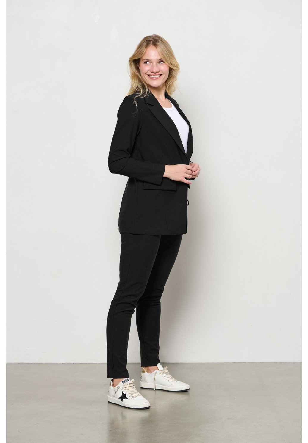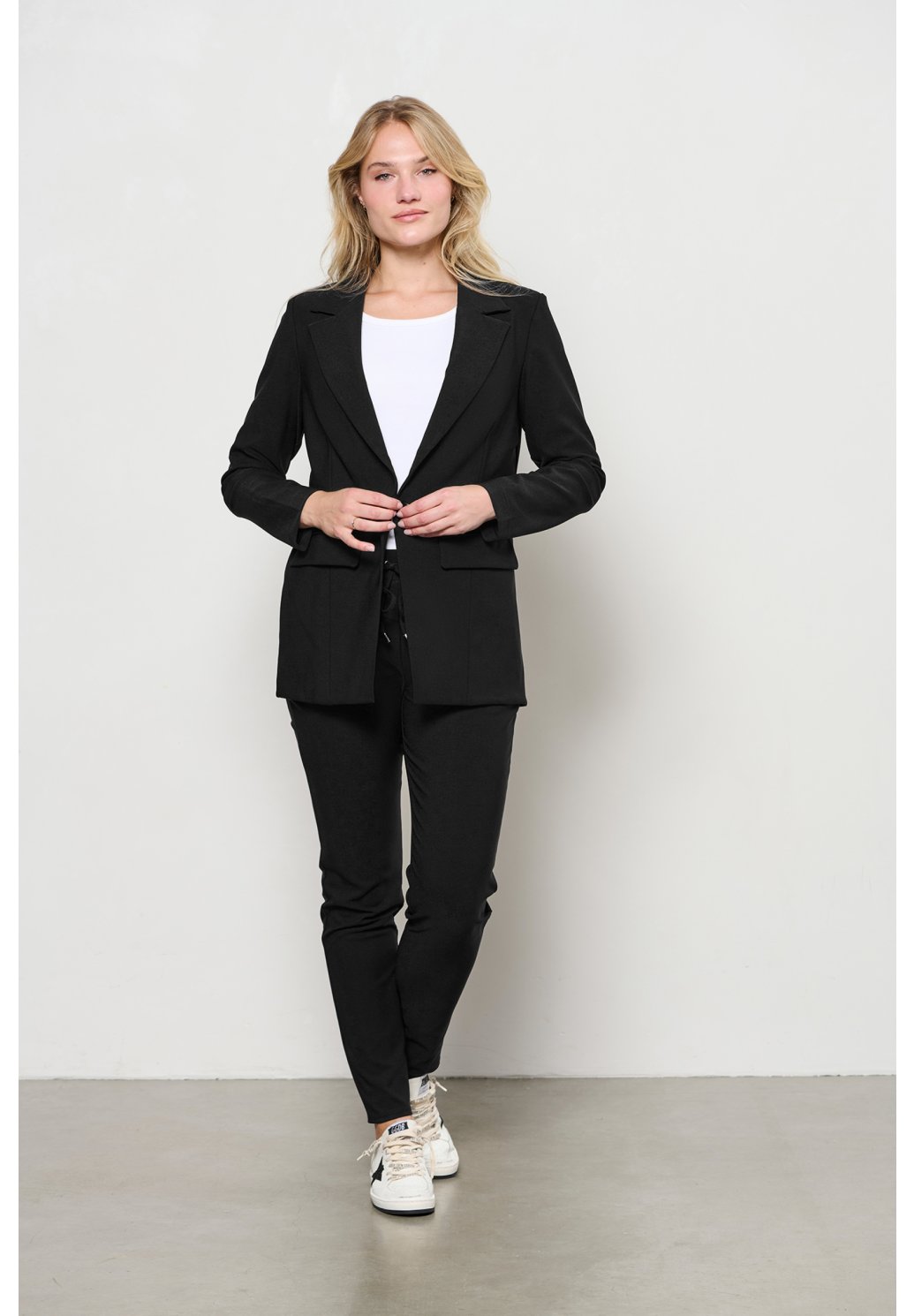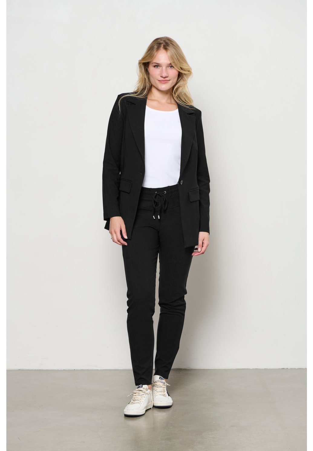 Tyto odolné kalhoty z naší kolekce STUDIO jsou vyrobeny z kvalitního, pevného travel materiálu, který zajišťuje pohodlí i dlouhou životnost. Moderní design doplňují propracované detaily, jako je dekorativní mašle ze stejného materiálu v pase, boční kapsy na předním díle, zadní našité kapsy s patkou a přední i zadní sedlo, které přispívají k lepšímu tvarování postavy a vyššímu komfortu při nošení. Kalhoty představují ideální spojení funkčnosti, elegance a nadčasového stylu, vhodné pro každodenní i formálnější outfit.
