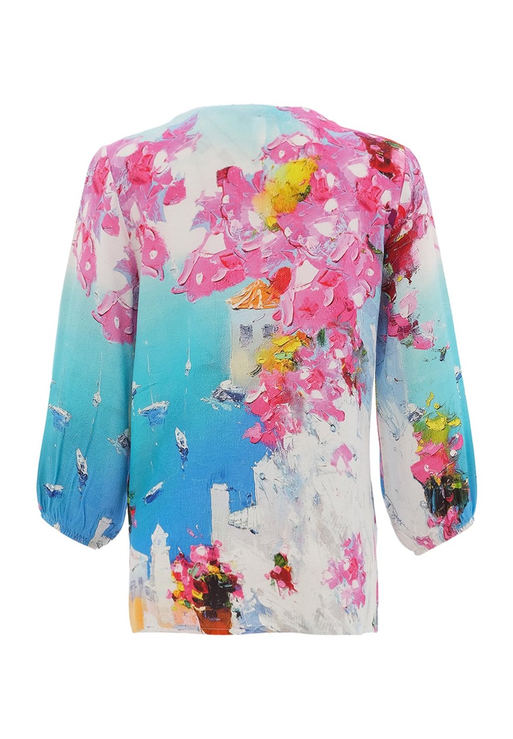 Dámská halenka s výrazným květinovým a abstraktním potiskem v kombinaci tyrkysové, růžové a jemných akvarelových tónů zaujme na první pohled svou svěžestí a originalitou. Lehký, vzdušný materiál je příjemný na nošení a ideální pro jarní i letní dny, zatímco pohodlný střih s tříčtvrtečními rukávy lichotí postavě a poskytuje maximální komfort. Decentní výstřih s jemným zavazováním dodává halence ženský a elegantní detail. Skvěle se kombinuje s bílými i džínovými kalhotami a vytvoří stylový outfit pro volný čas, dovolenou i neformální setkání. Tato halenka je perfektní volbou pro ženy, které chtějí do svého šatníku vnést barvu, lehkost a osobitý styl.