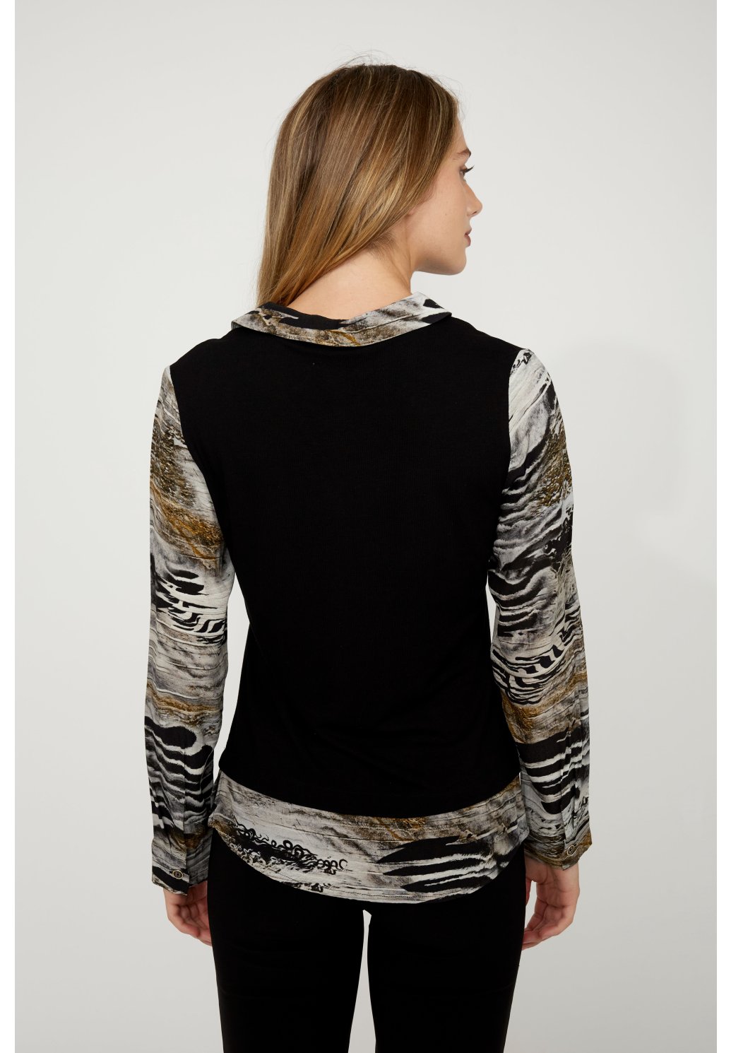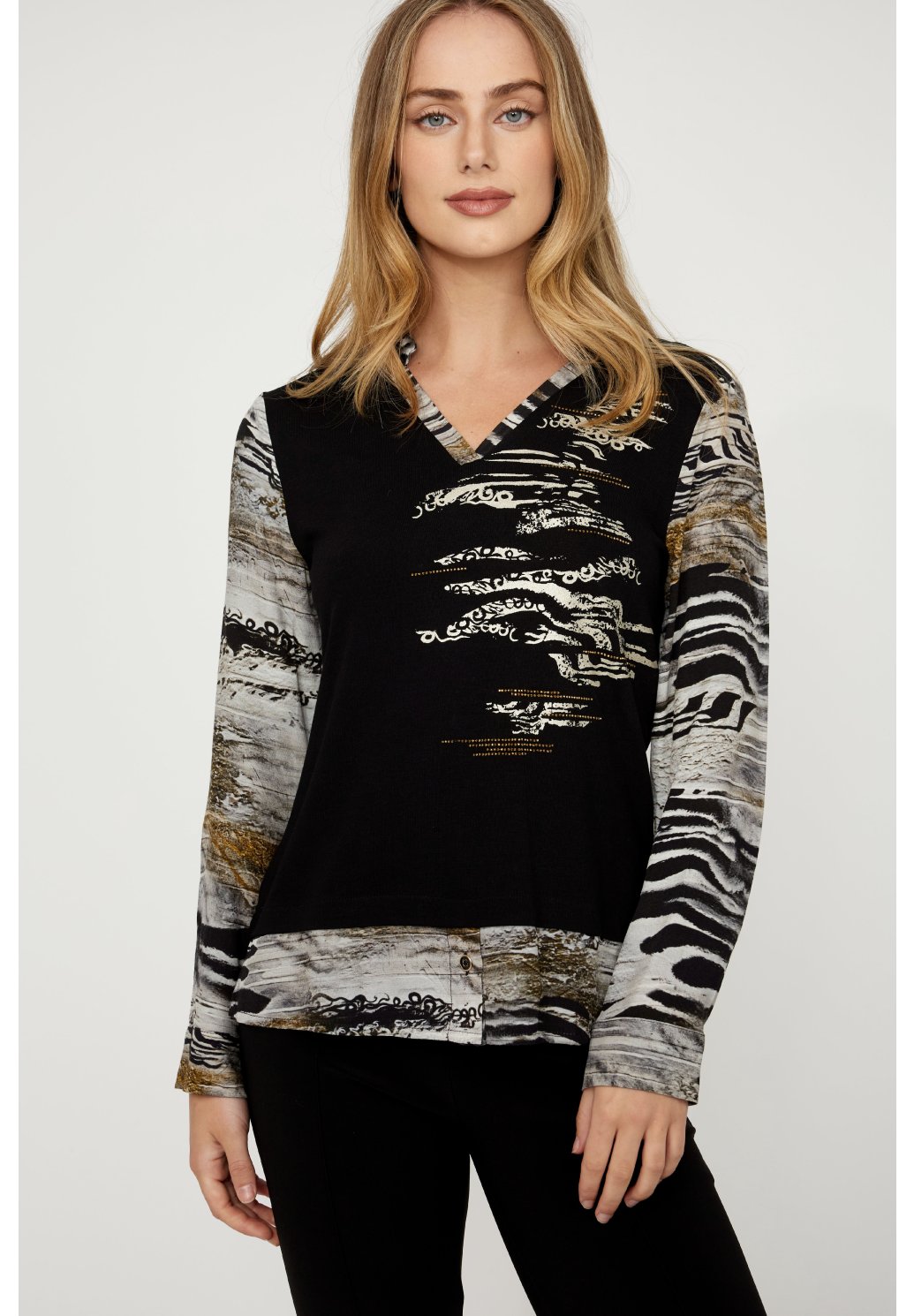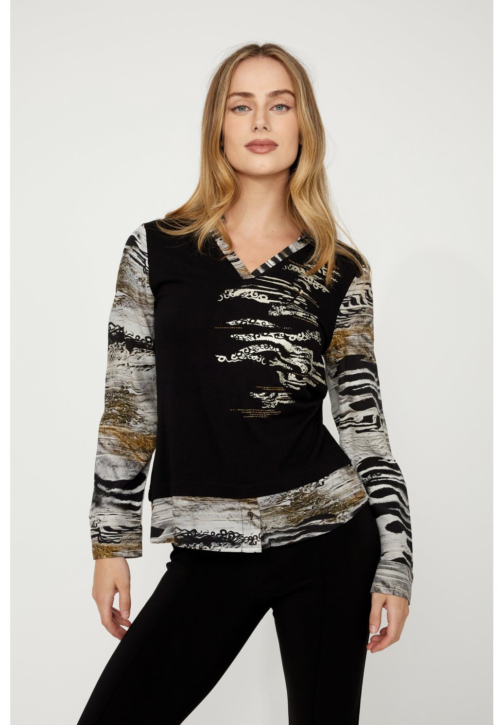 Dámská halenka Dolcezza spojuje ležérní eleganci s jemným nádechem sofistikovanosti. Přiléhavý střih v délce do boků doplňuje výstřih do V zdobený jemnými kamínky, který se hodí jak do kanceláře, tak na volný čas. Originální kombinace abstraktního a zvířecího vzoru dodává modelu jedinečný vzhled, zatímco dlouhé rovné rukávy zajišťují maximální pohodlí. Stylový kousek, který se stane univerzální součástí vašeho šatníku.
