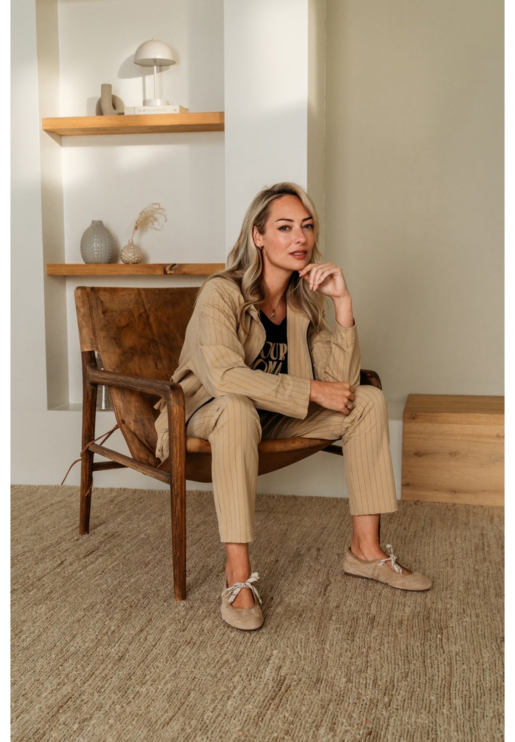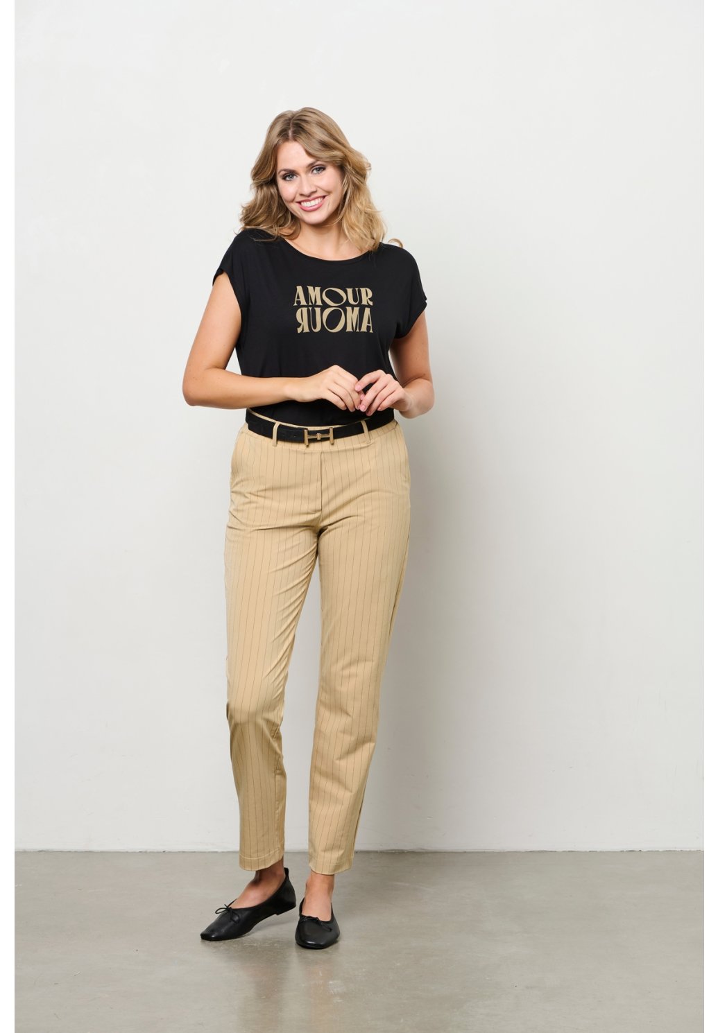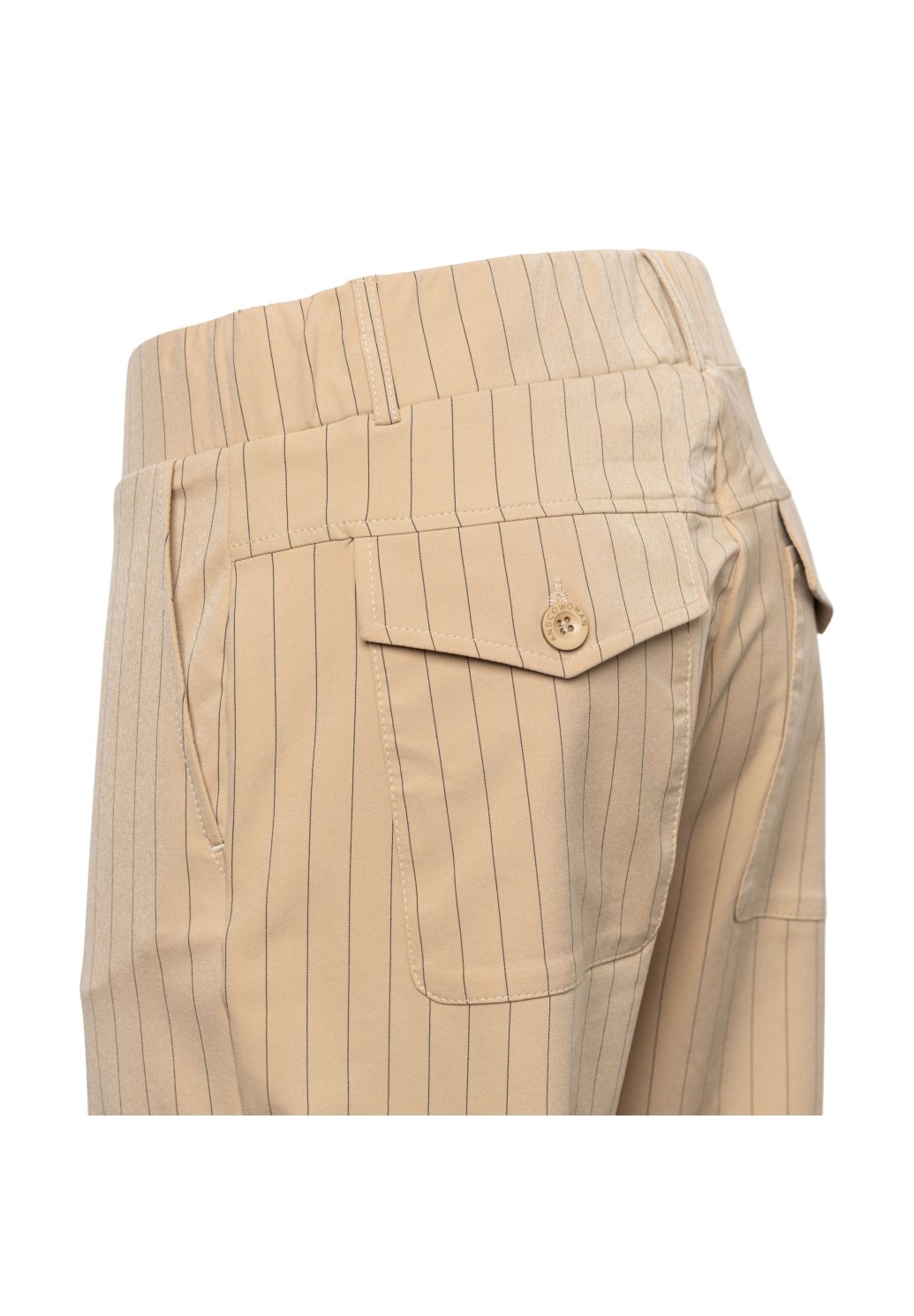 Tyto dámské kalhoty jsou vyrobeny z kvalitního pinstripe travel materiálu, který zajišťuje pohodlí, nemačkavost a elegantní vzhled po celý den. Mají hladký pas s elastickou úpravou pro maximální komfort, boční kapsy vpředu a zadní nakládané kapsy s patkou. Cigaretový střih nohavic dodává kalhotám moderní a ženskou siluetu, díky čemuž jsou ideální volbou pro pracovní i městské outfity.