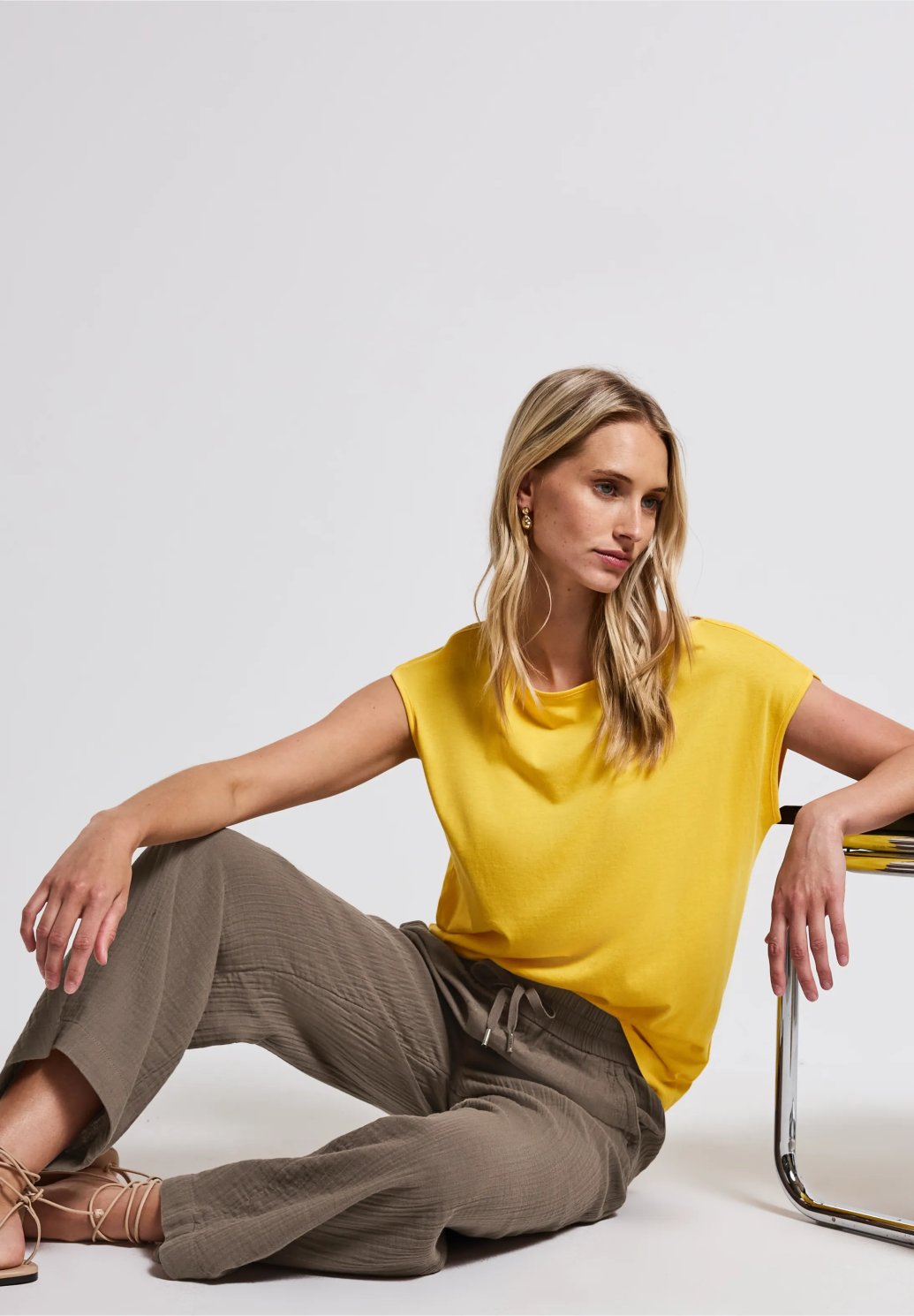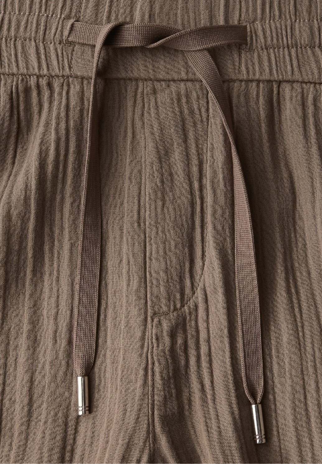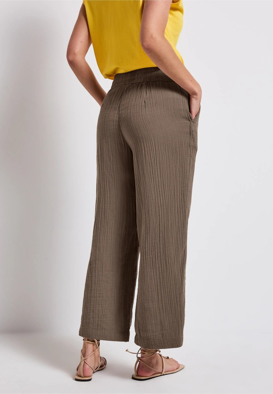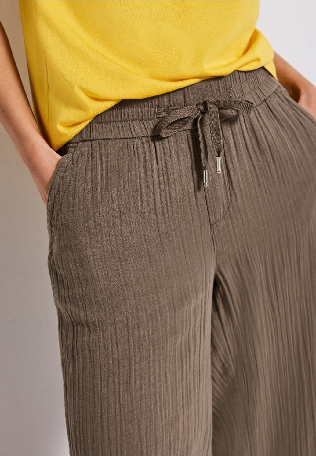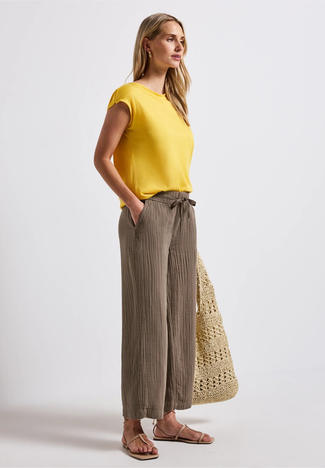 Mušelínové kalhoty od Street One pro ženy kombinují vzdušný volný střih s módními širokými nohavicemi a vysokým pasem. Elastický pas se stahovací šňůrkou a čistá bavlna zajišťují příjemnou volnost pohybu a vysoký komfort nošení. Ideální pro uvolněný letní outfit s moderním nádechem.