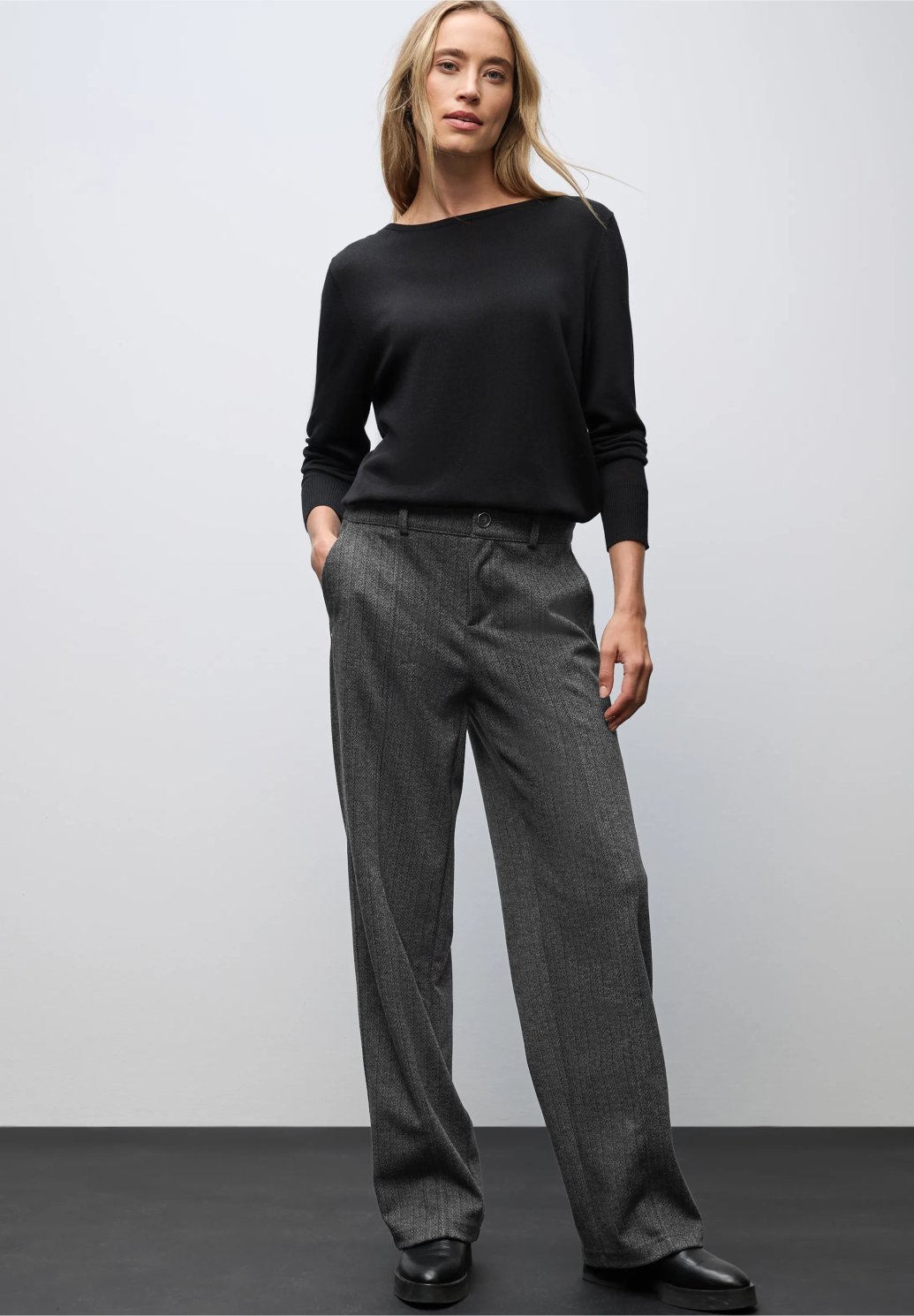 Tyto rovné kalhoty od Street One s klasickým proužkovaným vzhledem a moderním střihem jsou stylovým společníkem pro ženy. Ležérní střih s vysokým pasem a elastickým zadním panelem zajišťuje pohodlí, zatímco rovná silueta vyzařuje nadčasovou eleganci. Ideální jak do kanceláře, tak do města.