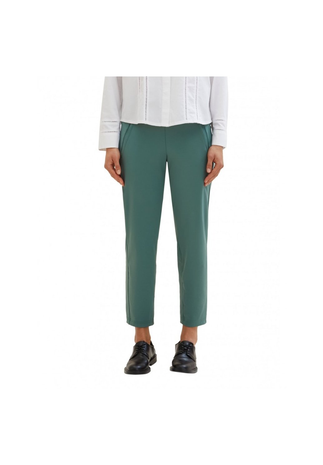 Dámské kalhoty v moderním zeleném odstínu jsou skvělou volbou pro pohodlný a zároveň elegantní outfit. Mají jednoduchý, mírně zúžený střih a zkrácenou délku nohavic, která opticky prodlužuje siluetu. Příjemný, pružný materiál zajišťuje komfort při nošení po celý den. Kalhoty se snadno kombinují s halenkou, svetrem i basic tričkem a hodí se jak do práce, tak na volný čas.