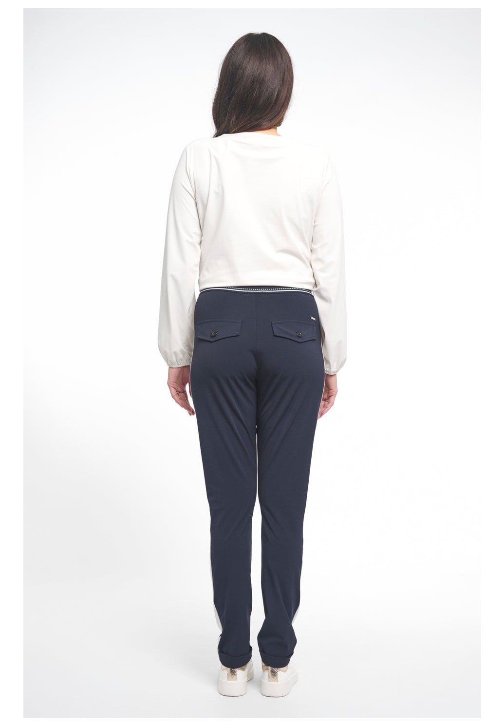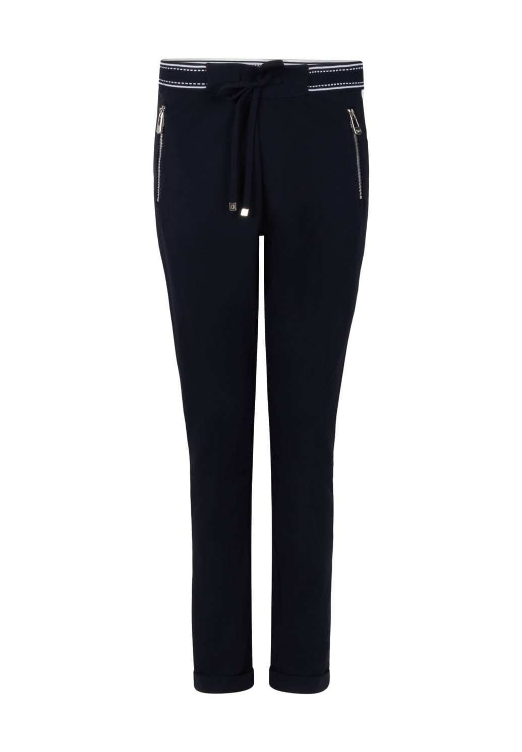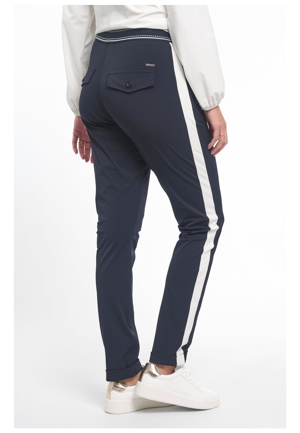 Cestovní kalhoty Eve Night Blue jsou pohodlné zúžené kalhoty z cestovní látky. Díky sportovnímu pasu se stahovací šňůrkou, kontrastním bočním panelům a ohrnutému lemování vytvářejí tyto kalhoty moderní a nenuceně stylový vzhled.