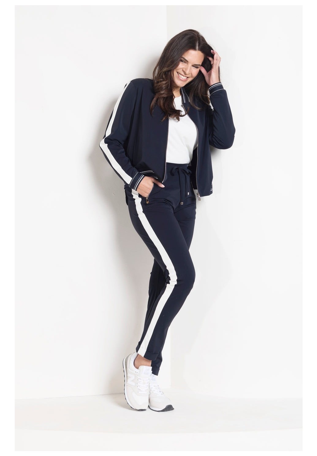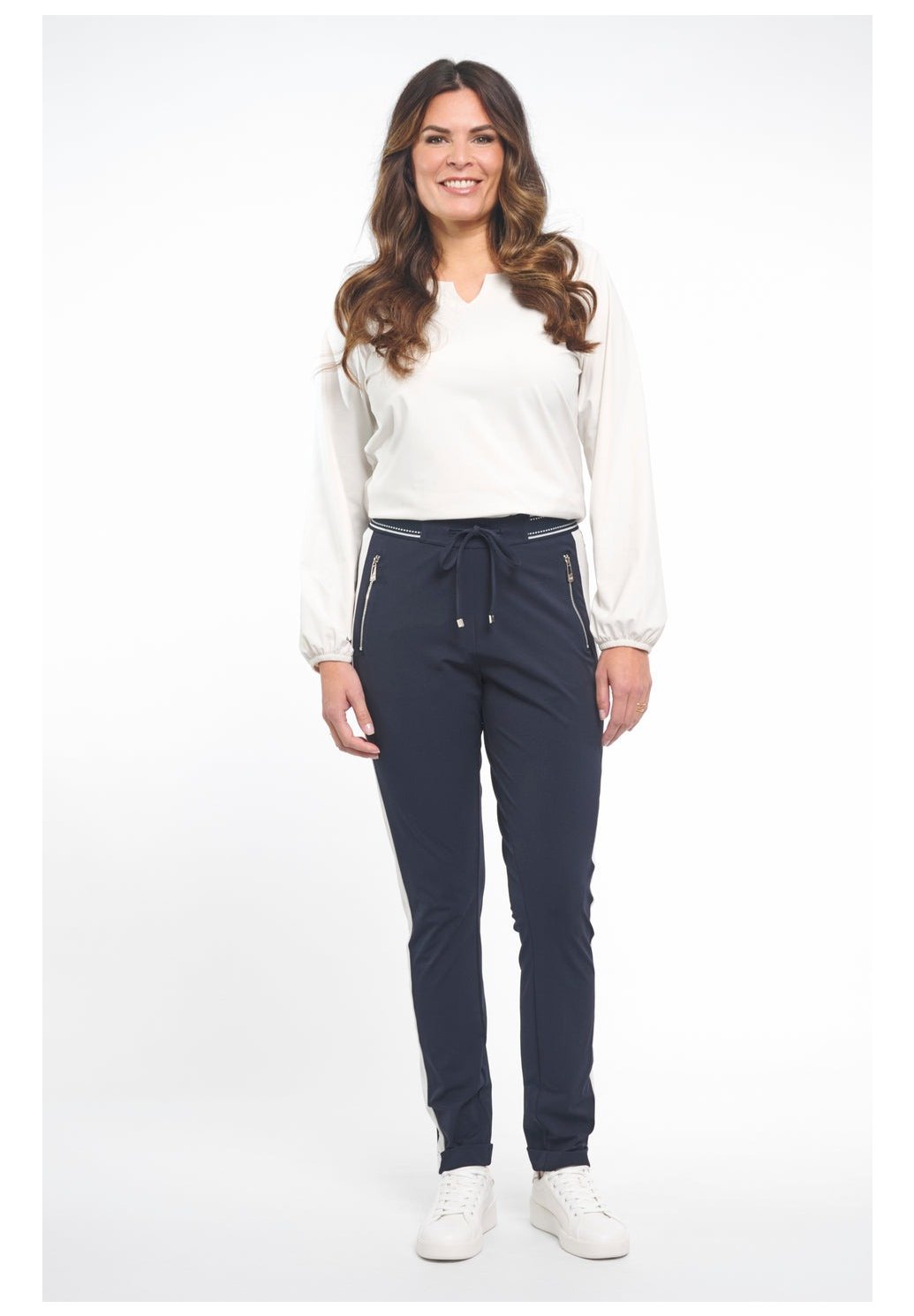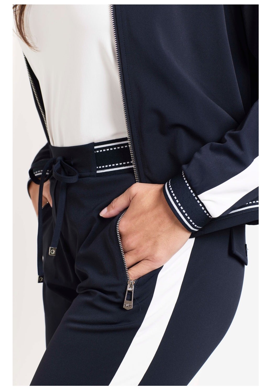 Cestovní kalhoty Eve Night Blue jsou pohodlné zúžené kalhoty z cestovní látky. Díky sportovnímu pasu se stahovací šňůrkou, kontrastním bočním panelům a ohrnutému lemování vytvářejí tyto kalhoty moderní a nenuceně stylový vzhled.