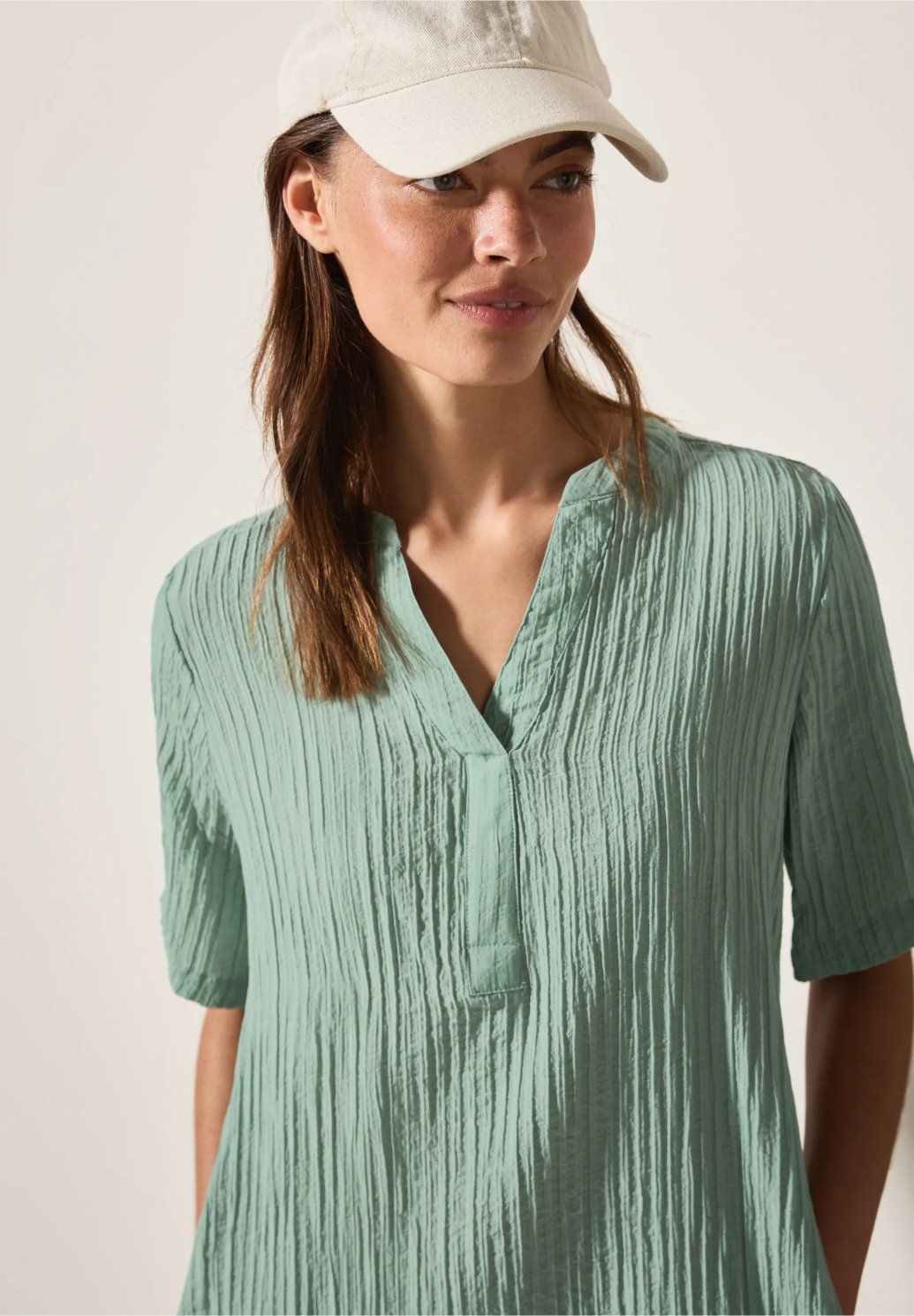 Tyto krátké dámské šaty značky CECIL zaujmou lehkou směsí viskózy a volným střihem. Rozparkovaný výstřih a krátké rukávy vytvářejí uvolněný vzhled. Boční kapsy nabízejí praktické pohodlí pro každodenní použití.