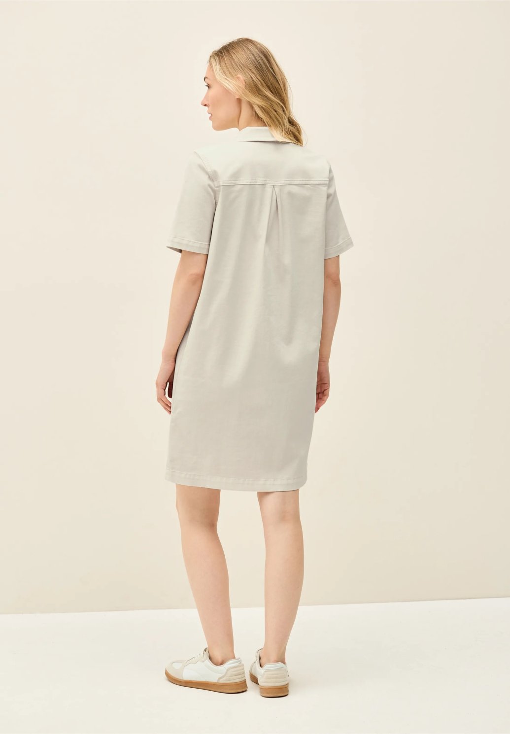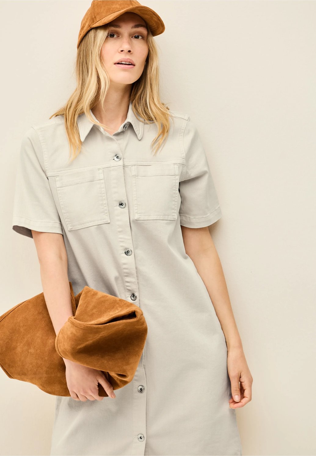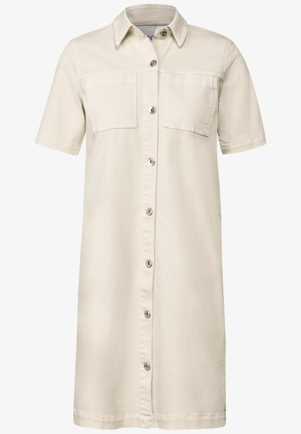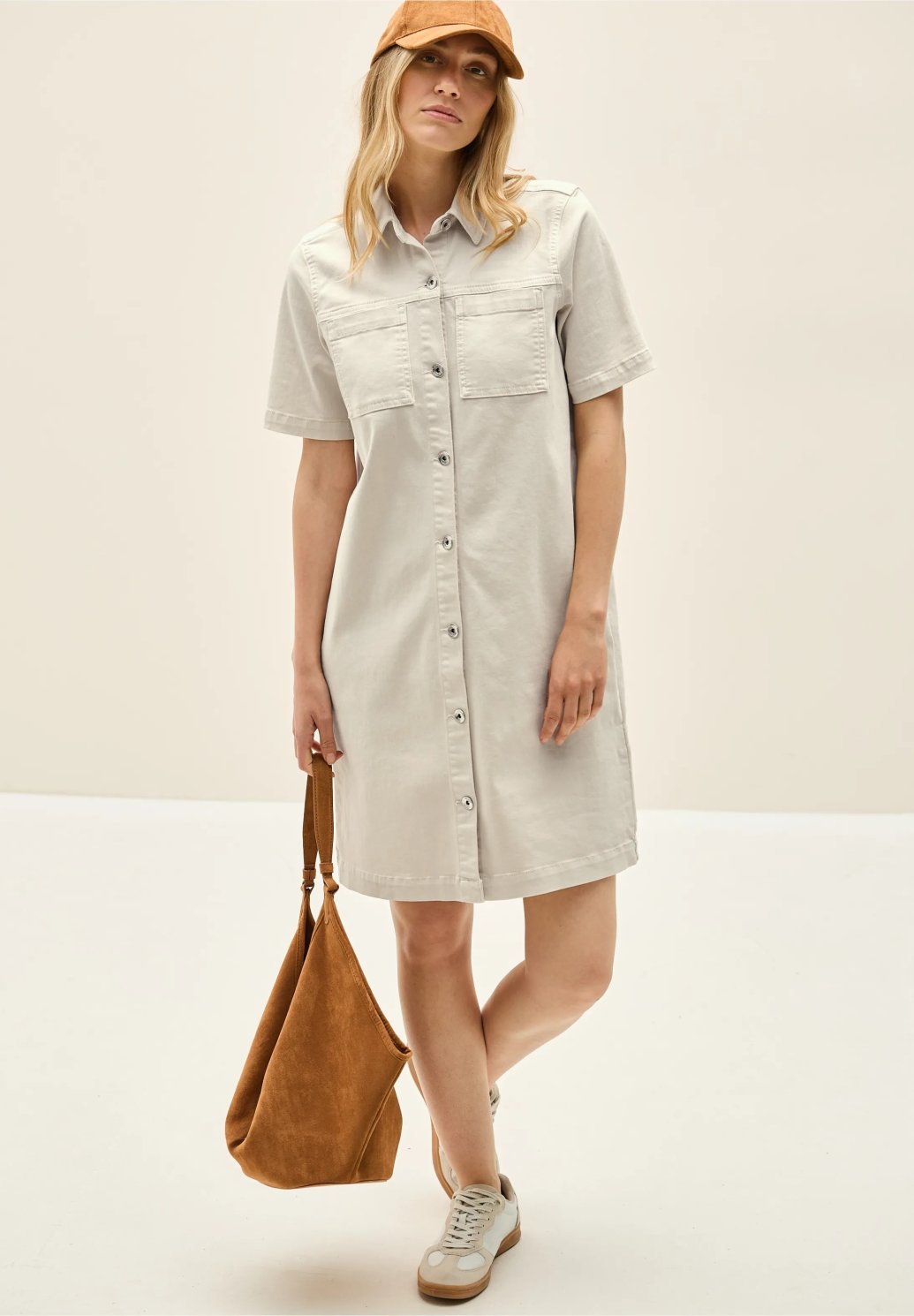 Tyto béžové džínové šaty od značky CECIL pro ženy kombinují klasický košilový límec, náprsní kapsy a zapínání na knoflíky po celé délce pro moderní vzhled. Krátké rukávy a boční rozparky doplňují uvolněný střih. Díky směsi bavlny a streču jsou džínové šaty obzvláště pohodlné.