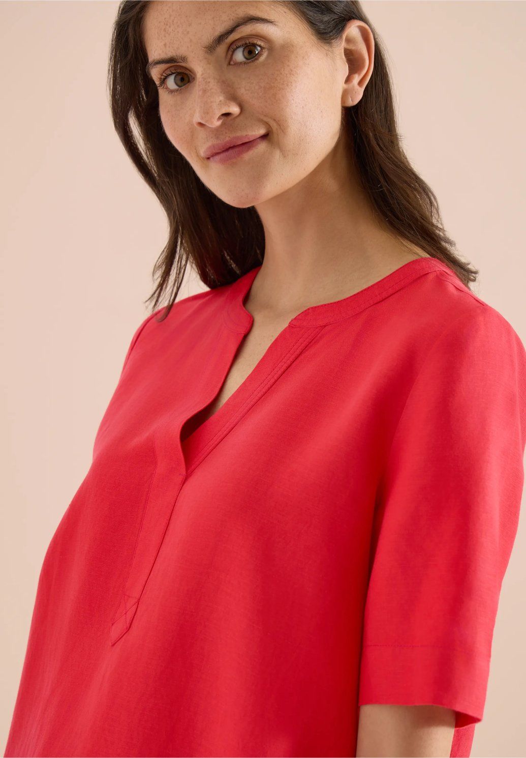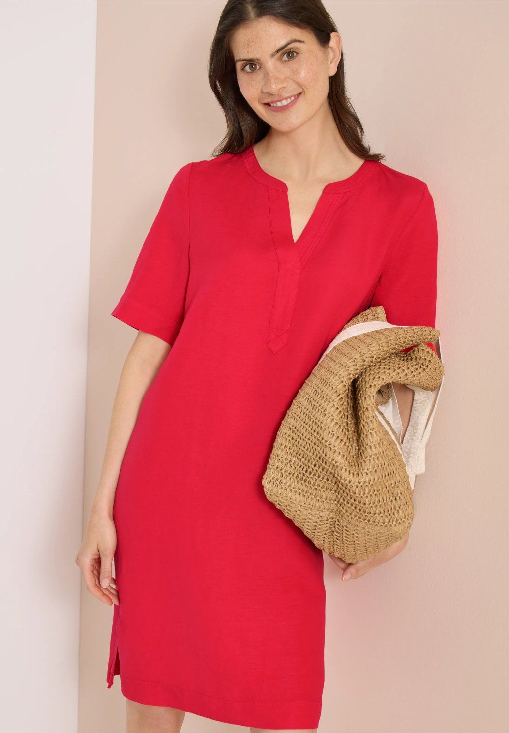 Dámské šaty ve výrazném růžovo-červeném odstínu jsou nepřehlédnutelným kouskem, který rozzáří každý letní outfit. Volnější rovný střih zajišťuje pohodlné nošení, zatímco výstřih do V dodává modelu jemně ženský a elegantní vzhled. Krátké rukávy a jednoduchý minimalistický design podtrhují jejich lehkost a univerzálnost. Ideální volba do města, na dovolenou i pro chvíle, kdy chcete vsadit na barvu, pohodlí a svěží styl.