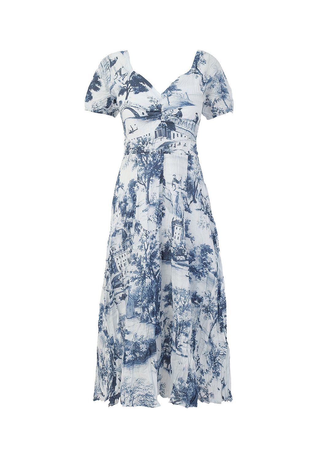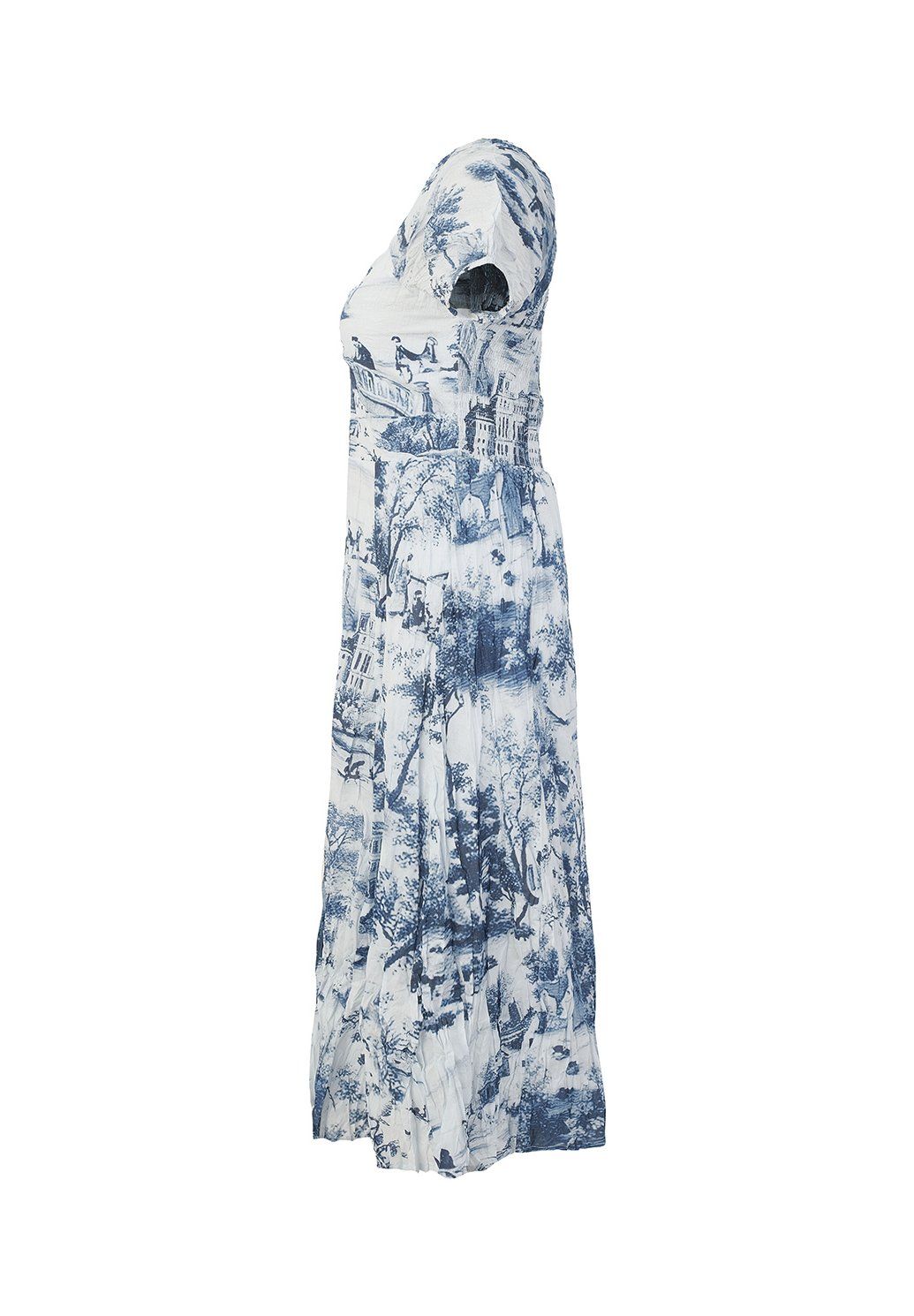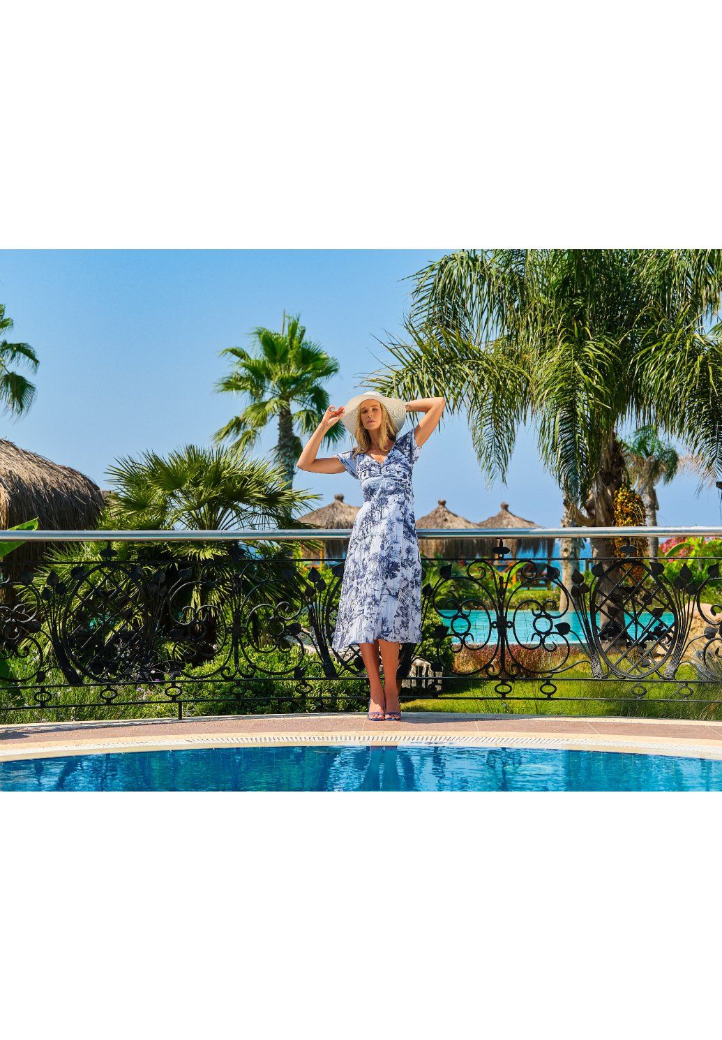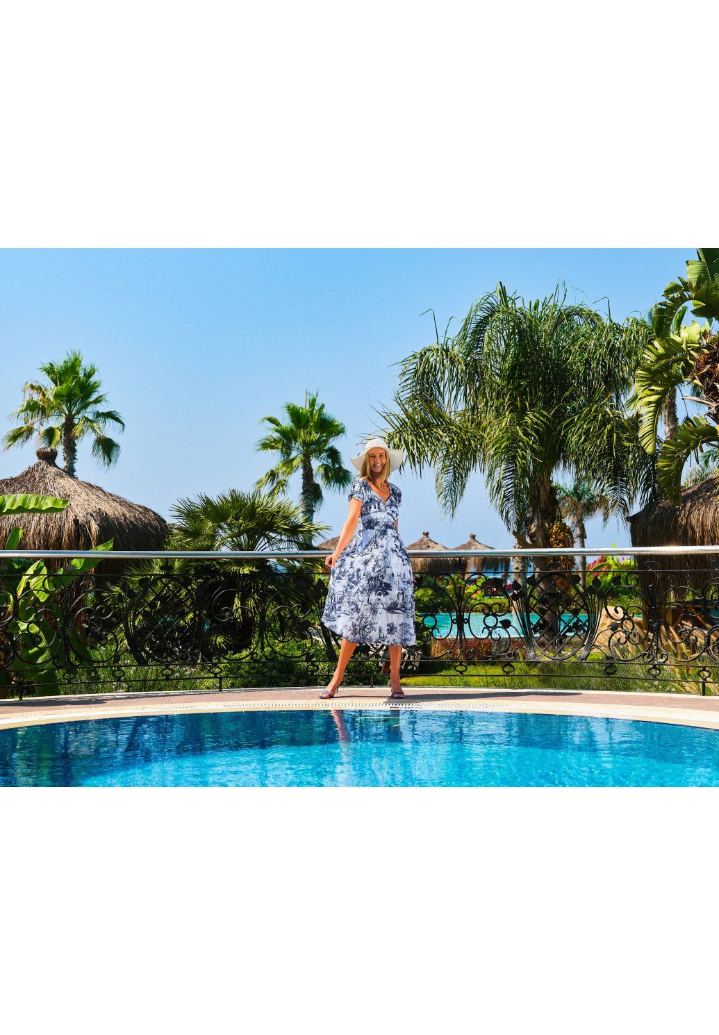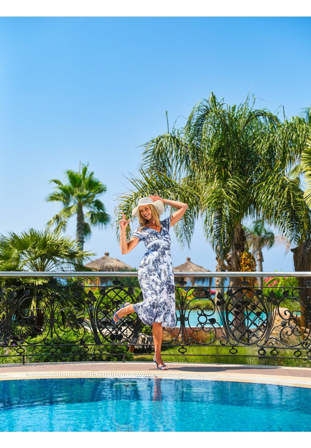 Dámské šaty v bílo-modrém provedení okouzlí na první pohled elegantním vzorem inspirovaným středomořskou atmosférou. Jemně projmutý střih krásně zvýrazní siluetu, zatímco vzdušná midi délka a krátké rukávy zajišťují pohodlí i lehkost při nošení. Výstřih do V dodává modelu ženský a svěží vzhled, díky kterému jsou šaty ideální volbou na dovolenou, letní procházky i slavnostnější denní příležitosti. Stylový kousek pro ženy, které milují eleganci s nádechem léta.