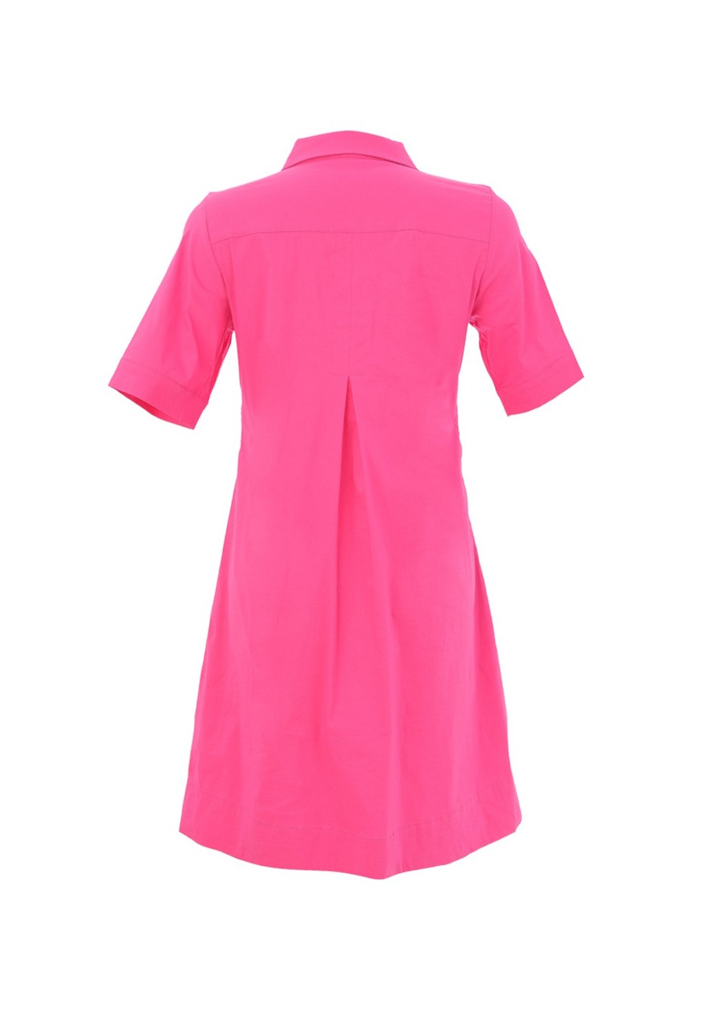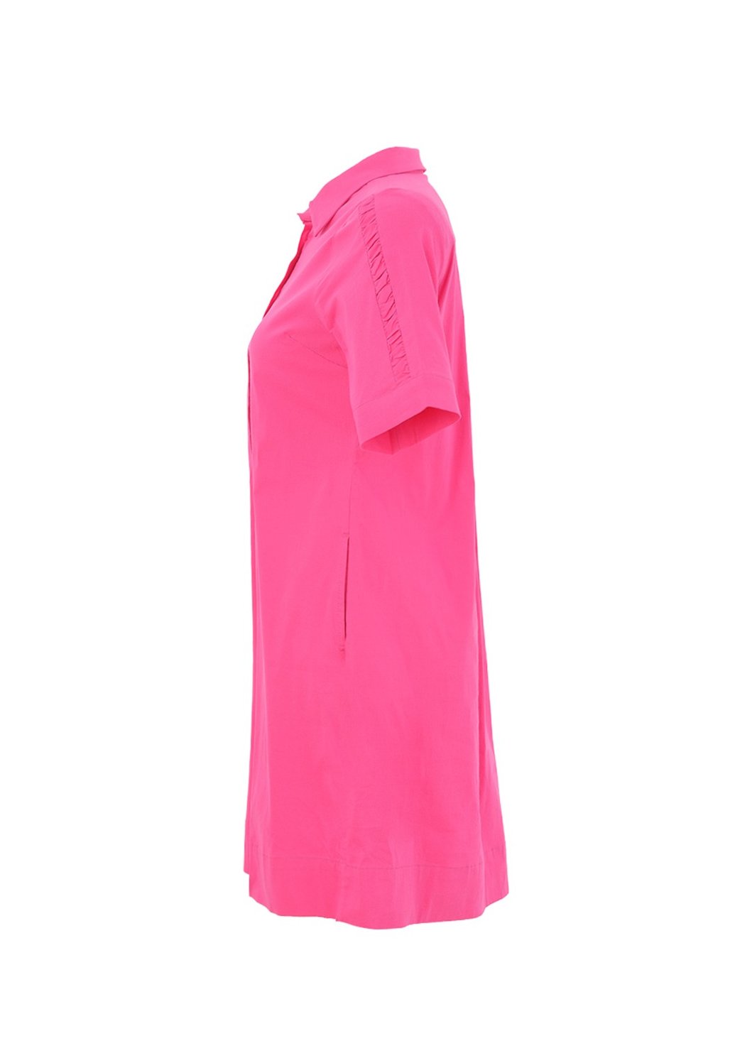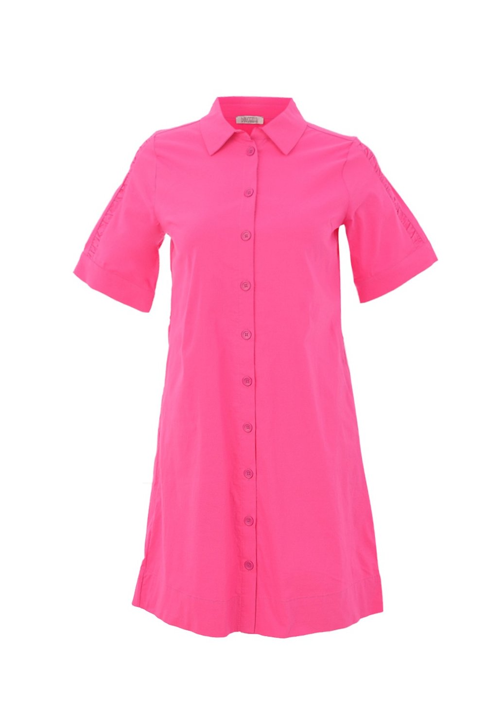 Dámské šaty Dolcezza v zářivém fuchsiovém odstínu jsou ideální volbou pro ženy, které chtějí být nepřehlédnutelné. Lehký a příjemný materiál zajišťuje maximální komfort i během teplých dnů, zatímco košilový střih s límečkem a zapínáním na knoflíky působí elegantně a upraveně. Krátké rukávy s jemným detailem dodávají šatům moderní šmrnc. Skvěle se hodí jak do práce, tak na volný čas — stačí doplnit teniskami nebo sandály a stylový outfit je na světě.