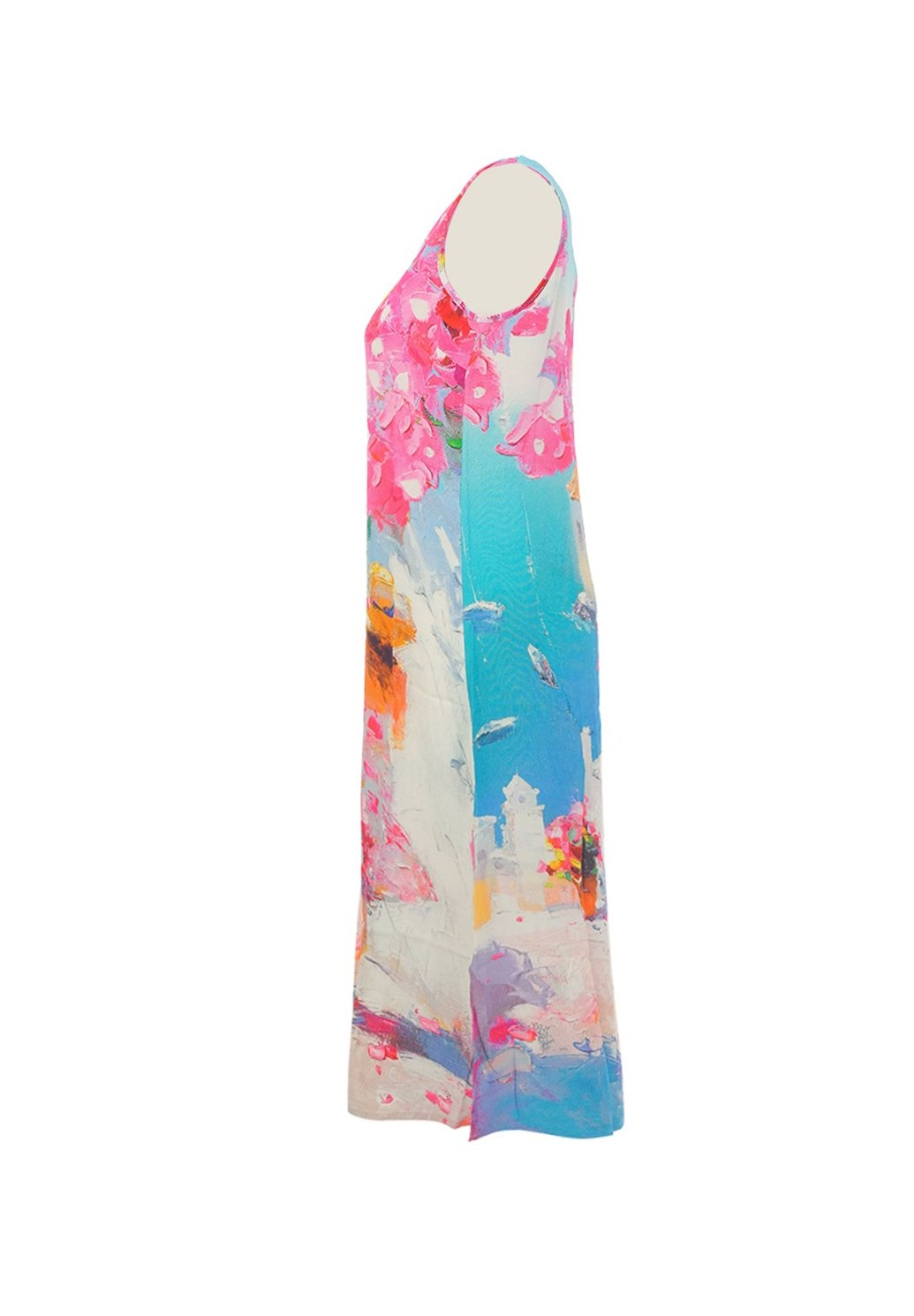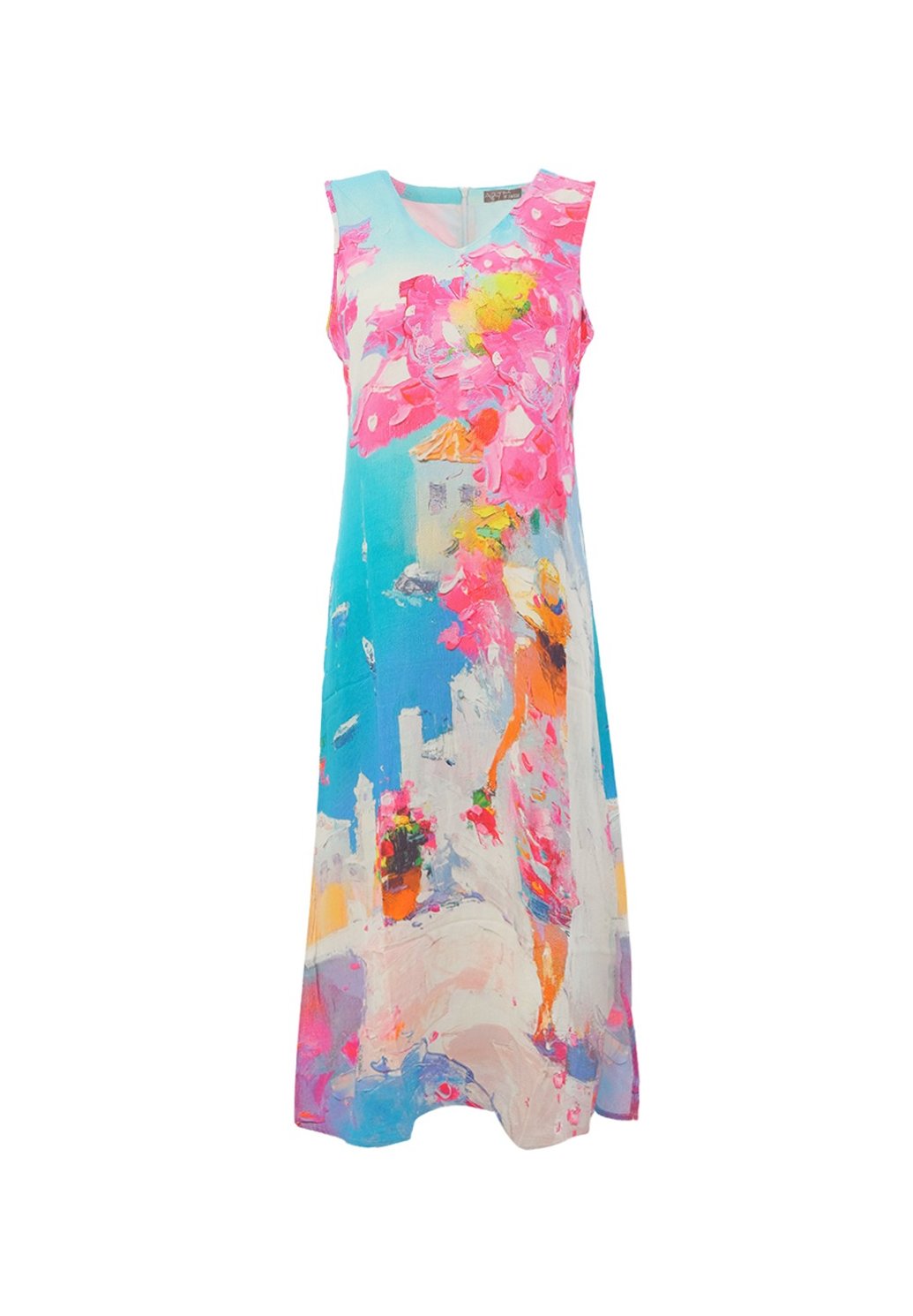 Elegantní dámské šaty s originálním uměleckým potiskem zaujmou na první pohled svou barevností a jedinečným designem. Áčkový střih lichotí postavě, jemně splývavý materiál zajišťuje pohodlí po celý den a výstřih do V dodává modelu ženskost a lehkost. Bezrukávové provedení je ideální pro teplejší dny, ať už na dovolenou, společenskou událost nebo stylové městské nošení. Tyto šaty jsou perfektní volbou pro ženy, které chtějí spojit komfort s výrazným, ale vkusným vzhledem.
