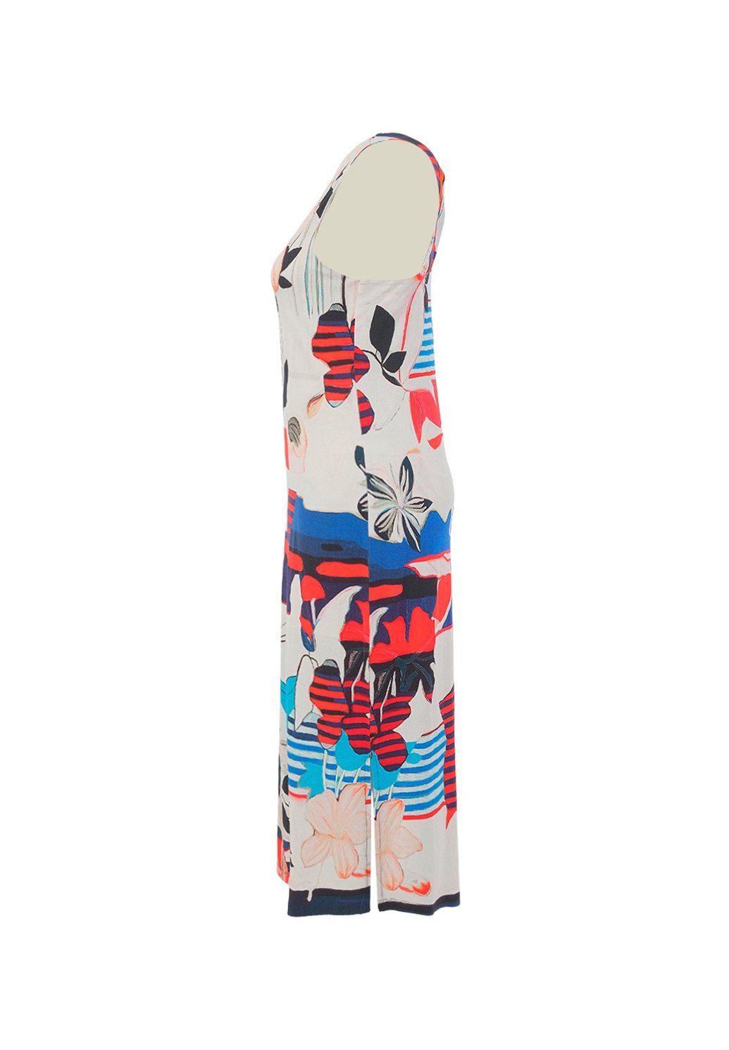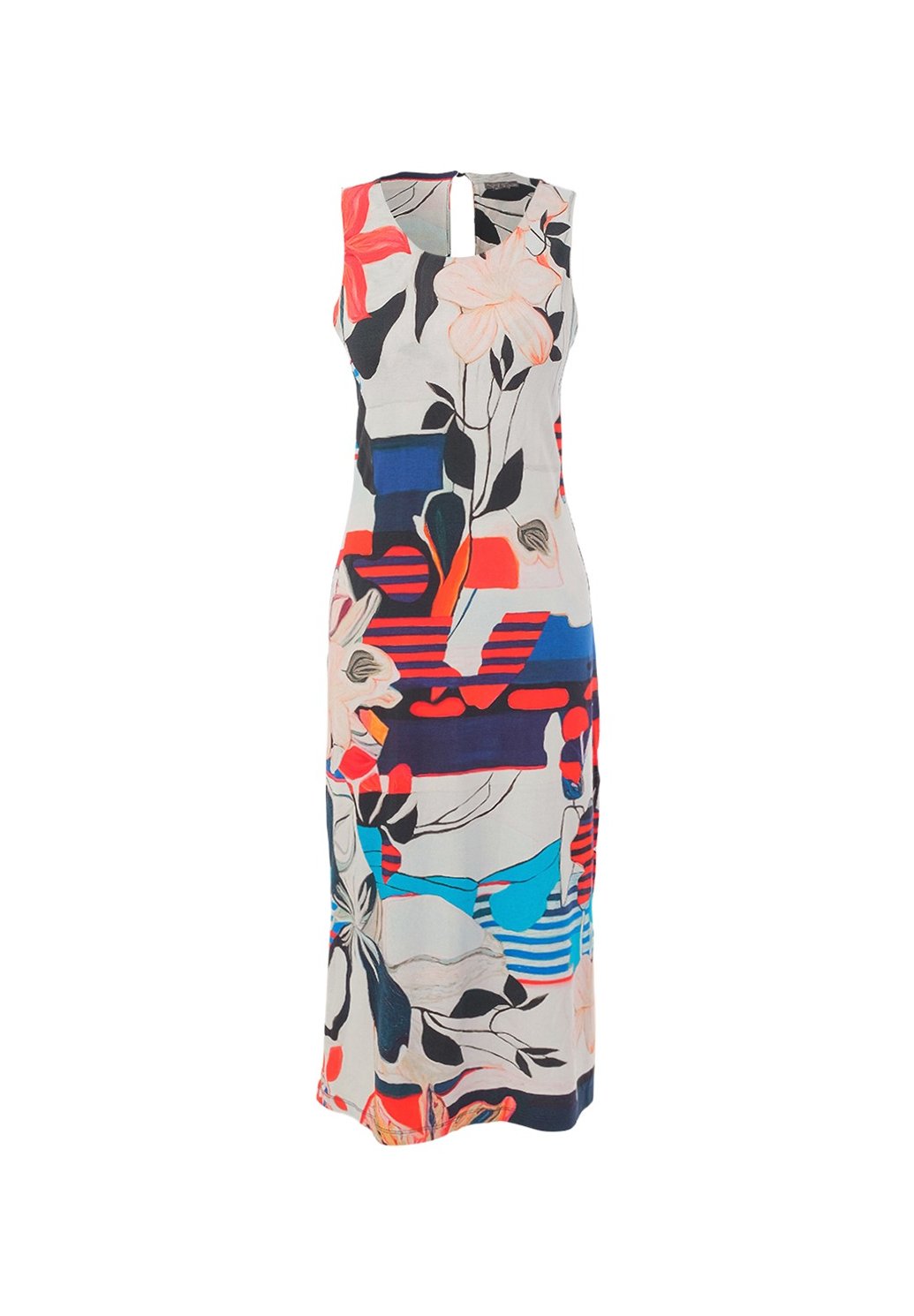 Tyto výrazné šaty jsou dokonalou volbou pro ženy, které milují barvy a chtějí zazářit. Originální kombinace červené, modré, bílé a černé s květinovými i geometrickými motivy vytváří moderní a nepřehlédnutelný design. Přiléhavý střih krásně kopíruje postavu, zatímco pohodlný materiál zajišťuje komfort po celý den. Délka pod kolena spolu s jemným rozparkem dodává modelu ženskost a lehkou eleganci, díky které se hodí jak na letní procházky, dovolenou u moře, tak i na stylové městské schůzky. Stačí doplnit jednoduchými sandálky nebo podpatky a outfit, ve kterém budete sebevědomá a nepřehlédnutelná, je na světě.