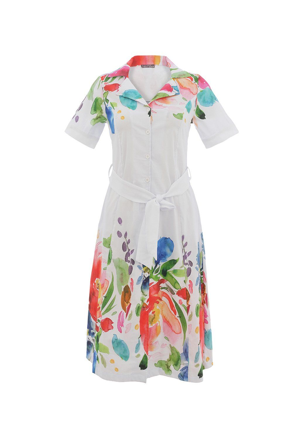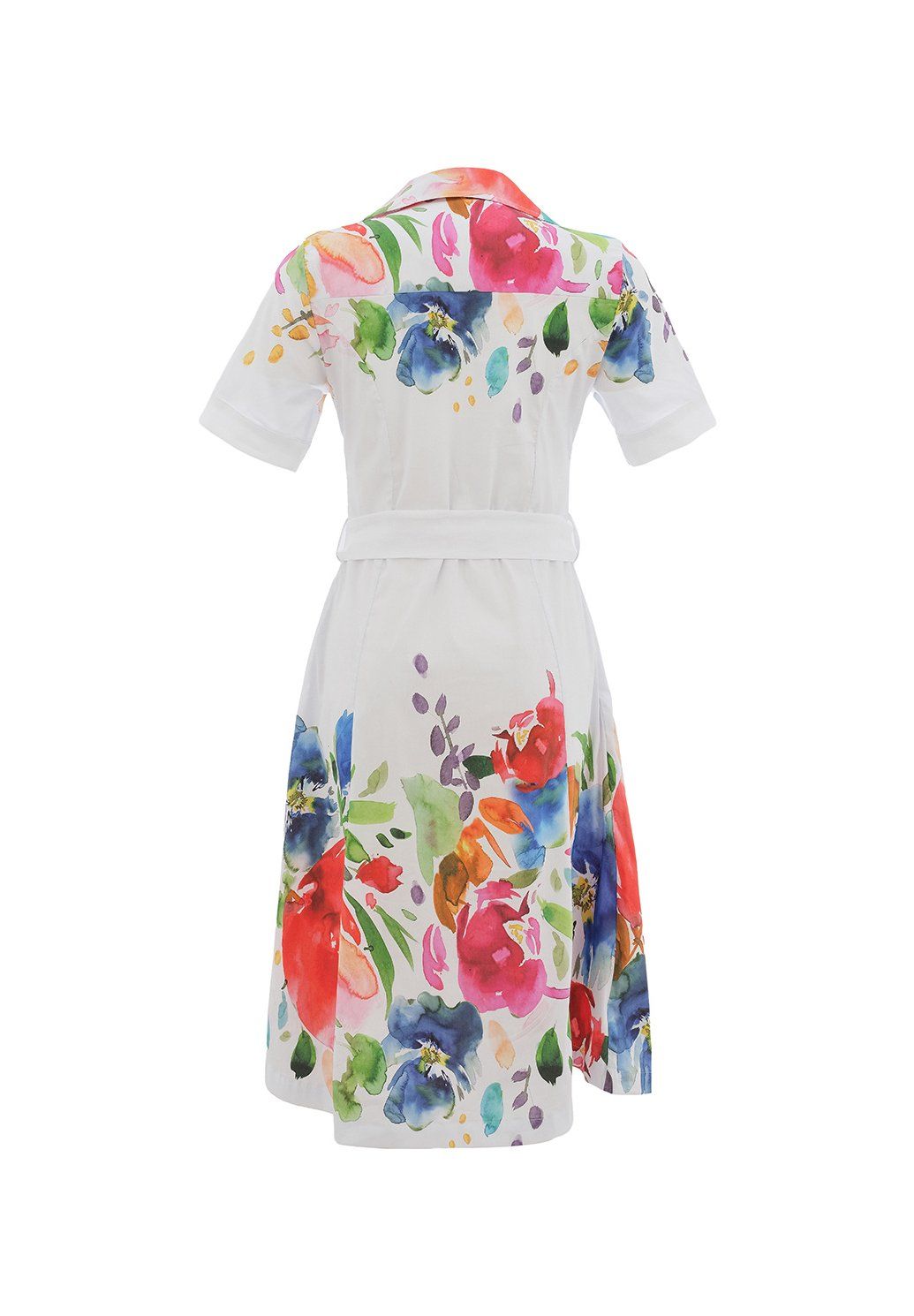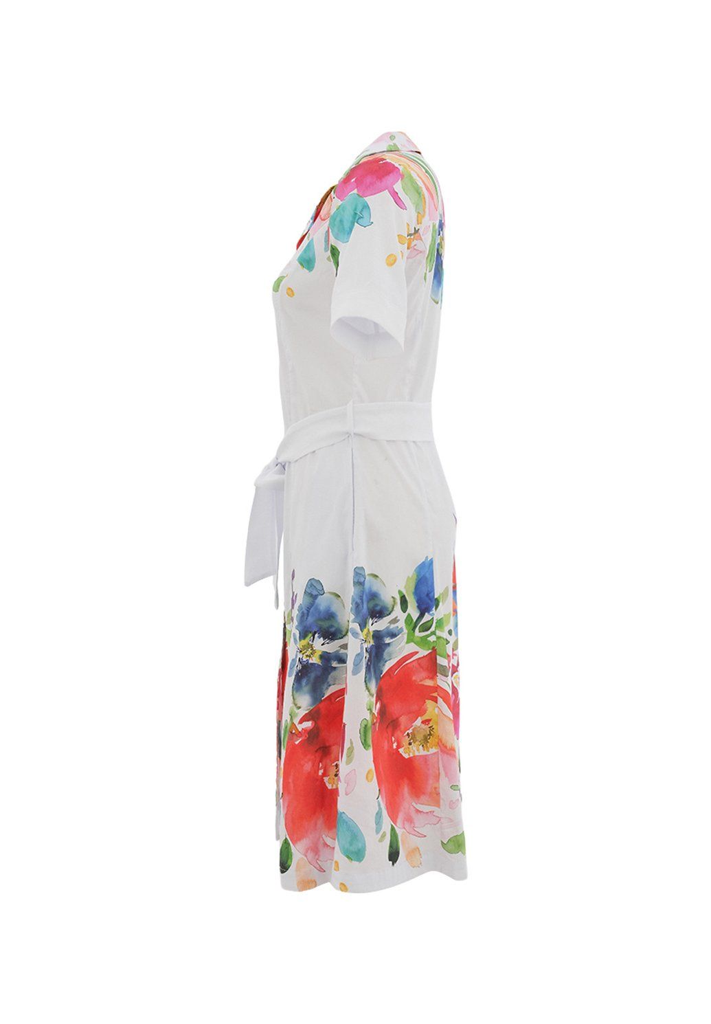 Dámské košilové šaty s výrazným květinovým potiskem jsou svěžím a elegantním kouskem pro slunečné dny. Bílý základ krásně doplňují barevné akvarelové motivy květů, které modelu dodávají ženský, hravý a velmi nápaditý vzhled. Krátké rukávy, límeček, zapínání na knoflíky a pásek v pase vytvářejí lichotivou siluetu a zároveň zajišťují pohodlné nošení. Ideální volba do města, na dovolenou i na letní příležitosti, kdy chcete působit upraveně, svěže a stylově.