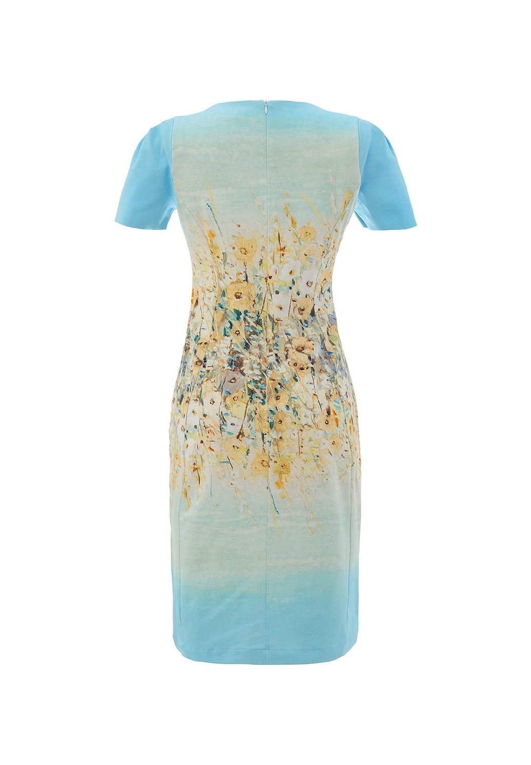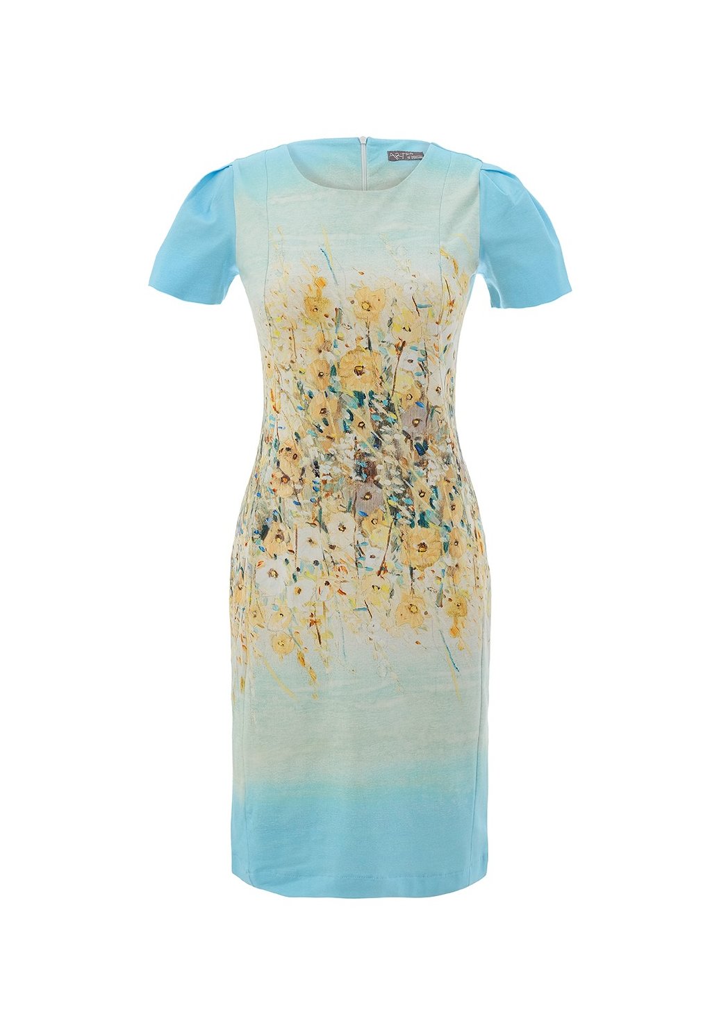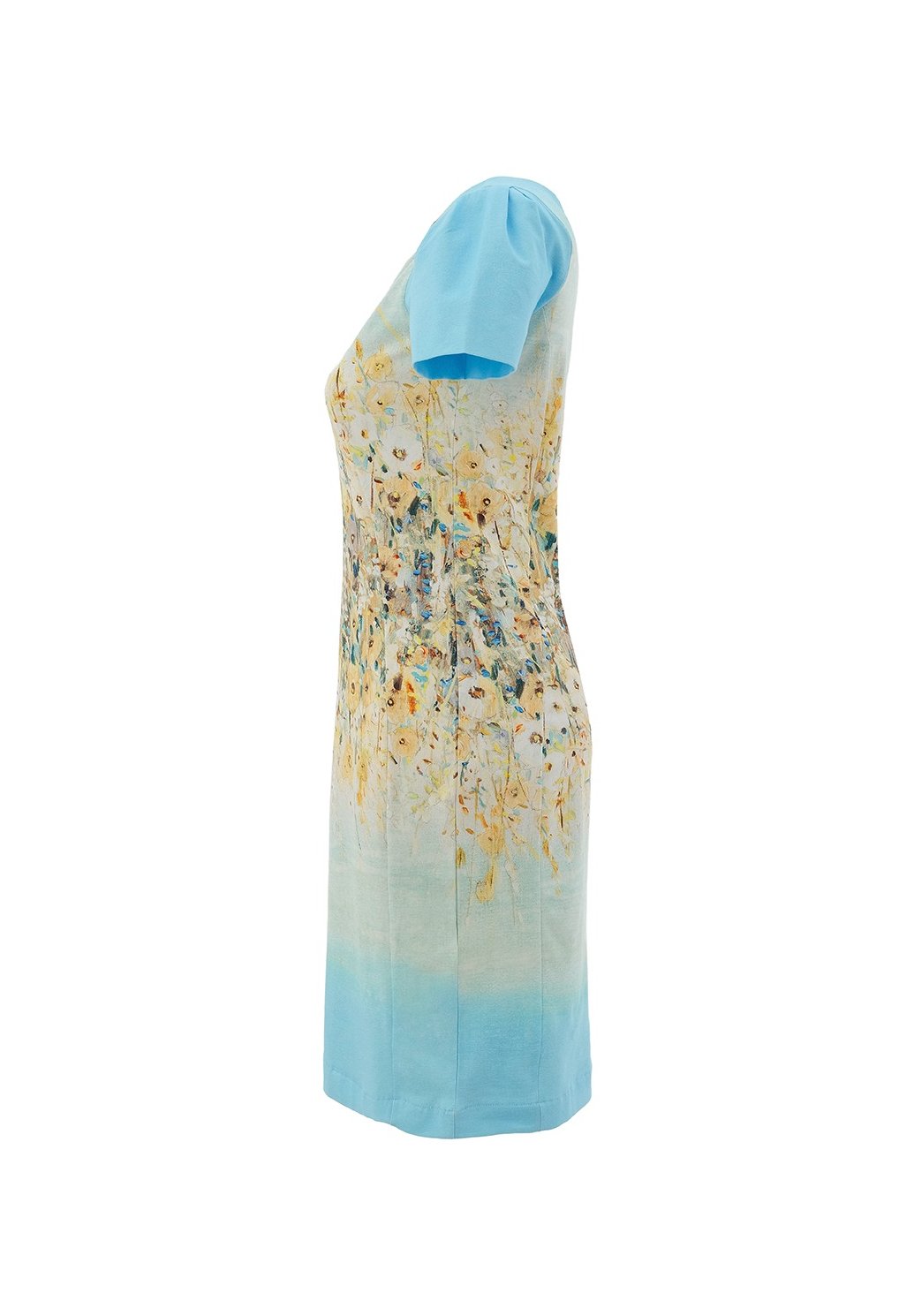 Okouzlující dámské šaty Dolcezza zaujmou na první pohled originálním květinovým motivem v jemných odstínech modré a žluté. Přiléhavý střih krásně zvýrazní siluetu, zatímco příjemný, pružný materiál zajistí pohodlí po celý den. Krátké rukávy a elegantní délka dodávají modelu ženský a sofistikovaný vzhled. Ideální volba pro společenské příležitosti, letní akce i stylové denní nošení — stačí doplnit podpatky nebo sandály a outfit je dokonalý.