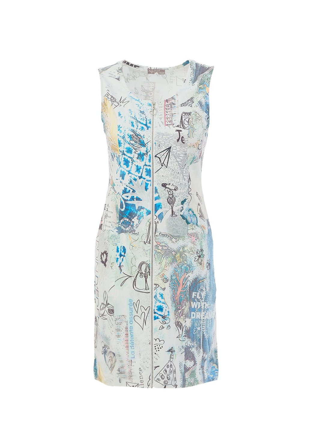 Tyto originální šaty zaujmou na první pohled svým jedinečným uměleckým potiskem v jemných odstínech modré, tyrkysové a béžové, který působí svěže a moderně. Přiléhavý střih krásně zvýrazní ženskou siluetu, zatímco pohodlný materiál zajistí komfort po celý den. Praktický zip po celé délce dodává modelu lehce sportovní nádech a zároveň umožňuje variabilní styling – můžete jej lehce rozepnout pro uvolněnější vzhled nebo zapnout až ke krku pro elegantnější efekt. Tyto šaty jsou ideální volbou pro ženy, které se nebojí vystoupit z davu a chtějí spojit pohodlí s výrazným stylem, ať už do práce, na schůzku nebo na volný čas.