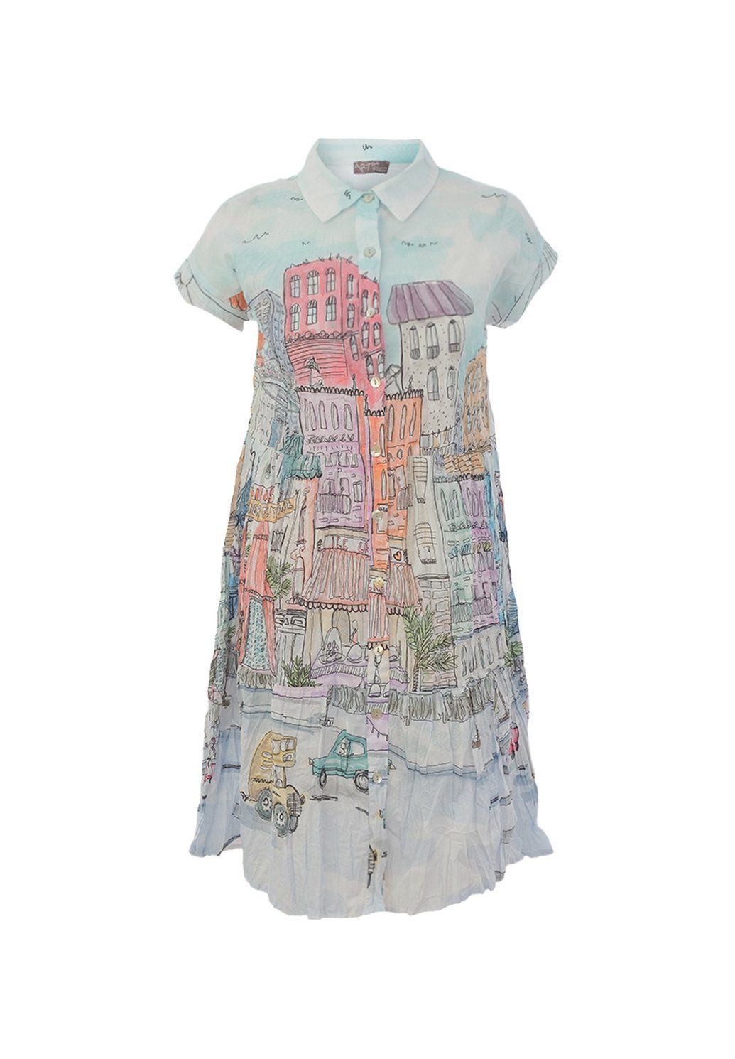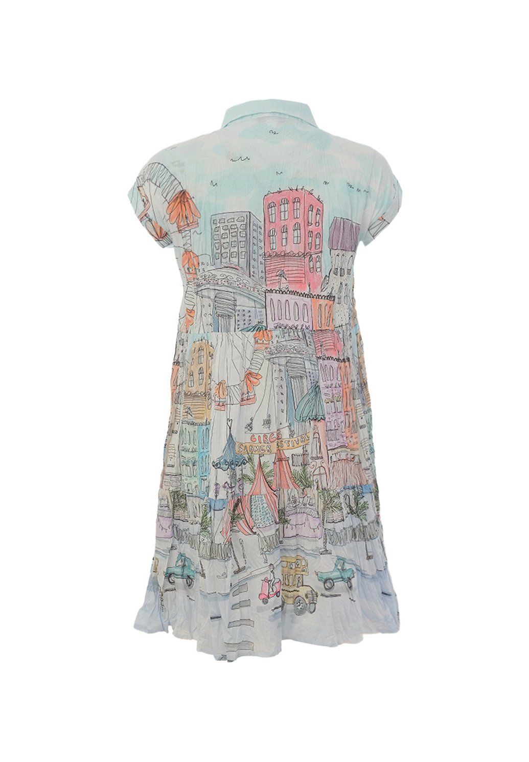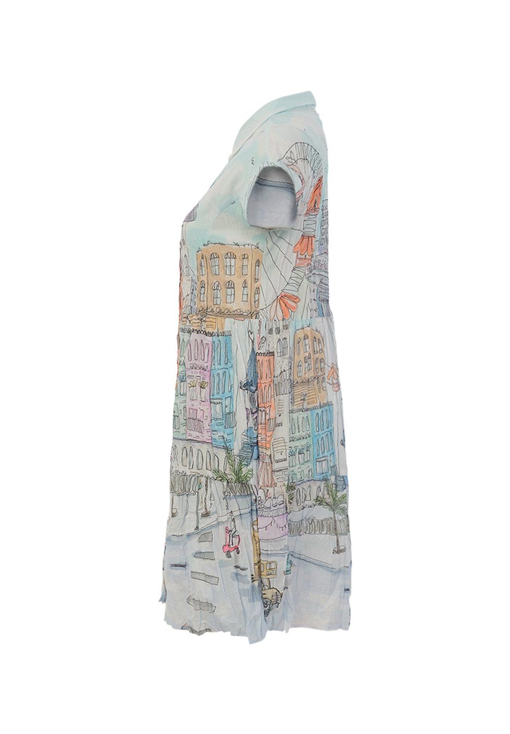 Dámské šaty s originálním ilustrativním potiskem působí hravě, svěže a na první pohled zaujmou svým uměleckým zpracováním. Lehké bílé provedení doplňuje barevný motiv městských scenérií, který dodává modelu jedinečný a velmi nápaditý vzhled. Volnější střih, krátký rukáv a pohodlná kratší délka zajišťují příjemné nošení během teplých dnů, zatímco vzdušný materiál podtrhuje jejich letní charakter. Ideální volba do města, na dovolenou i pro chvíle, kdy chcete vyniknout originálním a stylovým outfitem.