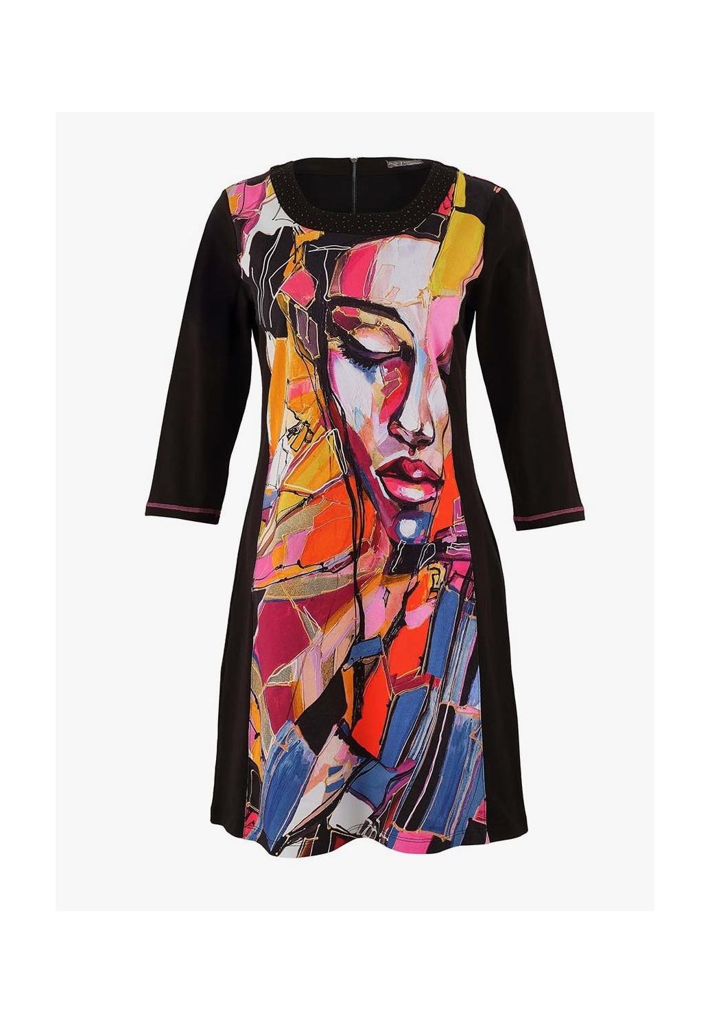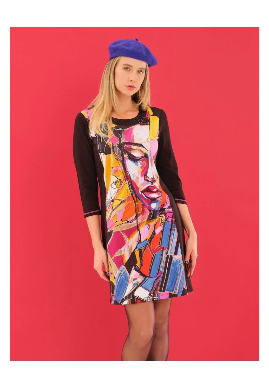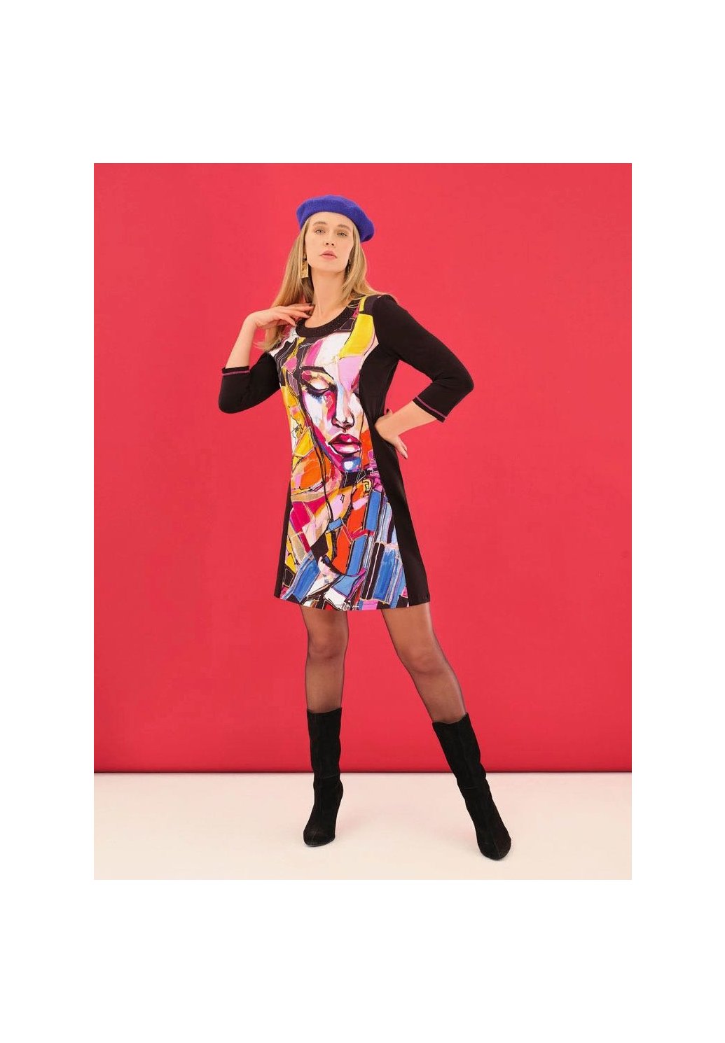 Výjimečné šaty z pohodlné směsi bavlny s uměleckým barevným motivem s portrétem, inspirovaným tvorbou umělkyně Lany Frey z Prahy. Kulatý výstřih s ozdobnými detaily, kontrastní boční panely pro lichotivou siluetu a 3/4 rukávy dodávají elegantní vzhled. Pružný materiál zajišťuje maximální pohodlí a skvělý střih. Jedinečný kousek „nositelného umění“, který rozzáří váš šatník.