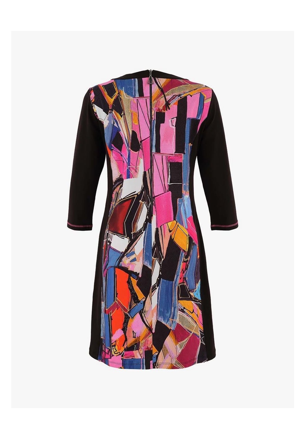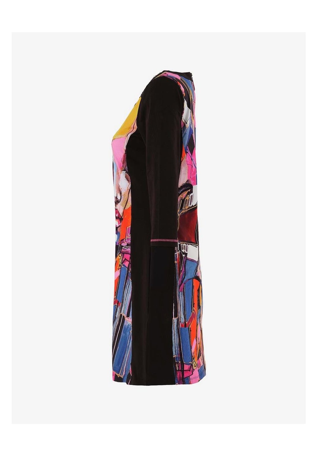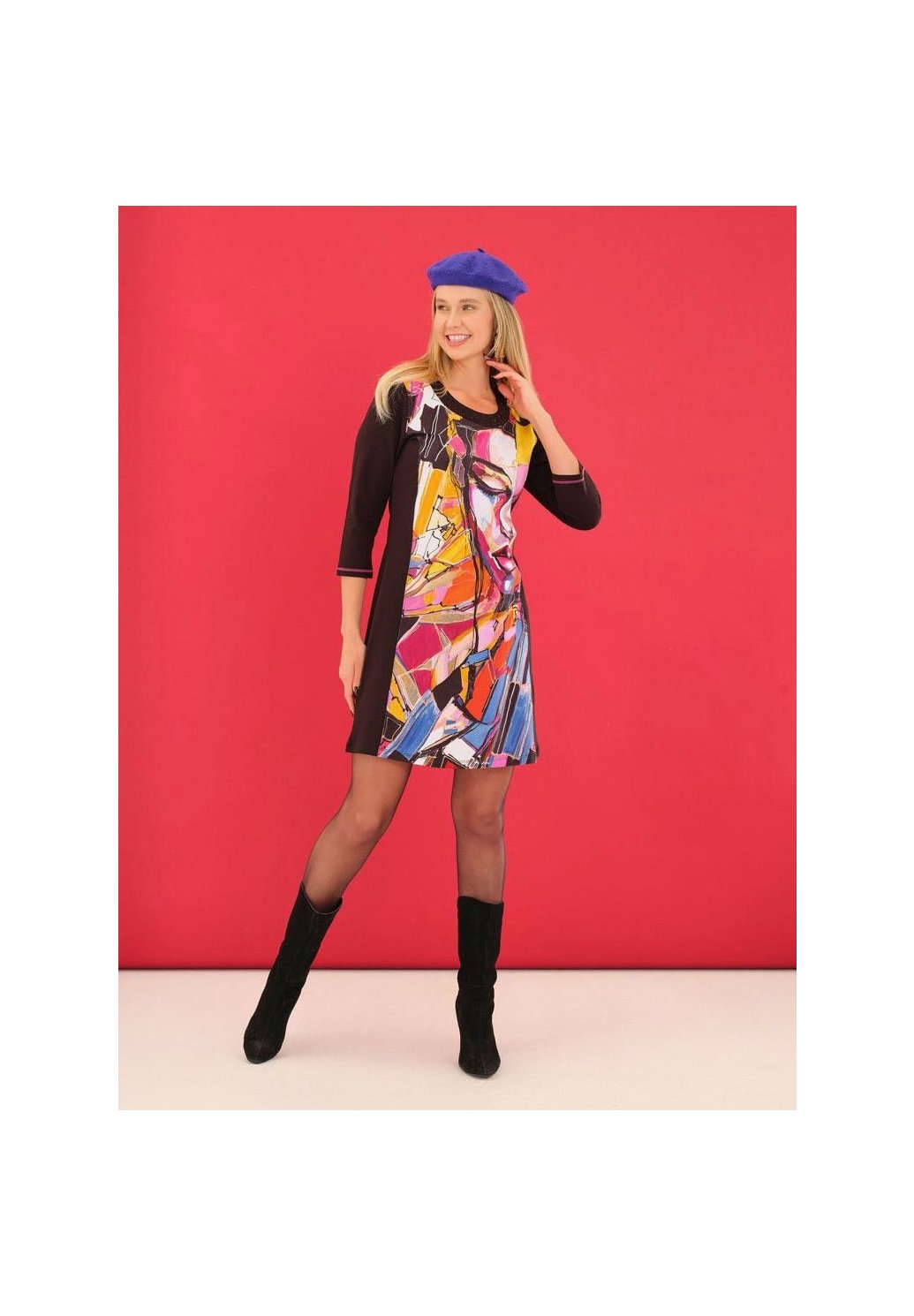 Výjimečné šaty z pohodlné směsi bavlny s uměleckým barevným motivem s portrétem, inspirovaným tvorbou umělkyně Lany Frey z Prahy. Kulatý výstřih s ozdobnými detaily, kontrastní boční panely pro lichotivou siluetu a 3/4 rukávy dodávají elegantní vzhled. Pružný materiál zajišťuje maximální pohodlí a skvělý střih. Jedinečný kousek „nositelného umění“, který rozzáří váš šatník.