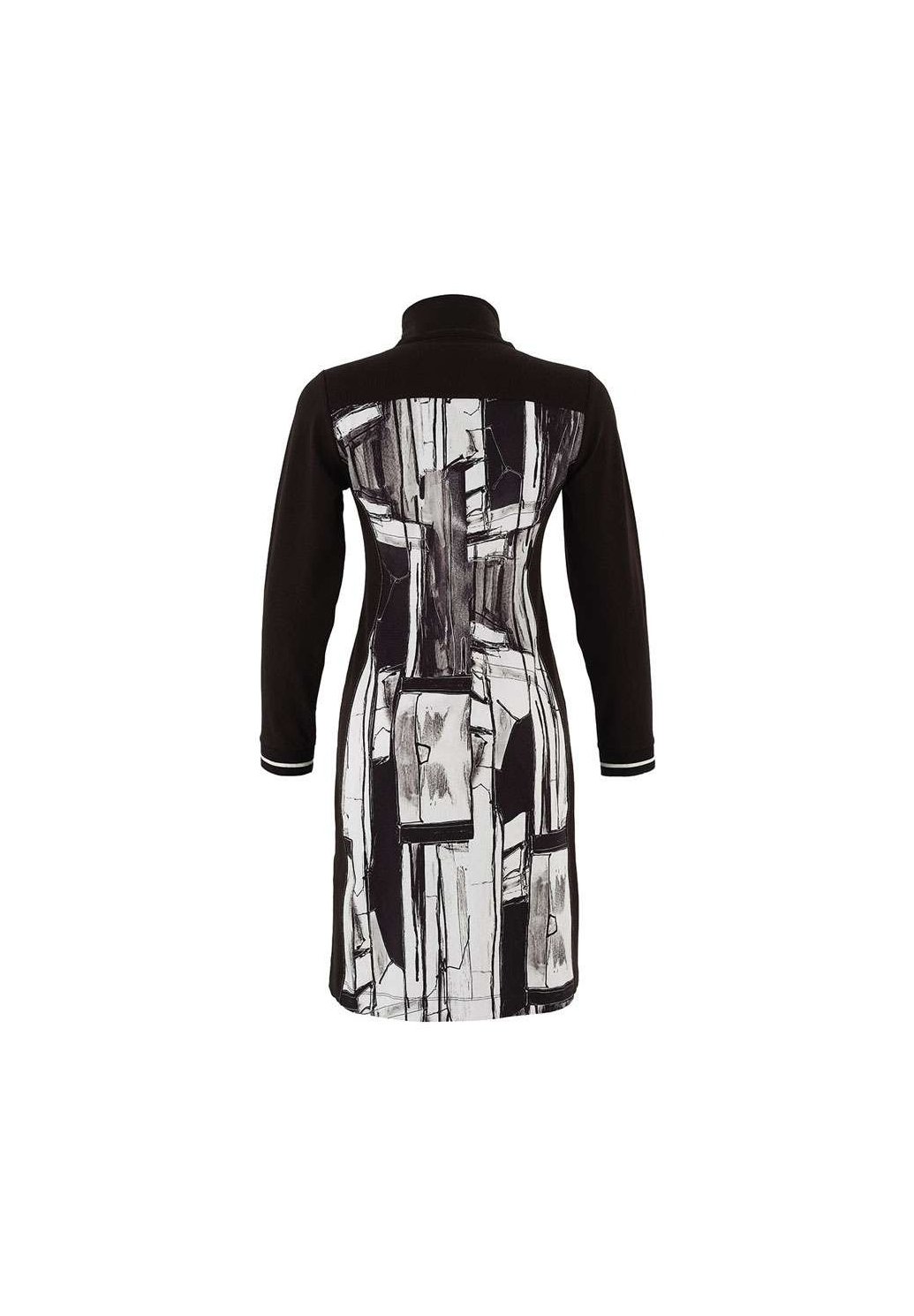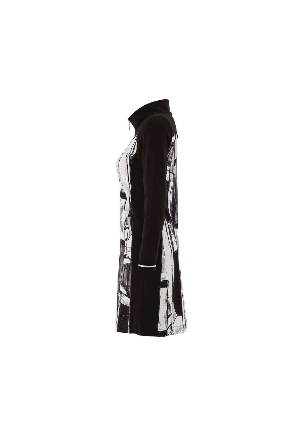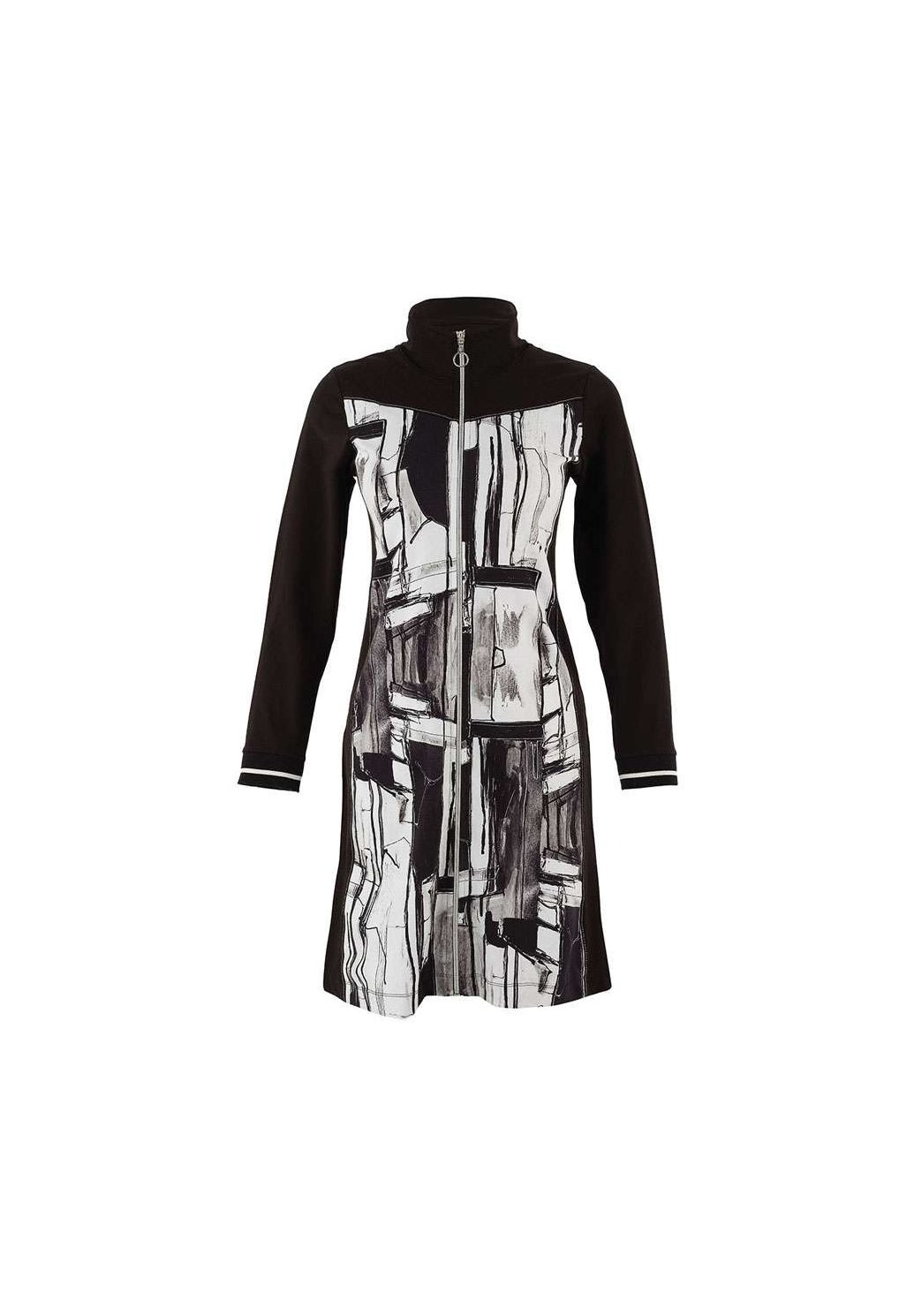 Elegantní a moderní šaty s výrazným černobílým abstraktním potiskem „Baisti“ od umělkyně Lany Frey. Přiléhavý střih z pohodlného, pružného bavlněného materiálu lichotí postavě, černé boční panely opticky zeštíhlují. Černý stojáček se stříbrným zipem po celé délce dodává sportovně-elegantní nádech. Dlouhé černé rukávy zakončené pružnými žebrovanými manžetami s bílým proužkem. Rovný spodní lem, bez kapes, bez podšívky.