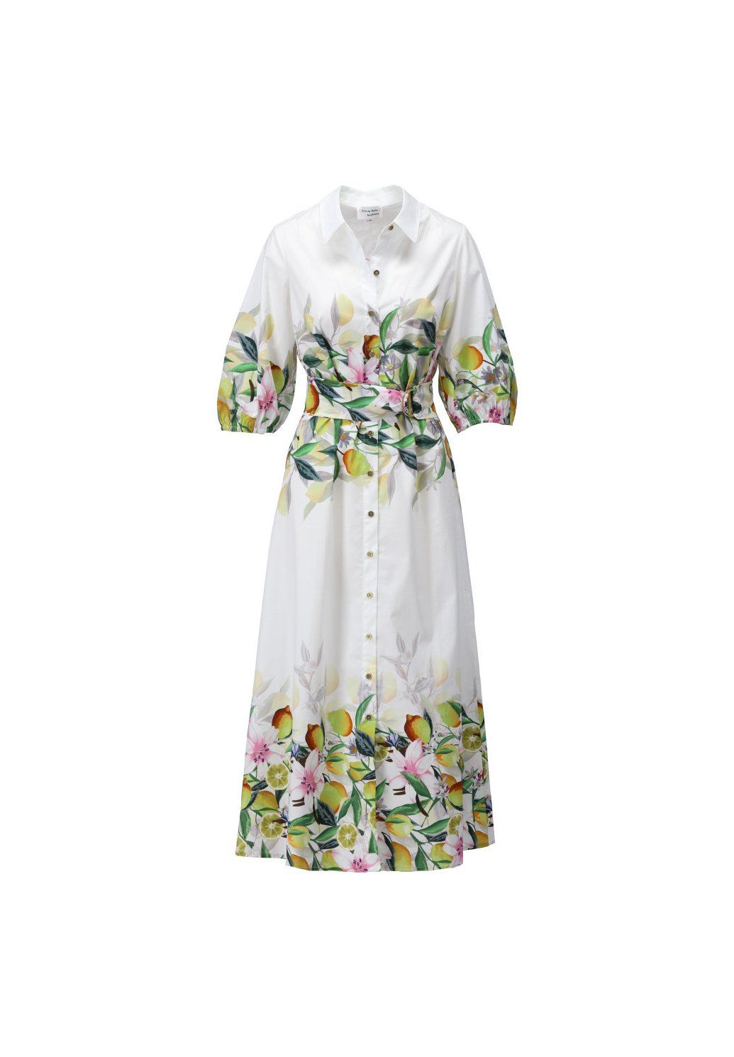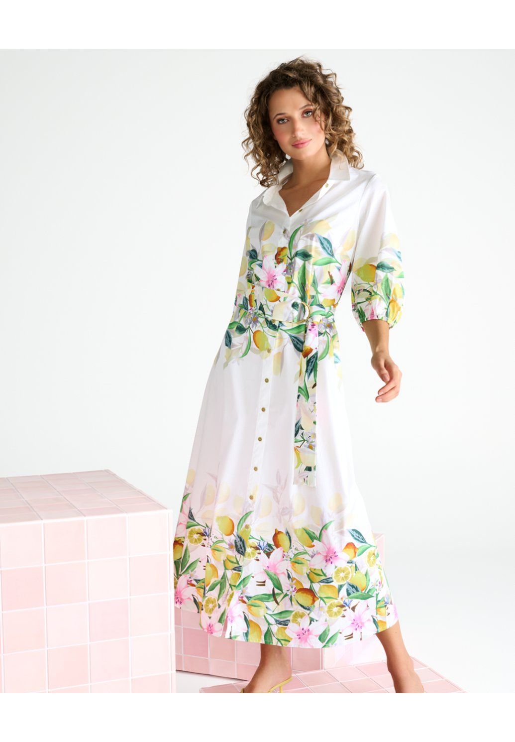 Dlouhé košilové šaty s jemným citronovo-květinovým vzorem přinášejí svěží letní atmosféru do každého dne. Elegantní střih s límečkem a celopropínacím zapínáním působí nadčasově, zatímco pásek v pase krásně zvýrazní siluetu. Lehce nabírané rukávy dodávají šatům ženskost a vzdušnost. Příjemný, lehký materiál zajišťuje maximální komfort i během teplých dnů. Perfektní volba na dovolenou, do města i na letní oslavy, když chcete zazářit svěžím a romantickým stylem.