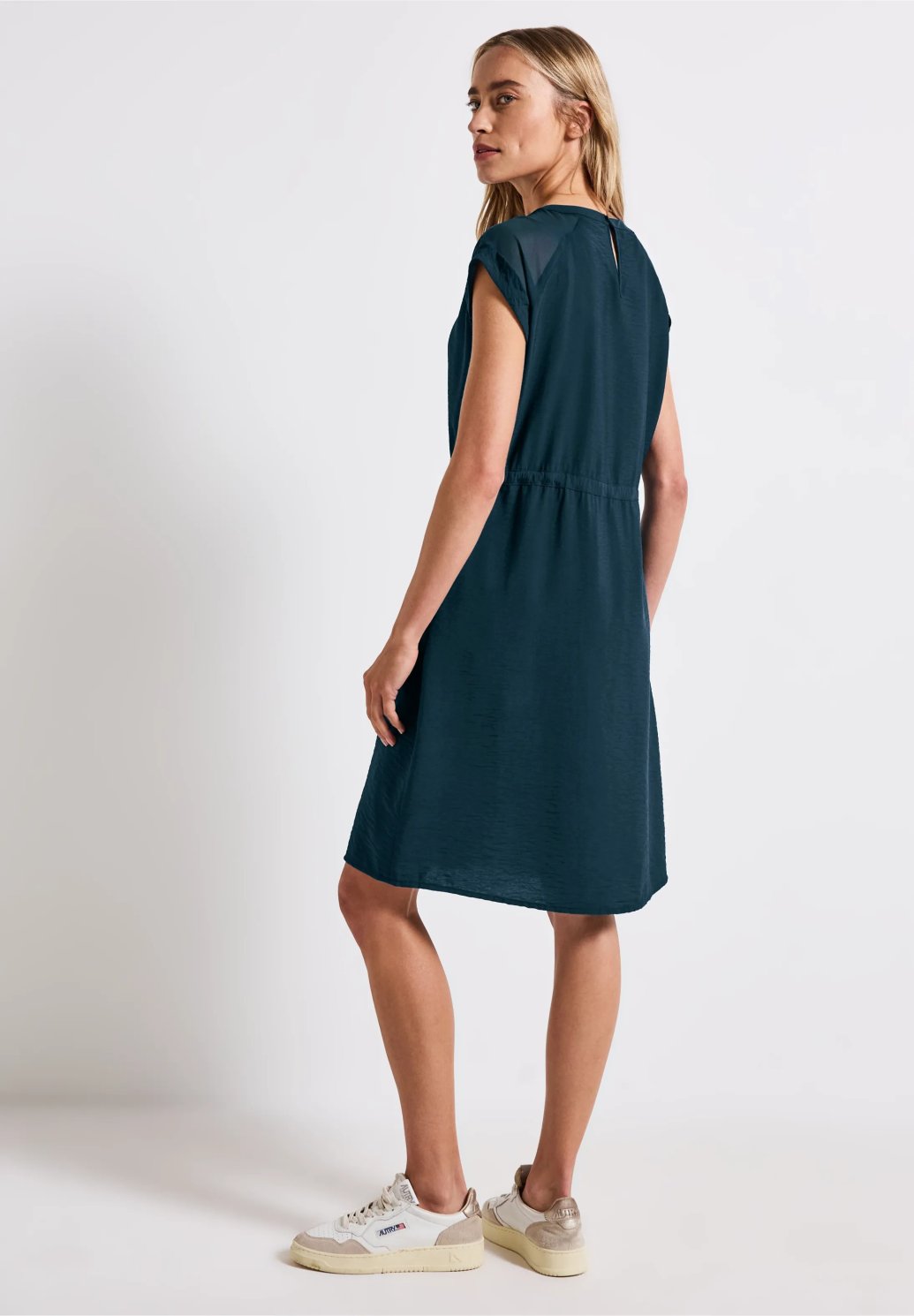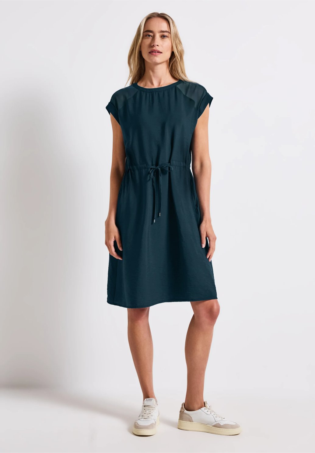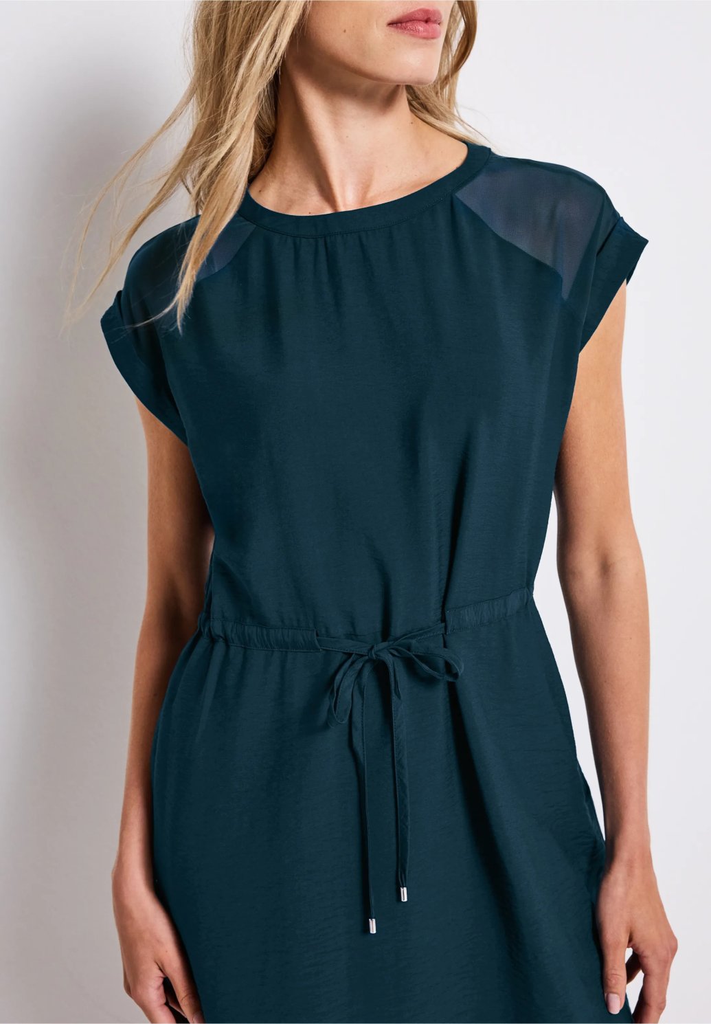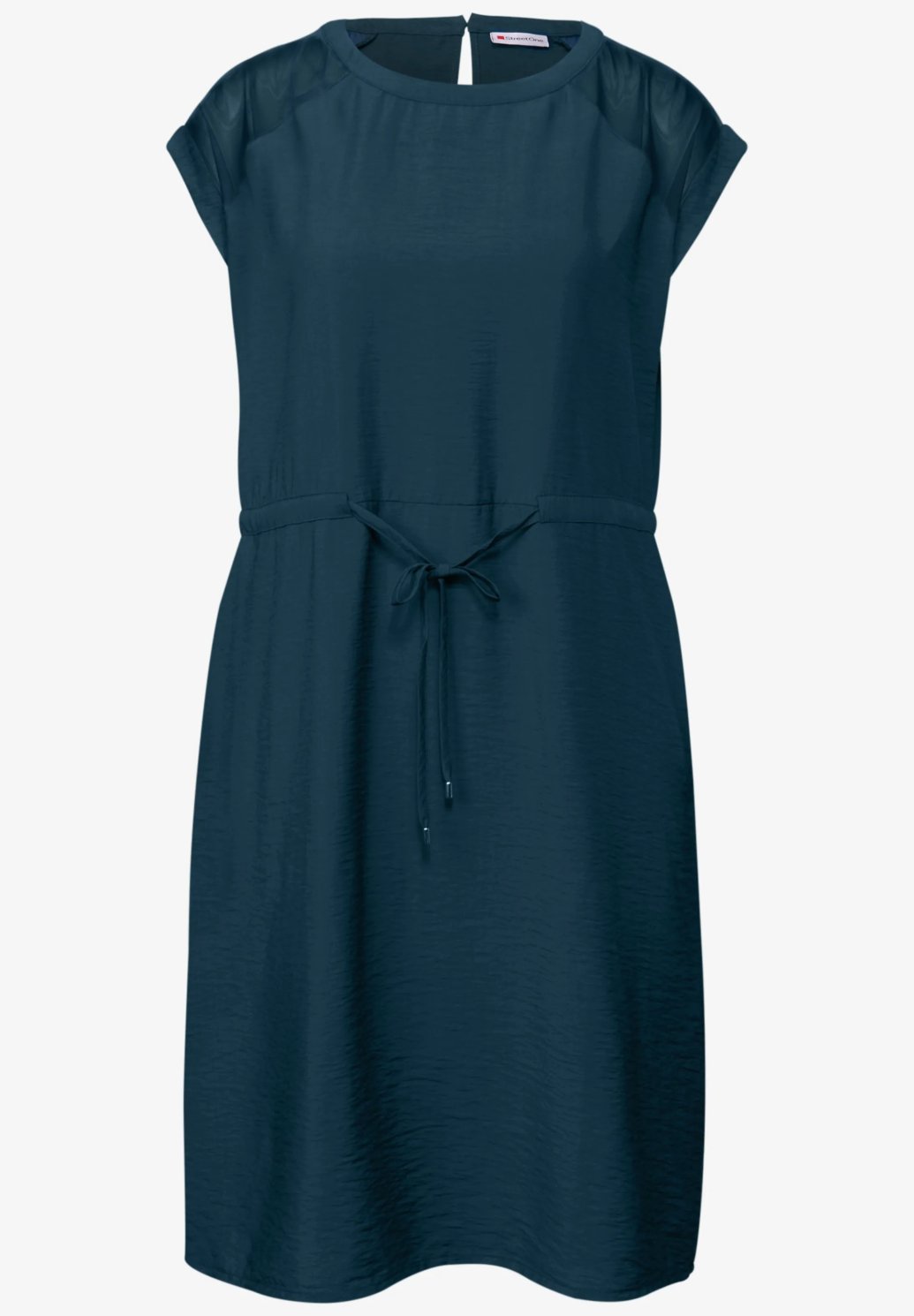 Tyto šaty od Street One pro ženy sahající až ke kolenům zaujmou sofistikovanými síťovanými detaily a funkčními prvky. Kulatý výstřih, krátké rukávy a stahovací šňůrka v pase zajišťují dokonalý střih. Boční kapsy dělají z těchto šatů praktického společníka pro ležérní letní outfity.