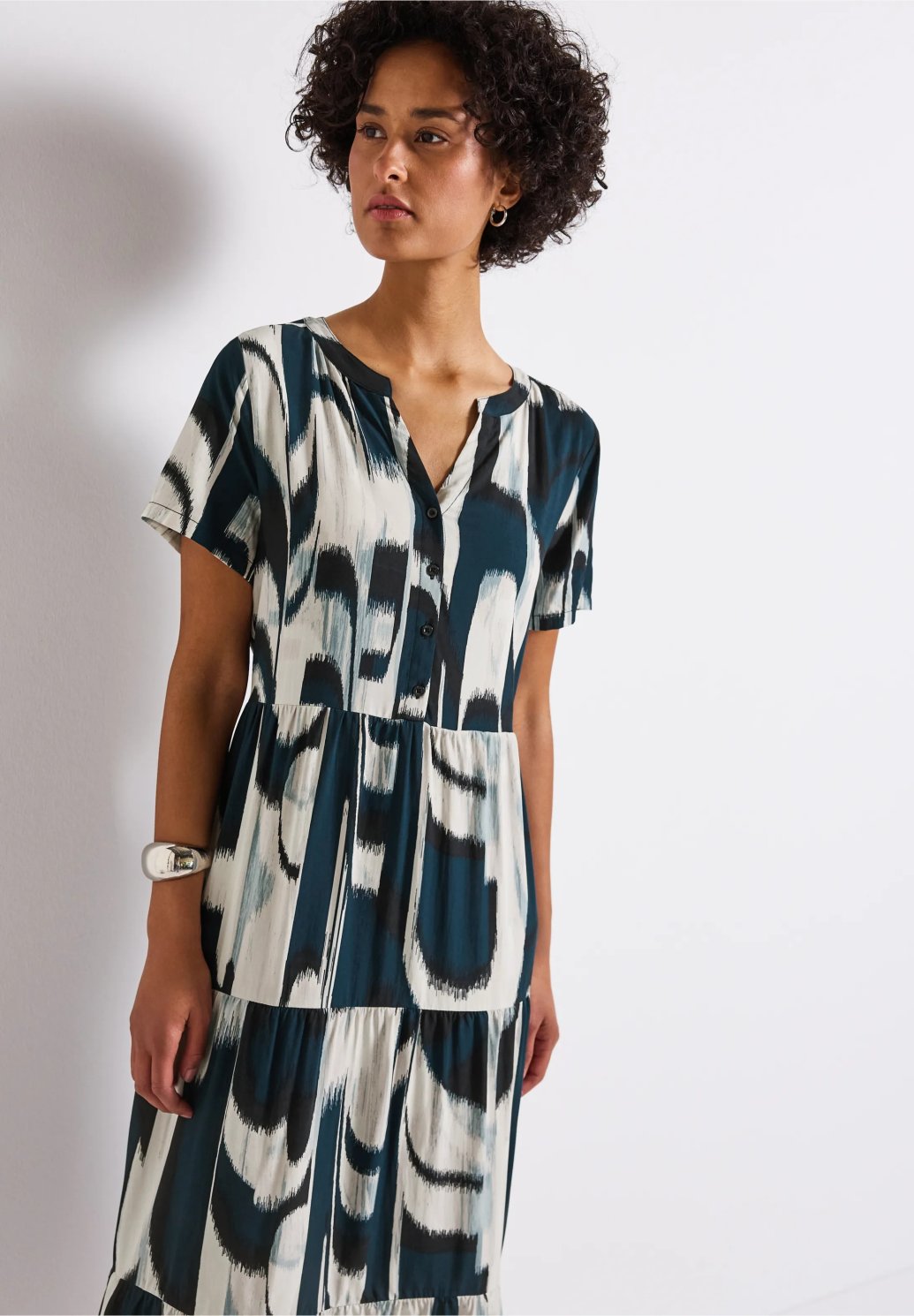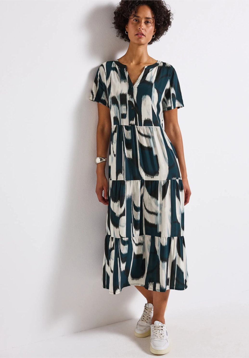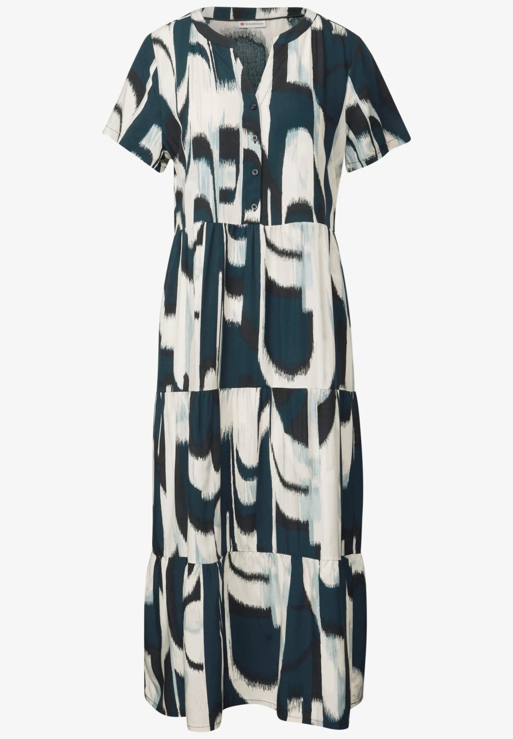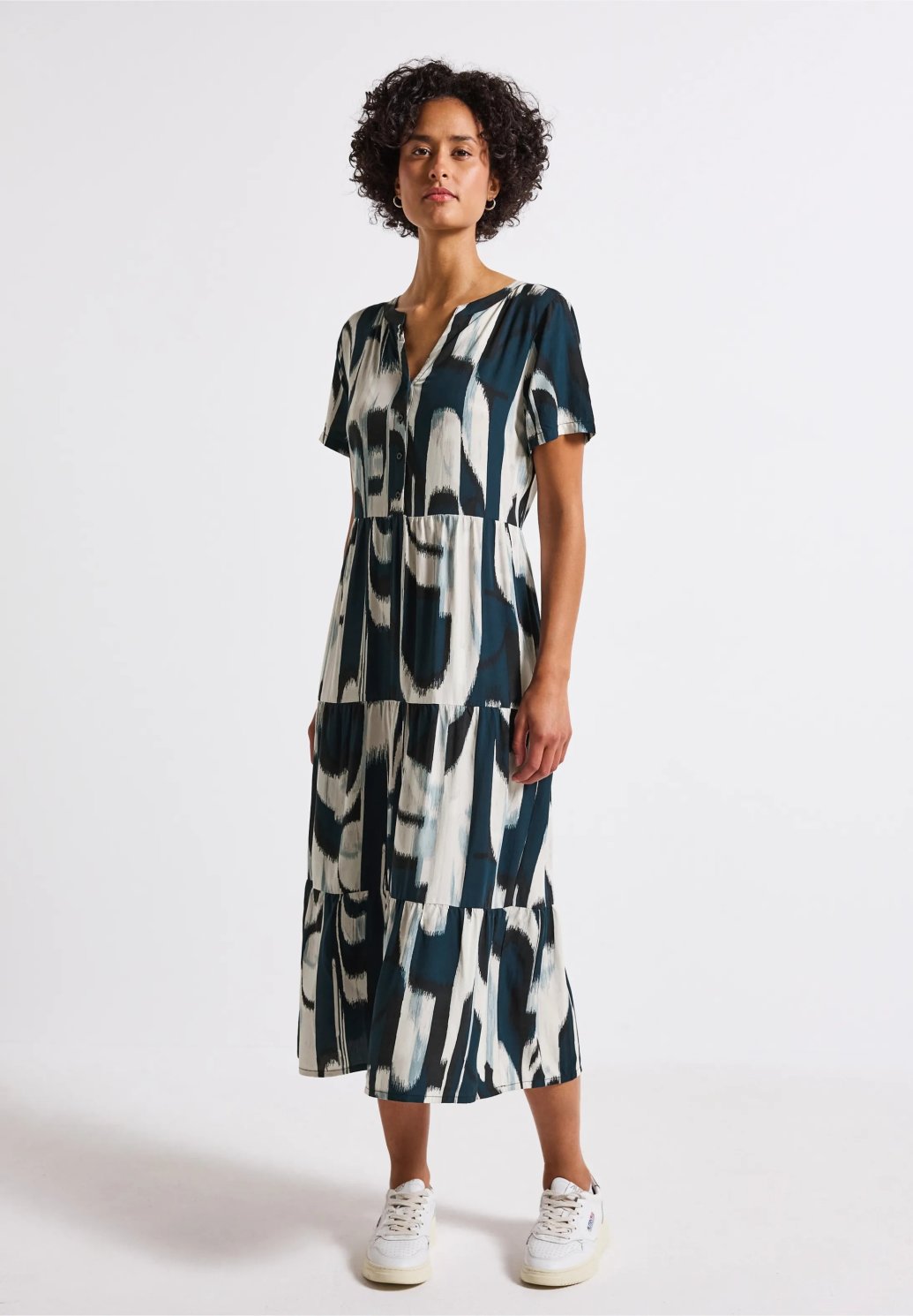 Tyto ženské volánové šaty od Street One pro ženy zaujmou svým splývavým splývavým lemováním a grafickým vzorem po celé délce. Rozparkový výstřih s ozdobným zapínáním na knoflíky dodává šatům stylový akcent, zatímco měkká viskóza je příjemná na dotek. Délka midi a krátké rukávy z nich činí ideálního společníka na letní dny.