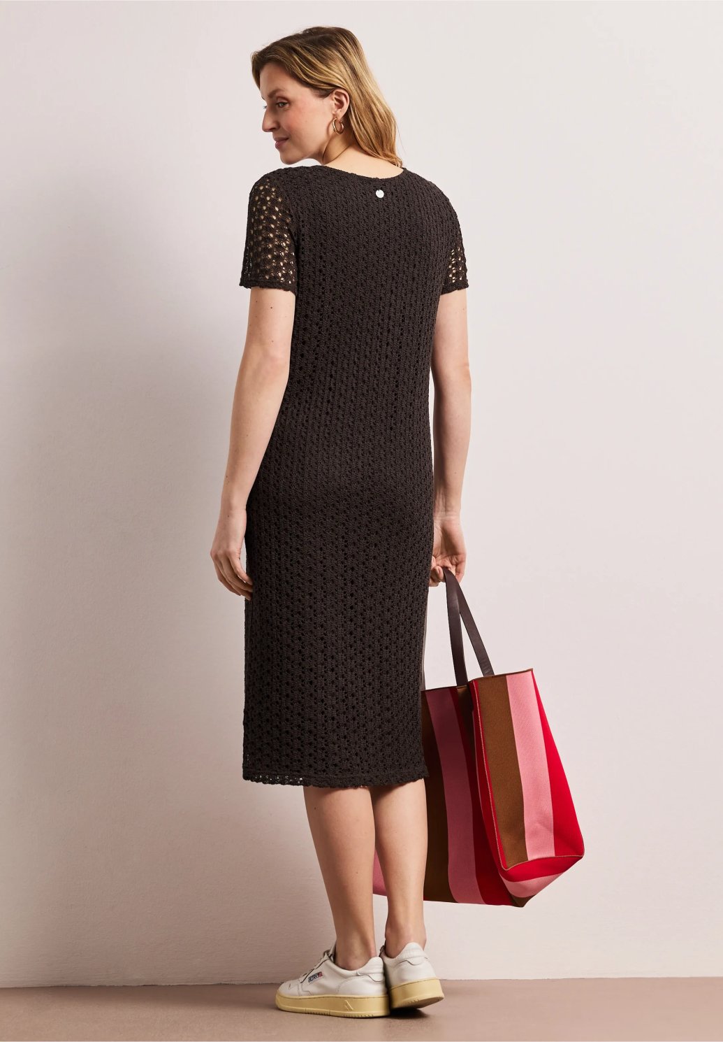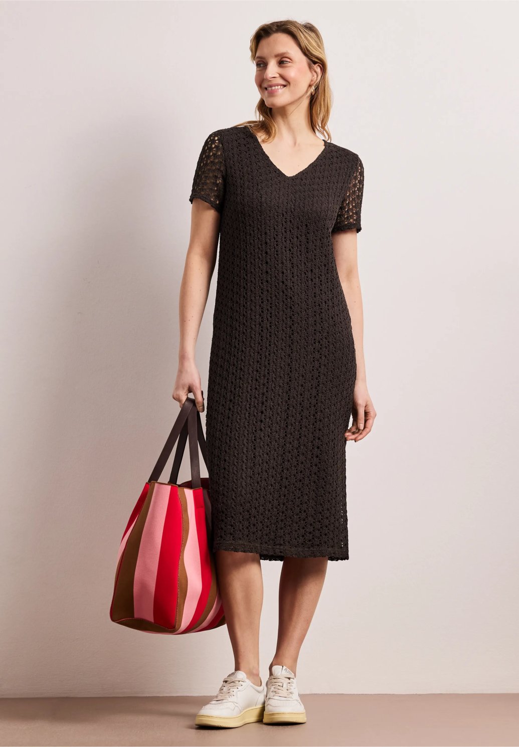 Elegantní dámské šaty s jemnou krajkovou strukturou jsou nadčasovým kouskem, který dodá vašemu outfitu ženskost a sofistikovaný styl. Pohodlný střih s krátkým rukávem a výstřihem do „V“ krásně sedí na postavě a zajišťuje příjemné nošení po celý den. Šaty jsou ideální jak pro každodenní nošení, tak pro společenské příležitosti – stačí je doplnit teniskami pro ležérní look nebo lodičkami pro elegantnější outfit.
