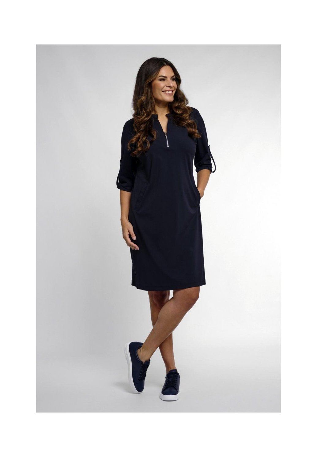 Tyto ležérní šaty od Zoso v krásné barvě NIGHT BLUE budou všestranným doplňkem vašeho šatníku. Šaty mají regular střih a jsou vyrobeny z 84 % polyamidu a 16 % elastanu, což vytváří pohodlný a mírně pružný materiál s dokonalým splýváním. Délka midi a krátké rukávy činí tento oděv vhodným na jaro, zatímco praktické boční kapsy jsou funkčním a stylovým detailem. Šaty mají elegantní výstřih do V a decentní zapínání na zip, díky kterému se snadno oblékají a svlékají. Ať už máte relaxační den nebo jdete na oběd, tyto šaty od Zoso vždy nabízejí stylový vzhled. Noste je s teniskami pro ležérní vzhled nebo je zkombinujte se sandály pro formálnější příležitost. Nadčasový odstín půlnoční modři usnadňuje kombinaci s řadou doplňků.