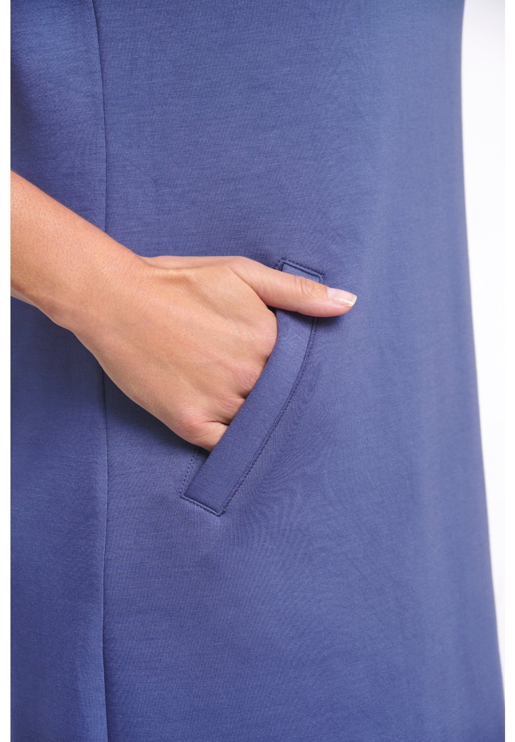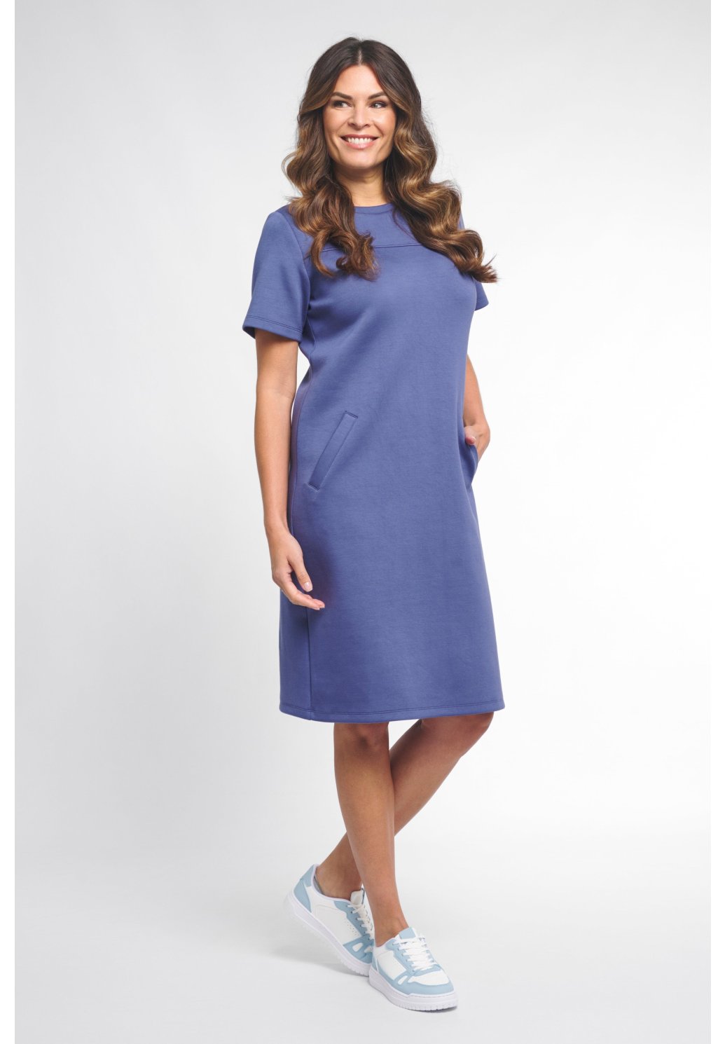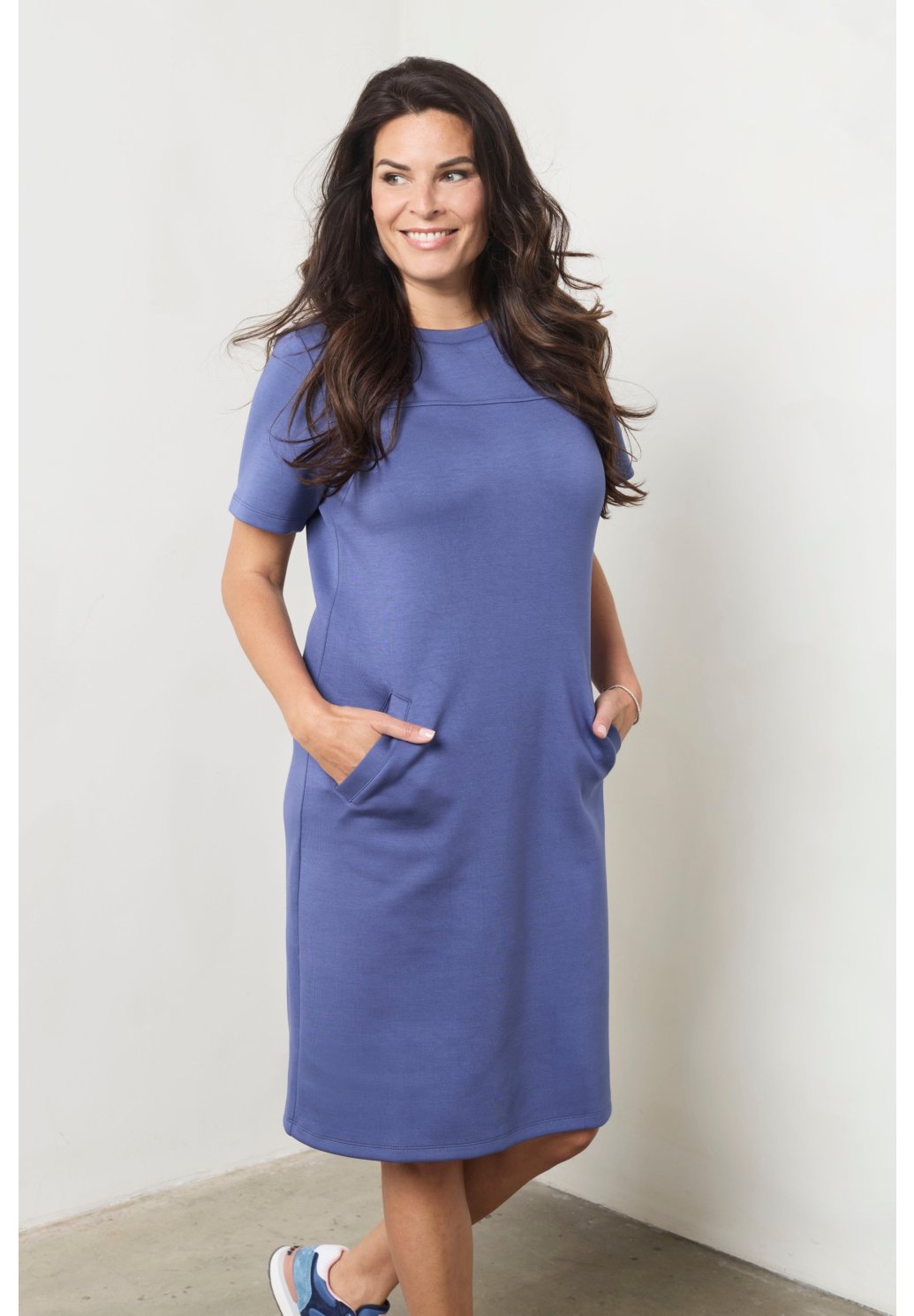 Modré šaty Femmz jsou pohodlné žerzejové šaty se sportovním nádechem. Rovný střih, krátké rukávy a jemné švy vytvářejí moderní, minimalistický vzhled.