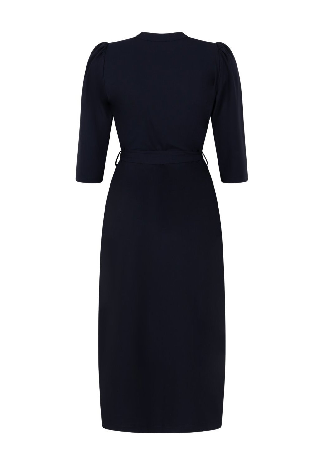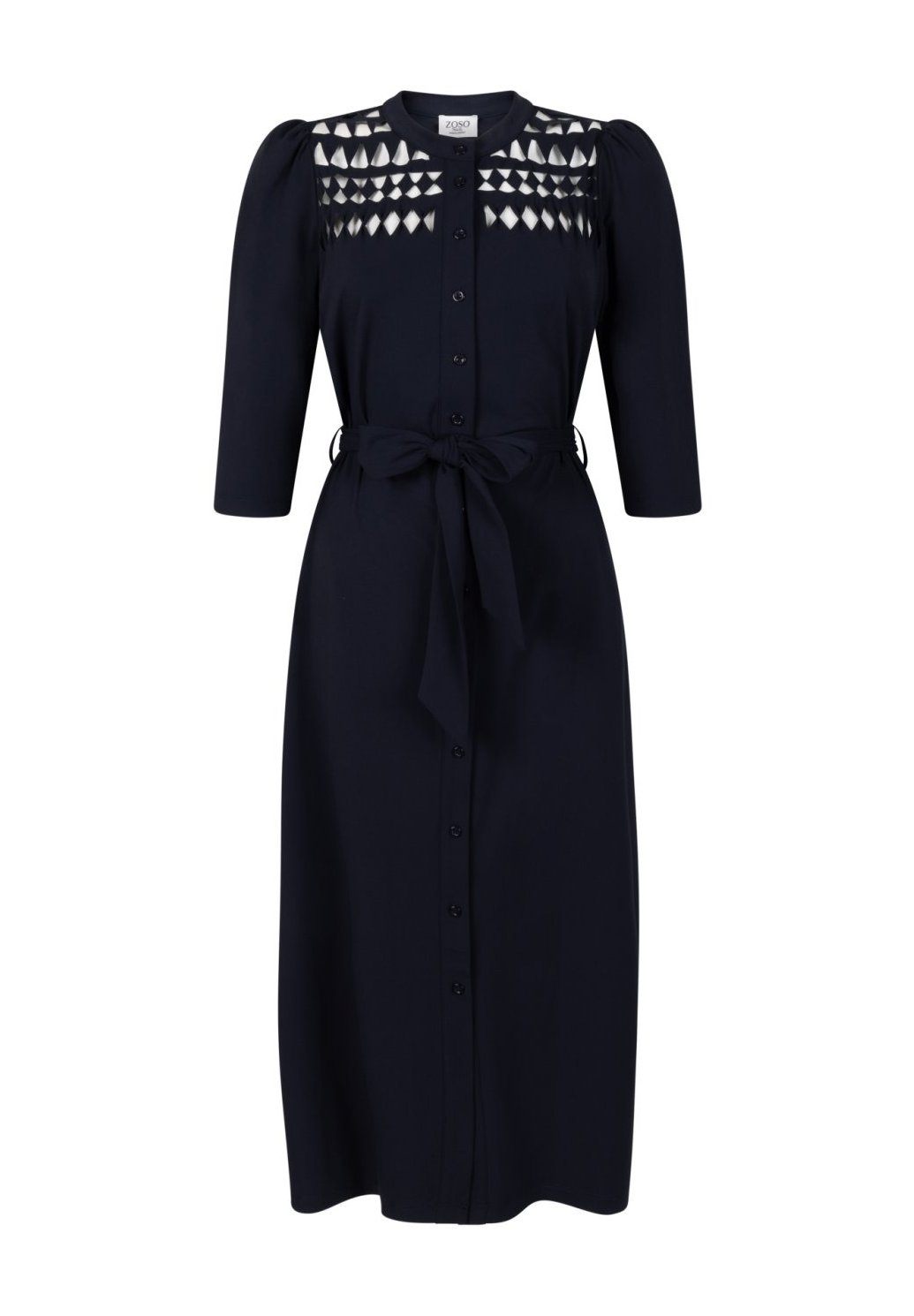 Dámské košilové šaty v elegantní tmavě modré barvě jsou nadčasovým kouskem, který využijete do práce i na společenské příležitosti. Mají klasický límeček a knoflíkovou légu po celé délce, což jim dodává upravený a sofistikovaný vzhled. V horní části zaujmou jemnými průstřihy, které modelu dodávají lehkost a originalitu. Tříčtvrteční rukávy působí velmi žensky a jsou ideální pro celoroční nošení. Rovný střih doplňuje vázačka v pase, díky které si snadno zvýrazníte siluetu podle potřeby. Midi délka pod kolena působí elegantně a lichotivě. Šaty jsou vyrobeny z příjemného, pružného materiálu, který zajišťuje maximální komfort při nošení po celý den.