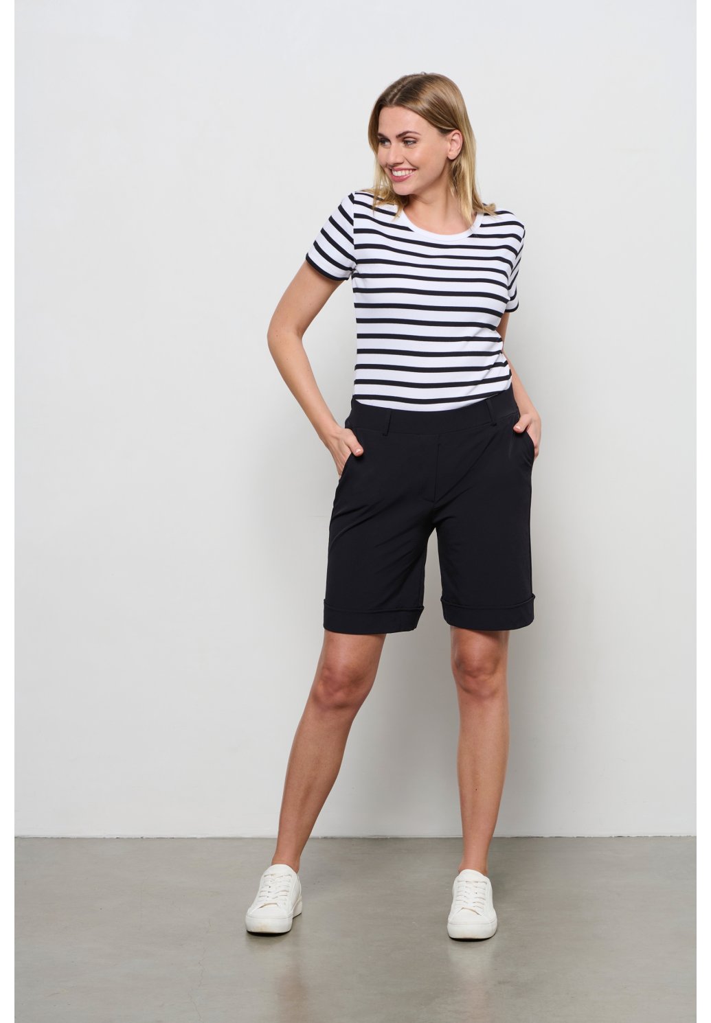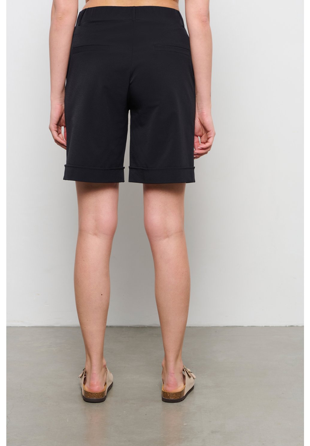 Tyto elegantní dámské bermudy jsou ideální volbou pro pohodlné a stylové nošení nejen na cestách. Jsou ušity z lehké a nemačkavé cestovní látky, která se snadno udržuje a příjemně nosí i v teplejších dnech. Přední část zdobí praktické boční kapsy, zadní díl doplňuje dekorativní falešná výpustková kapsa. Kraťasy mají hladký pas s elastickým zadním dílem, který zajišťuje volnost pohybu a skvěle padnoucí střih