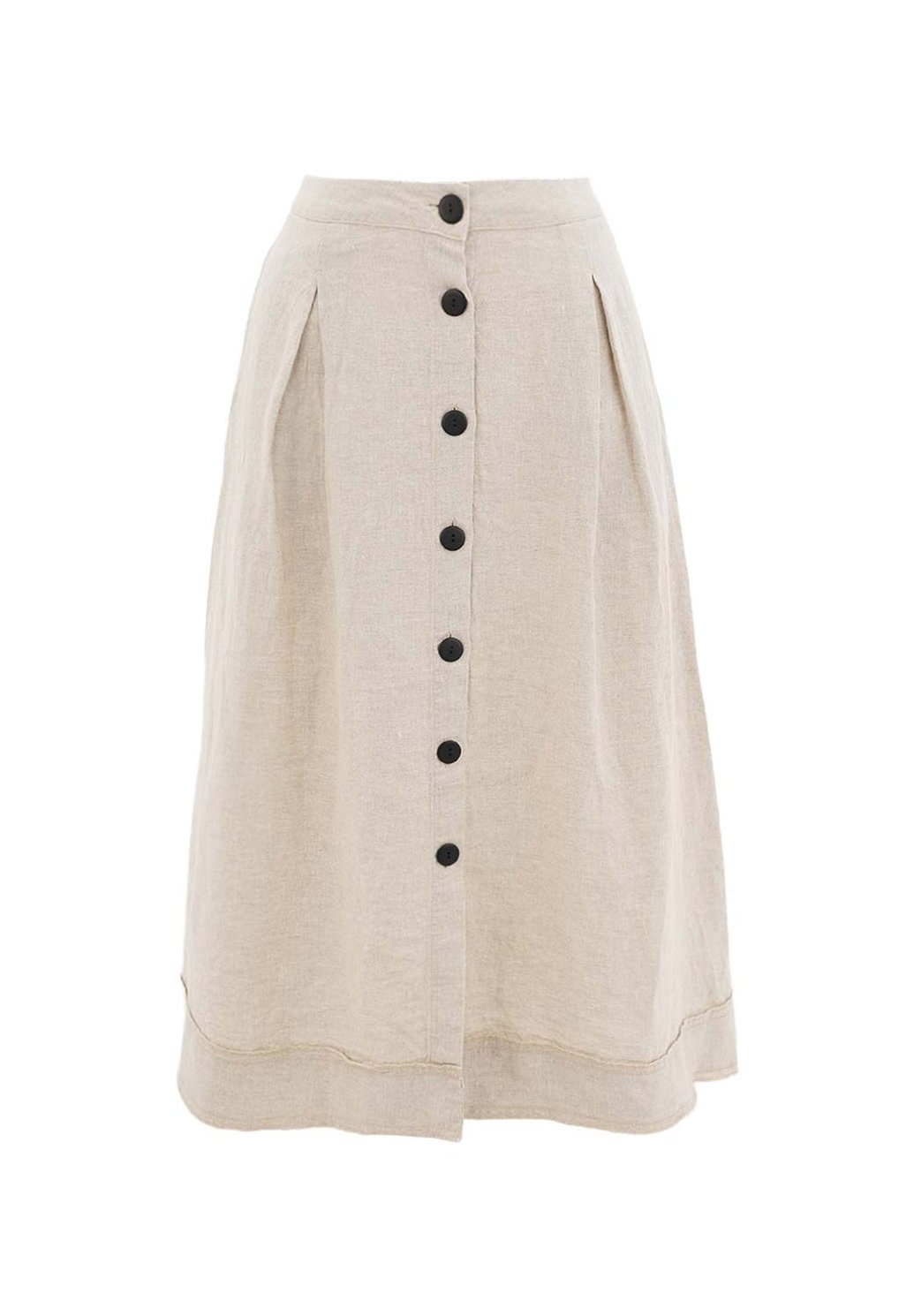 Dámská sukně v přírodní béžové barvě zaujme svým jednoduchým a elegantním stylem. Má pohodlný střih do A, zapínání na knoflíky po celé přední délce a jemné sklady, které dodávají sukni krásný tvar. Díky nadčasovému designu se skvěle kombinuje s halenkou, tričkem i lehkým svetrem. Ideální volba pro každodenní nošení i letní dny, kdy chcete vypadat stylově a cítit se pohodlně.
