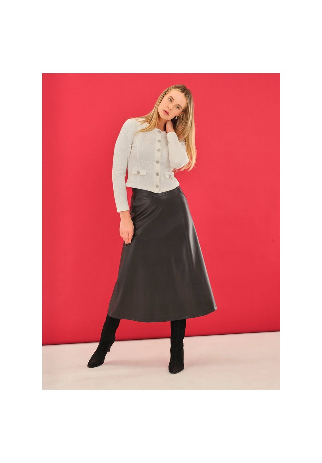 Dámská maxi sukně v koženém vzhledu je odvážný a přitom elegantní kousek, který dodá tvému outfitu šmrnc. Díky hladké linii a maxi délce působí ženským a sofistikovaným dojmem, zatímco kožený efekt materiálu vytváří moderní a sebevědomý vzhled. Snadno ji zkombinuješ s elegantní halenkou i ležérním svetrem a stane se základem tvého šatníku pro všední dny i večerní příležitosti.