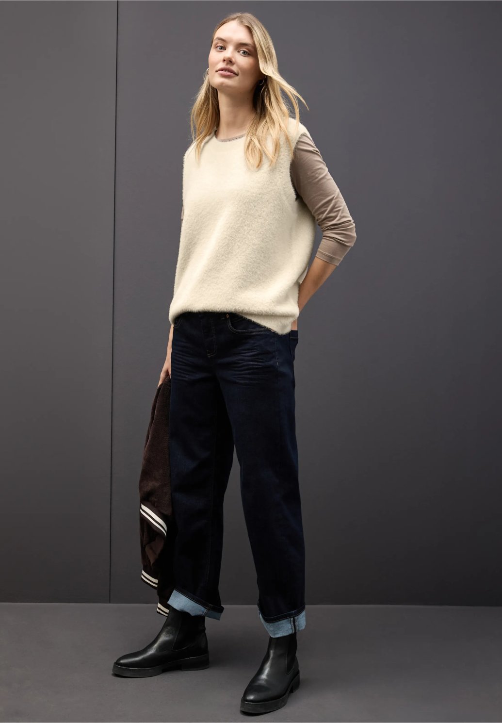 Tento svetr bez rukávů od Street One pro ženy je perfektním doplňkem vašeho vrstveného outfitu. Měkká péřová příze zajišťuje výjimečně útulný pocit, zatímco kulatý výstřih a jednobarevný design ho činí dostatečně všestranným a lze jej kombinovat s dalšími kousky oblečení. Ideální přes halenky nebo košile s dlouhým rukávem.