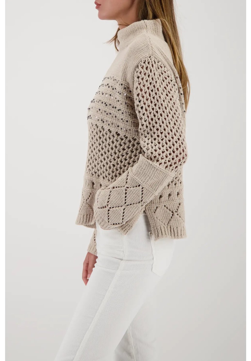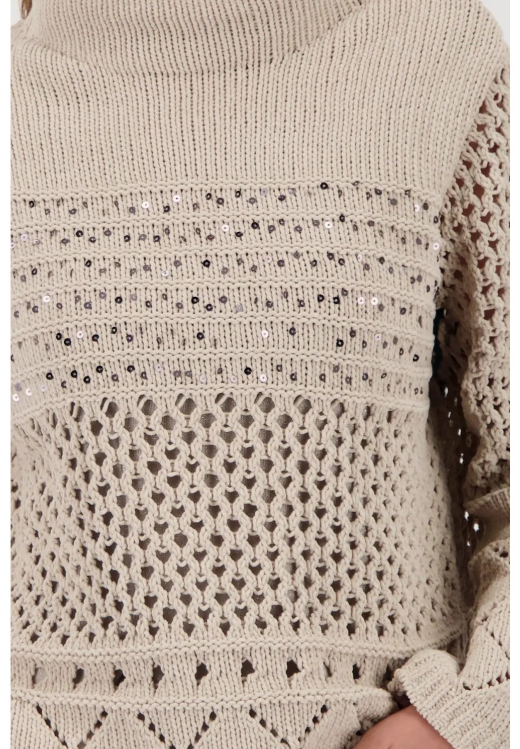 Moderní pletený svetr z měkké žinylkové příze zaujme jemnou strukturou, ajurovým vzorem a decentními flitry, které dodávají modelu elegantní nádech. Má lehce oversized ramena, stojáček, dlouhé rukávy, boční rozparky a všitý top s lurexem, díky čemuž je ideální volbou pro stylové a módně laděné outfity.