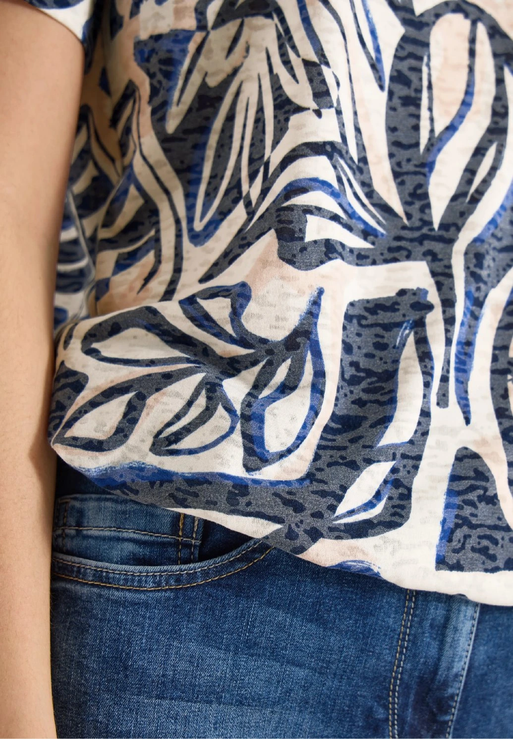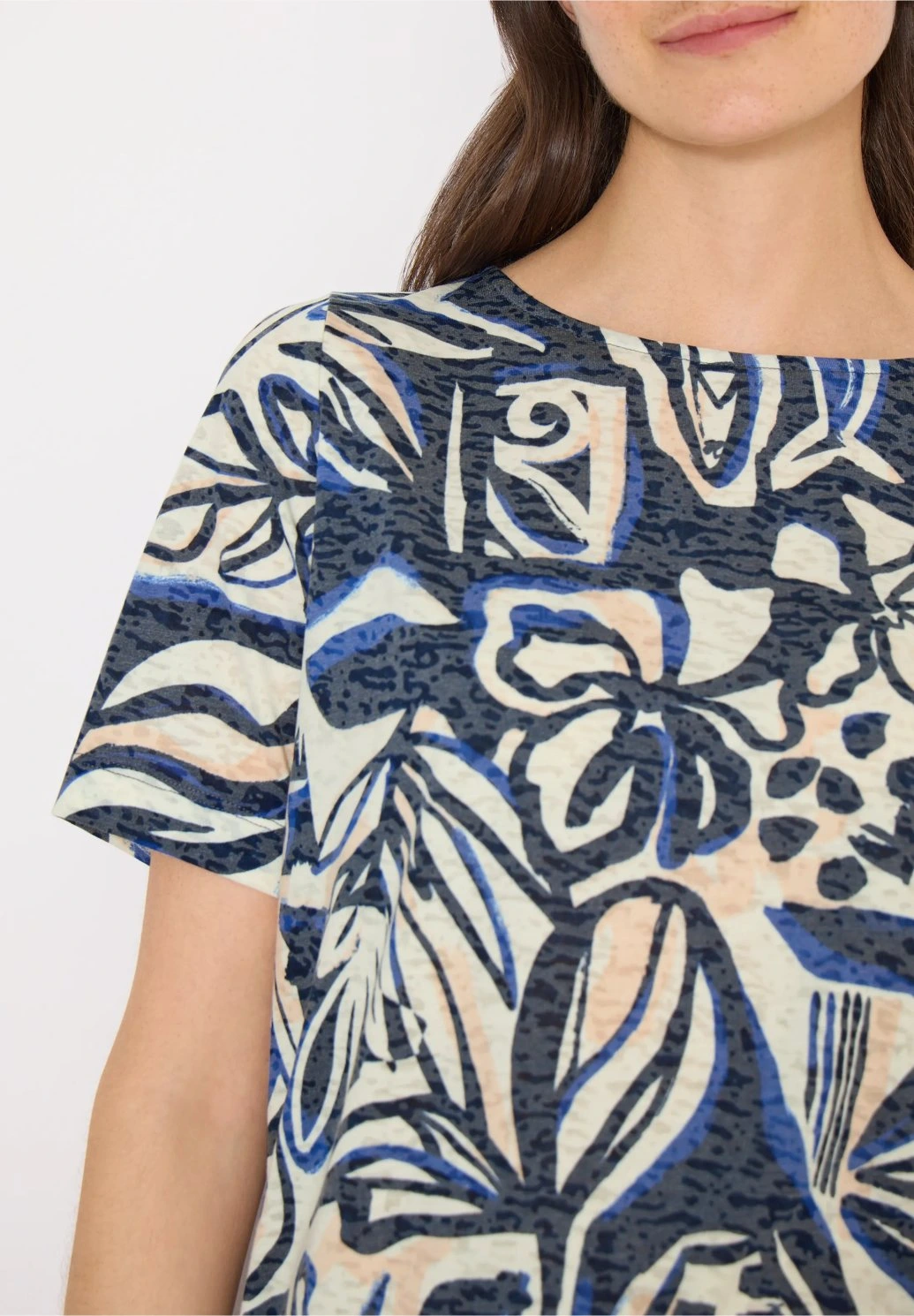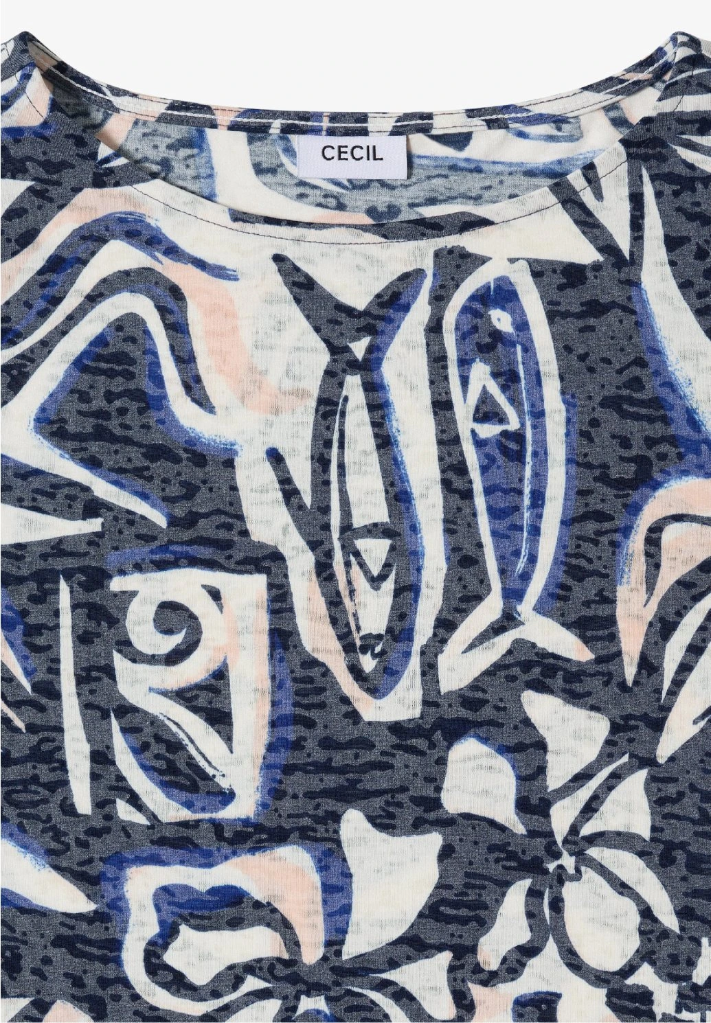 Lehké dámské tričko s krátkým rukávem zaujme moderním vzorem v jemných modrých tónech, který snadno oživí každý outfit. Příjemný materiál zajišťuje pohodlí po celý den a volnější střih lichotí postavě. Skvěle se hodí k džínům, kraťasům i sukni – ideální volba pro volný čas i každodenní nošení.