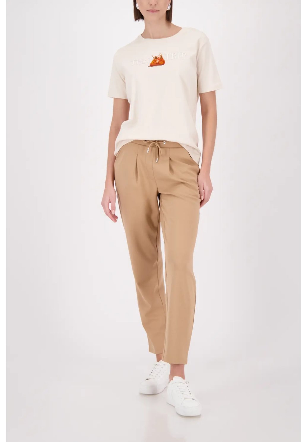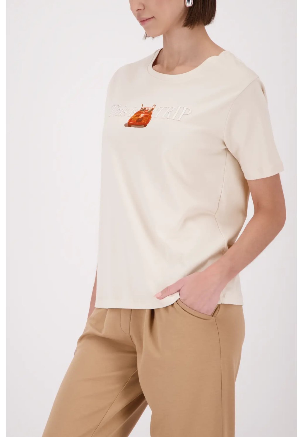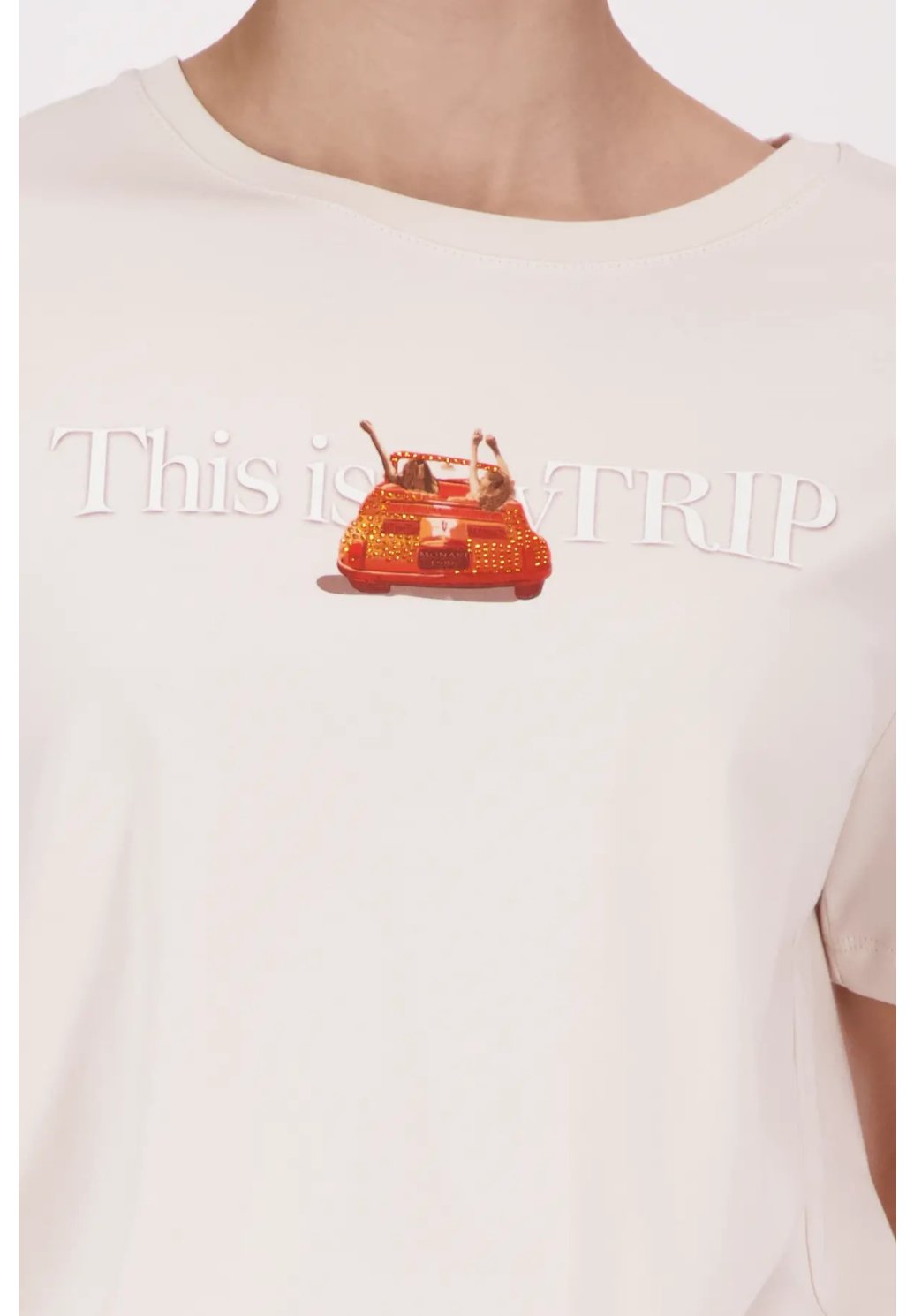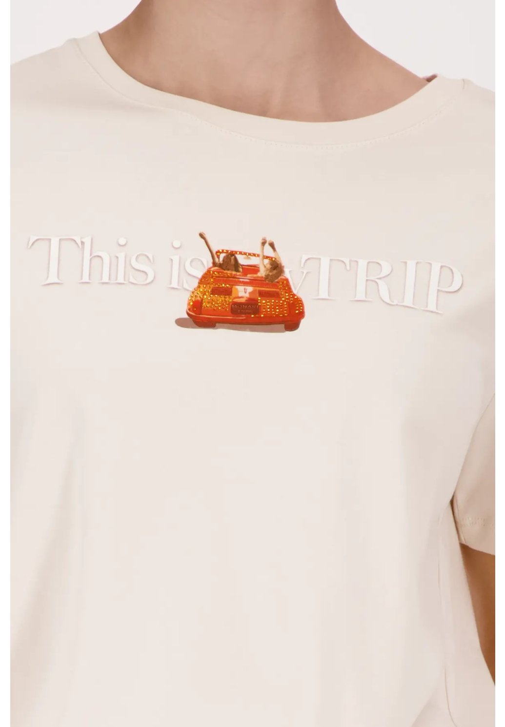 Dámské tričko v jemném béžovém odstínu je ideální volbou pro pohodlný a stylový každodenní outfit. Má klasický rovný střih, krátký rukáv a kulatý výstřih, díky čemuž skvěle sedí a snadno se kombinuje s kalhotami, sukní i džínami. Na přední straně zaujme originální plastický nápis s hravým motivem, který dodává tričku moderní a svěží vzhled. Příjemný, měkký materiál zajišťuje maximální komfort při nošení po celý den. Skvělý kousek pro ležérní i městský styl.