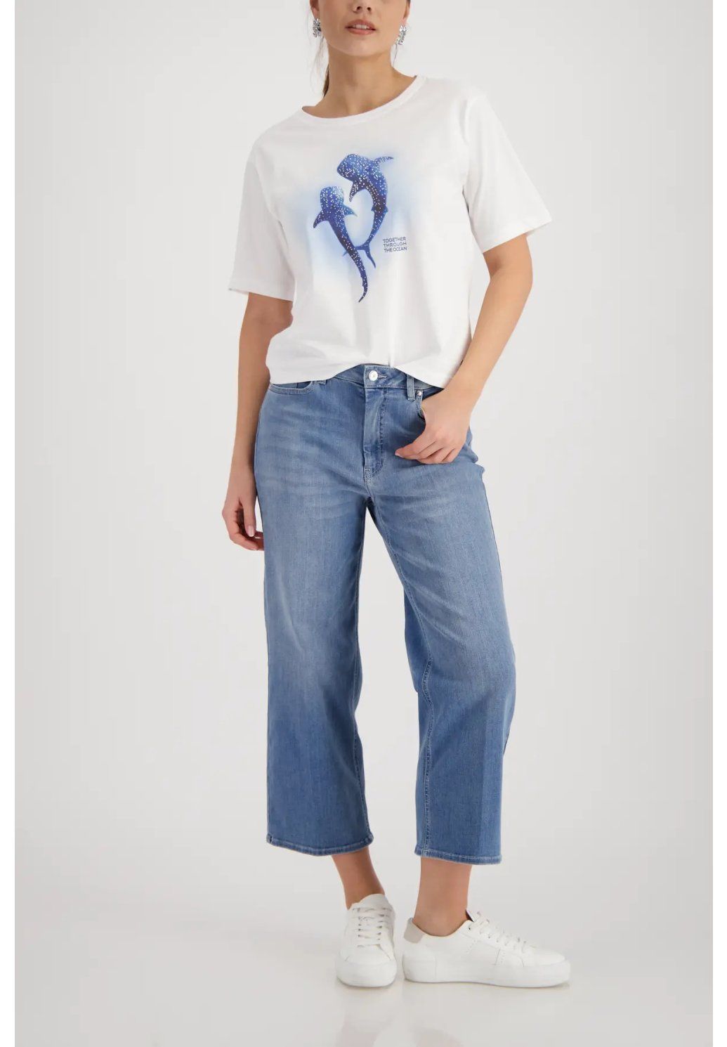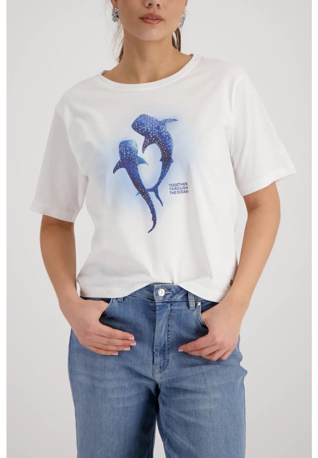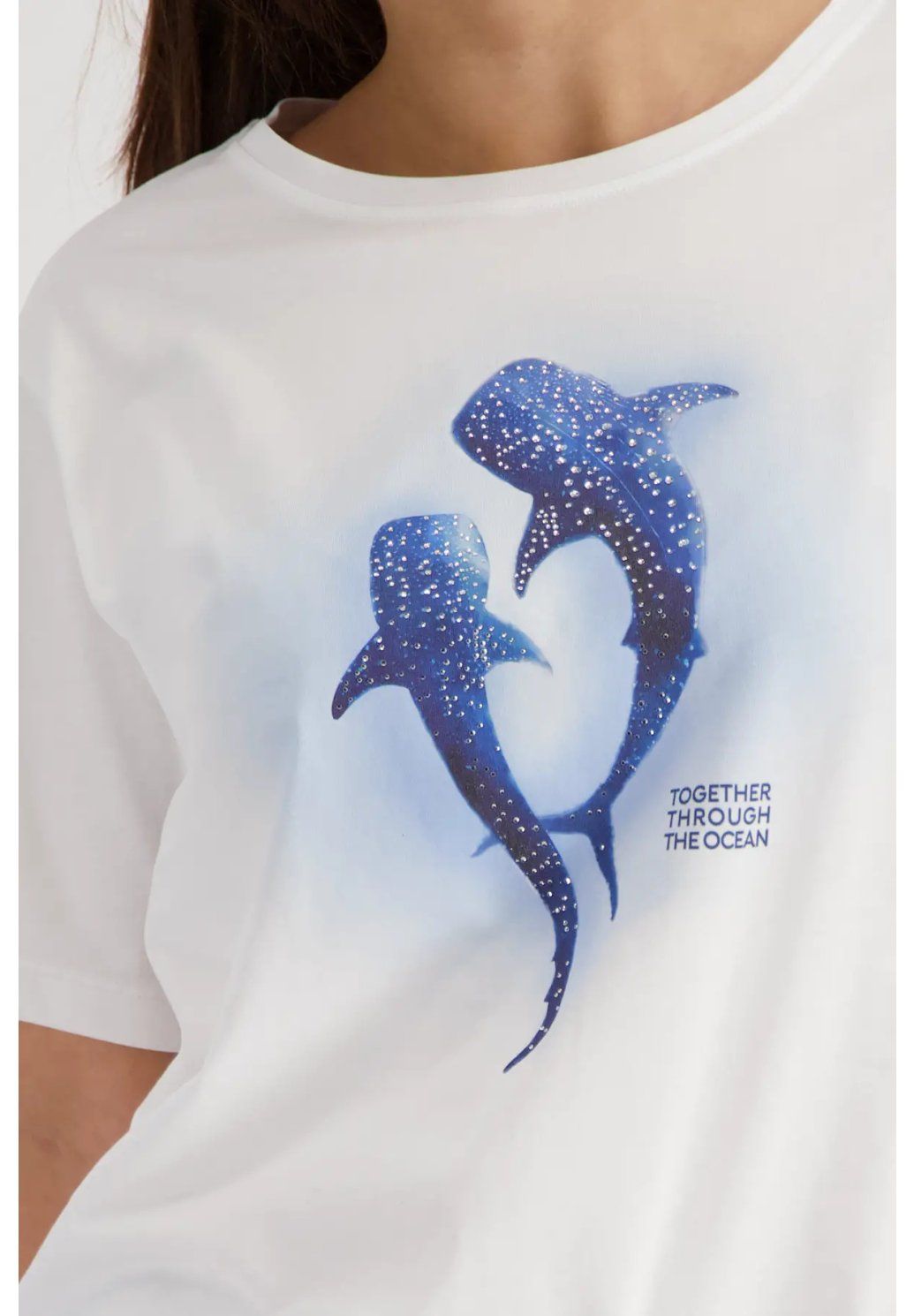 Dámské tričko v bílém provedení zaujme originálním potiskem velrybích žraloků v modrých tónech, který mu dodává svěží a nápaditý vzhled. Klasický střih s krátkým rukávem a kulatým výstřihem zajišťuje pohodlné nošení po celý den, zatímco jemný motiv na přední straně přináší do outfitu hravý a moderní detail. Tričko se skvěle kombinuje s džínami, kraťasy i sukní a je ideální volbou pro volný čas, městské outfity i pohodové letní dny.