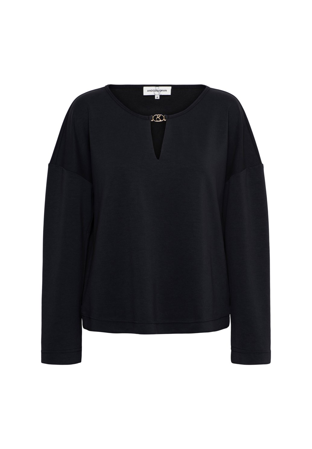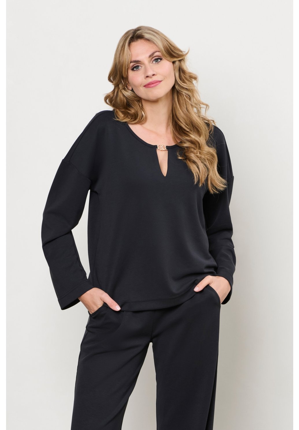 Tento dámský top This &Co Woman je vyroben z krásné a kvalitní Modal tkaniny, která je hebká, příjemná na dotek a elegantně se přizpůsobí postavě. Má kulatý výstřih se stylovou zlatou sponou, dlouhé rukávy a nadčasový střih, díky čemuž je skvělou volbou jak pro každodenní nošení, tak i pro večerní příležitosti, kdy chcete působit žensky a sofistikovaně.