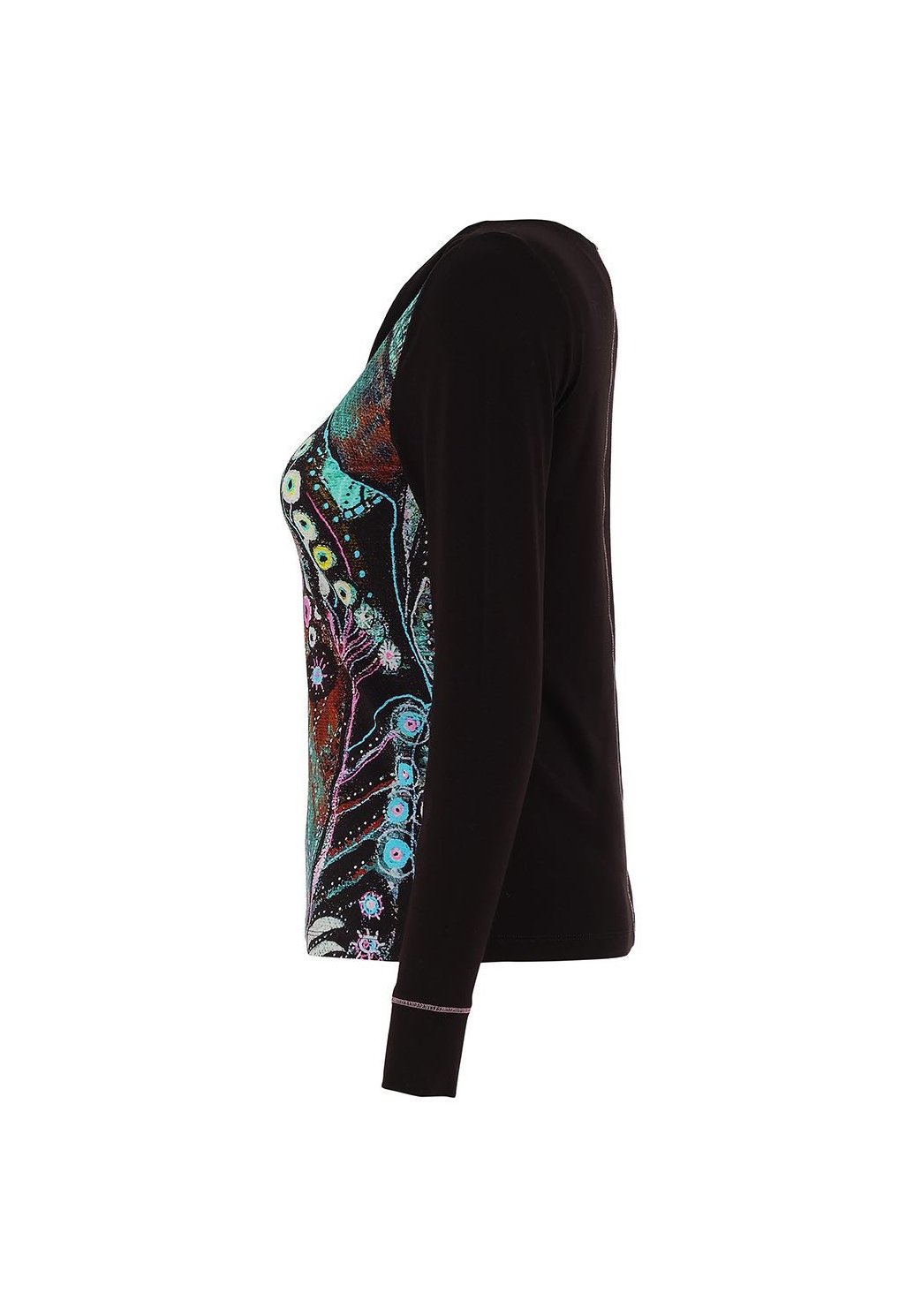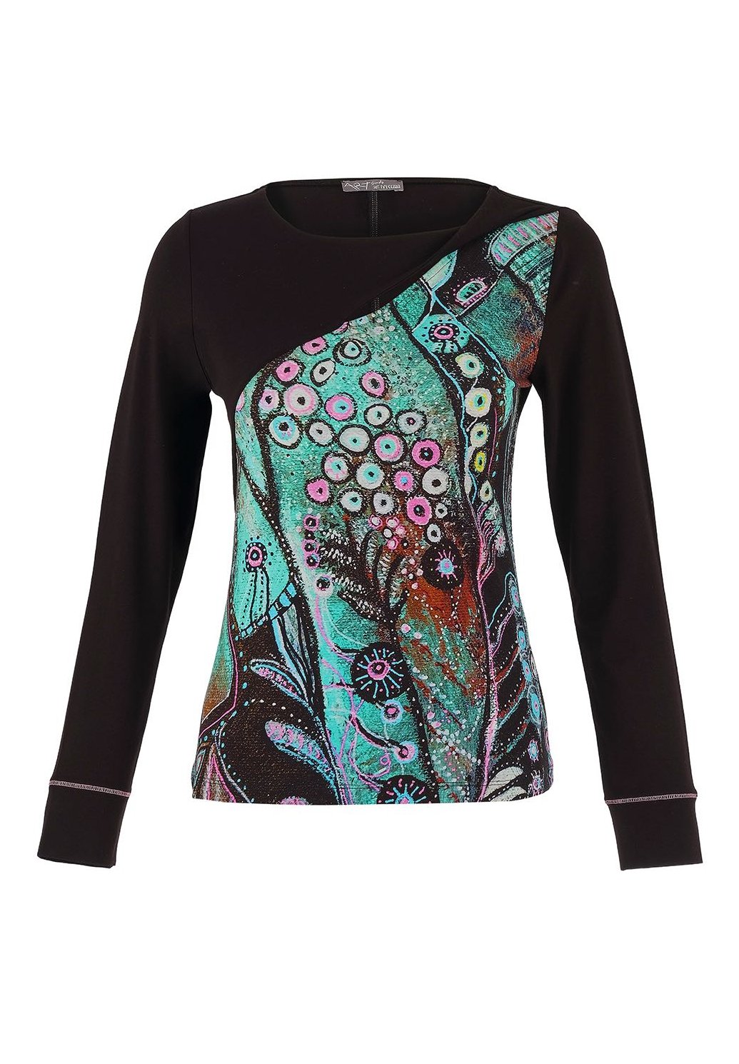 Originální úpletový top v asymetrickém střihu s dekorativním zavinutím látky u výstřihu a kontrastním prošíváním. Motiv je inspirován uměleckým dílem Laurie DeVault (California, USA) v barevné paletě tyrkysově zelené, černé a růžové. Lehký pružný materiál a pohodlný střih lichotí postavě a zajistí celodenní komfort. Dlouhé rukávy z něj dělají ideální volbu pro přechodné období. Pro dokonalý outfit jej můžete zkombinovat s černými kalhotami ze stejné kolekce.