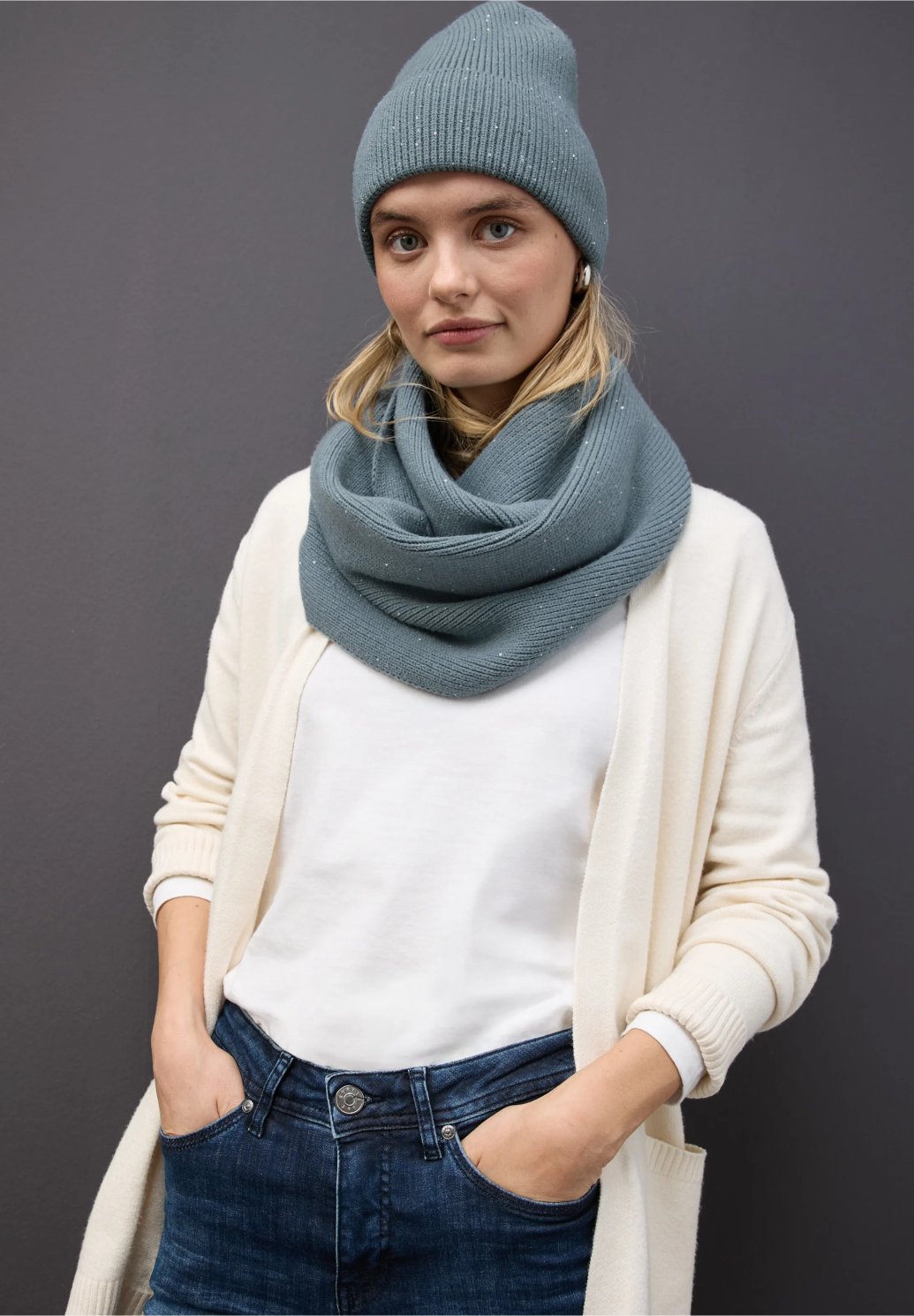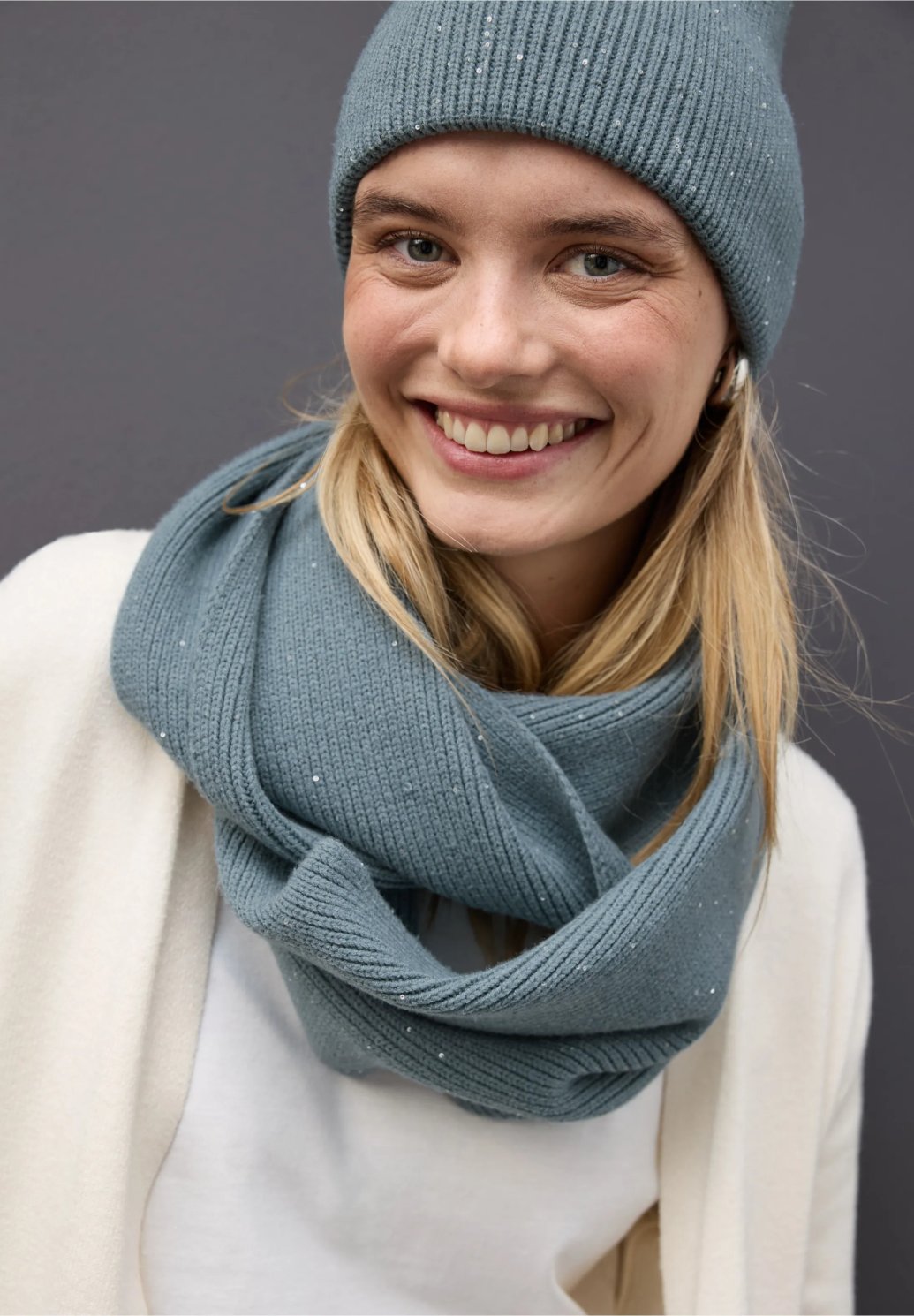 Tato dámská šála s poutkem od Street One zaujme svou jemnou žebrovanou texturou a lesklými flitry, které dodávají třpytivé detaily. Pohodlná tkanina jemně obepíná krk a poskytuje útulné teplo. Elegantní doplněk, který dodá vašemu vzhledu něco speciálního.