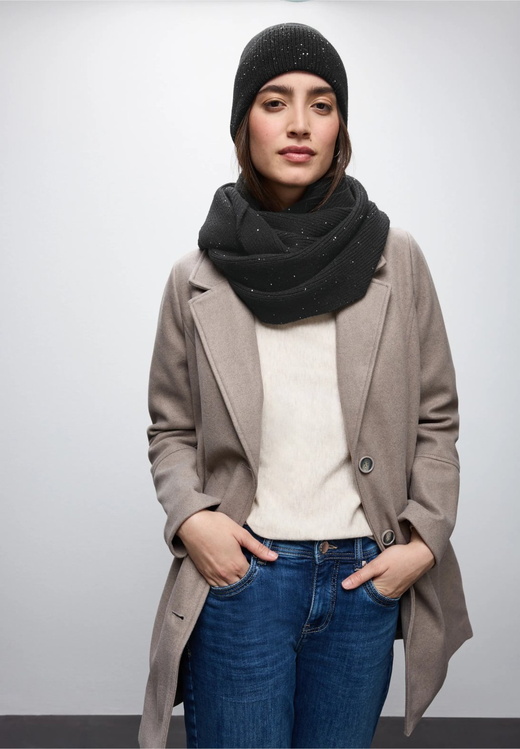 Tato dámská šála s poutkem od Street One zaujme svou jemnou žebrovanou texturou a lesklými flitry, které dodávají třpytivé detaily. Pohodlná tkanina jemně obepíná krk a poskytuje útulné teplo. Elegantní doplněk, který dodá vašemu vzhledu něco speciálního.