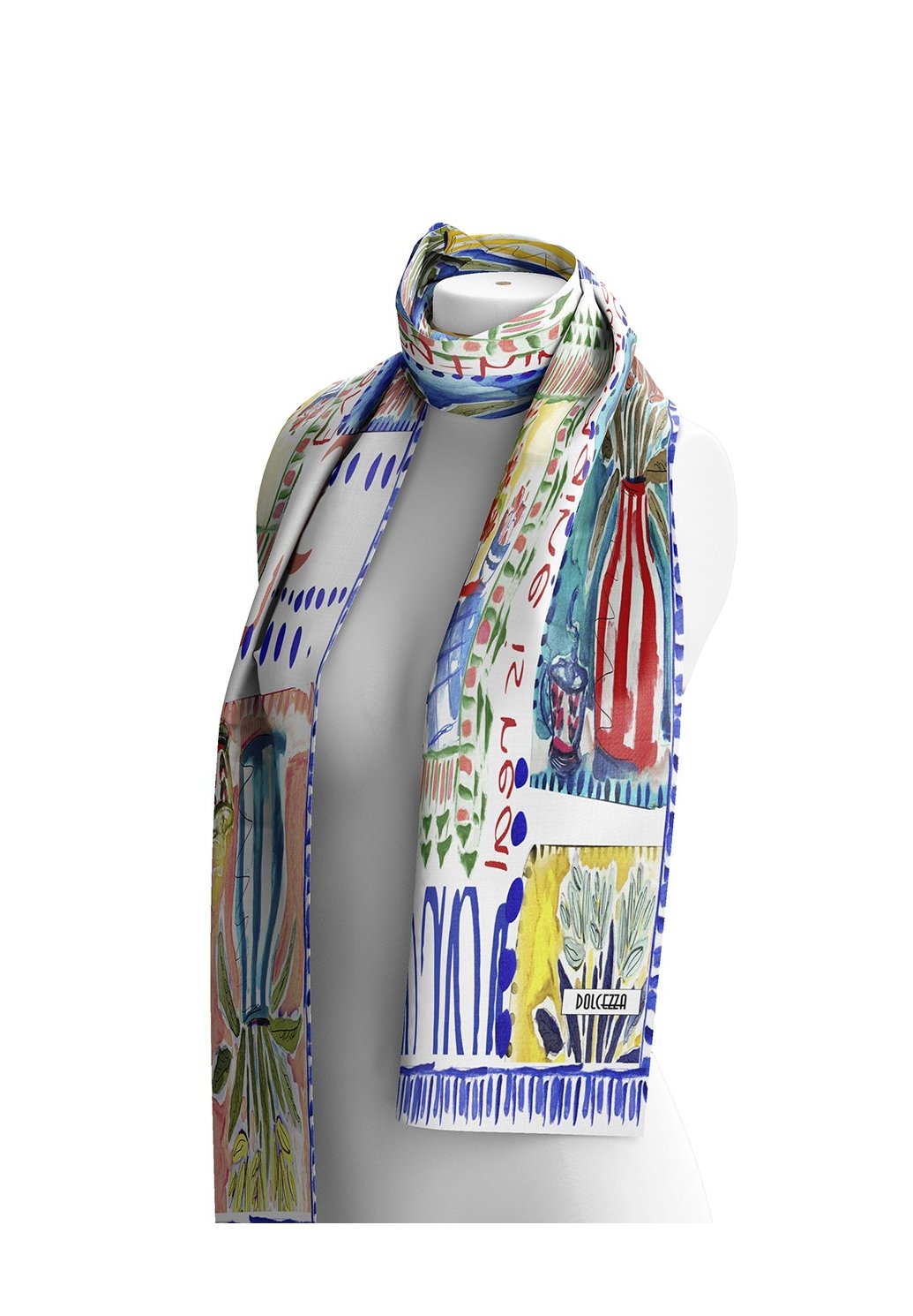 Elegantní šátek s výrazným uměleckým potiskem zaujme kombinací barev a originálních ilustrativních motivů. Lehký a příjemný materiál zajišťuje komfort při nošení po celý den. Díky svému nadčasovému formátu je šátek ideálním doplňkem k jednoduchým outfitům, kterým dodá osobitý a stylový akcent. Vhodný jak pro každodenní nošení, tak pro doladění elegantnějších kombinací.