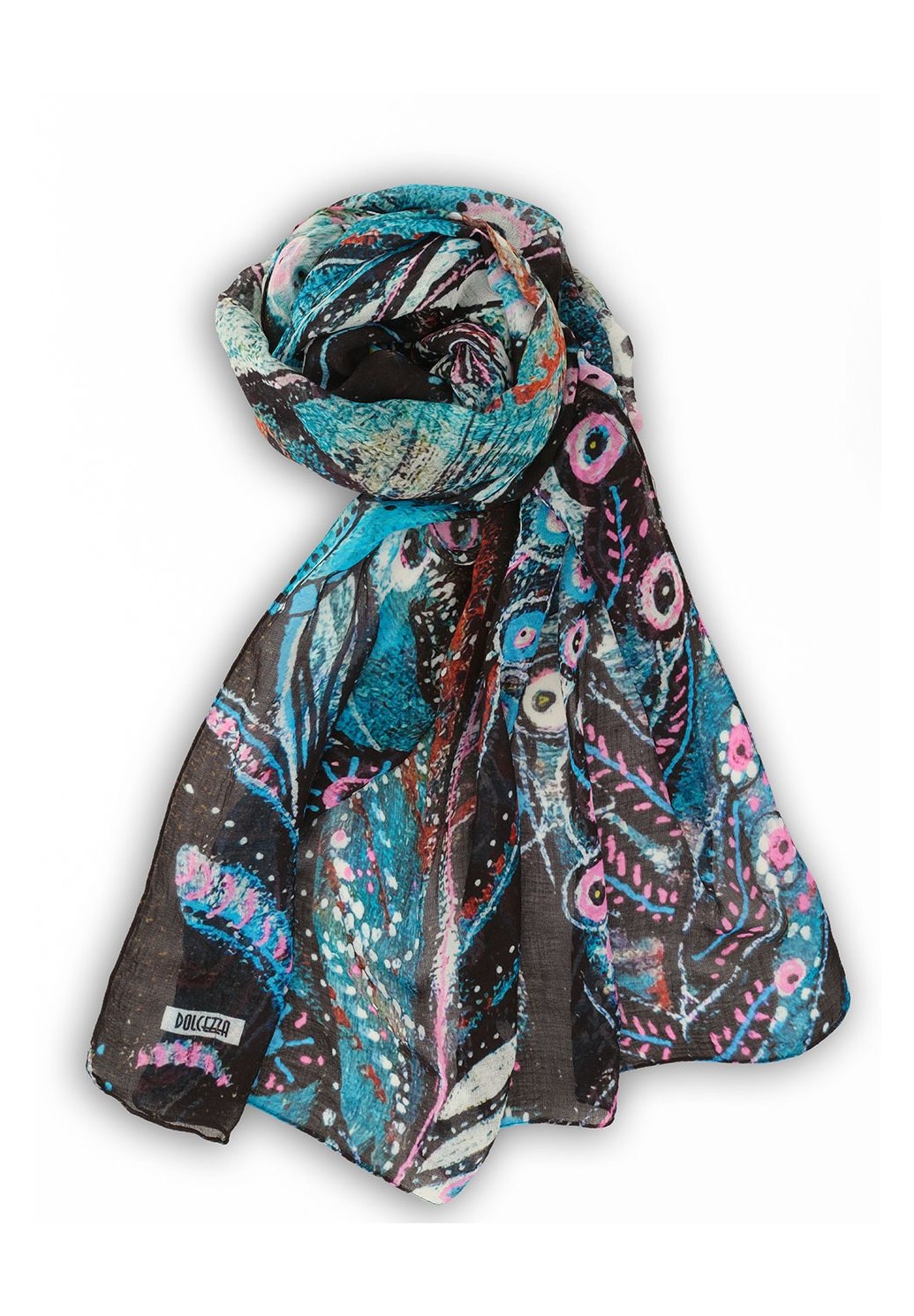 Originální šátek, který okouzlí výrazným uměleckým potiskem v odstínech tyrkysové, černé, růžové a bílé. Kombinace živých barev a abstraktního designu připomíná malířské tahy a dodá každému outfitu nádech kreativity a osobitého stylu. Lehký, prodyšný materiál je příjemný na dotek a snadno se upravuje – ideální doplněk pro každodenní nošení i speciální příležitosti.